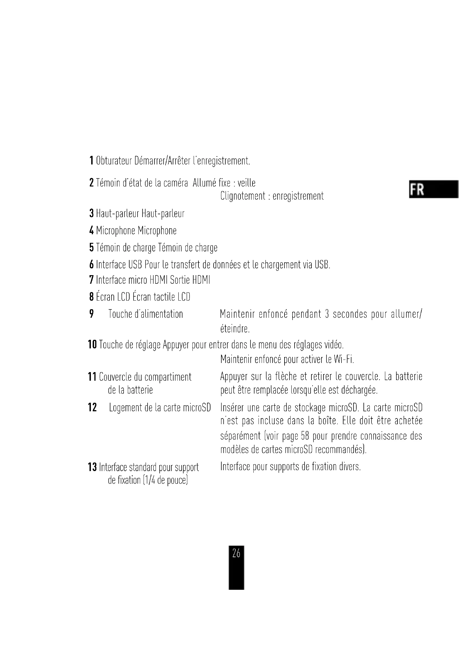 251 Obturateur Démarrer/Arrêter l’enregistrement. 2 Témoin d’état de la caméra Allumé fixe: veille Clignotement: enregistrement 3 Haut-parleur Haut-parleur 4 Microphone Microphone 5 Témoin de charge Témoin de charge 6 InterfaceUSB Pour le transfert de données et le chargement via USB. 7 Interface microHDMI SortieHDMI 8 ÉcranLCD Écran tactileLCD 9 Touche d’alimentation Maintenir enfoncé pendant 3secondes pour allumer/ éteindre. 10 Touche de réglage Appuyer pour entrer dans le menu des réglages vidéo. Maintenir enfoncé pour activer le Wi-Fi. 11 Couvercle du compartiment de la batterie Appuyer sur la flèche et retirer le couvercle. La batterie peut être remplacée lorsqu’elle est déchargée. 12 Logement de la carte microSD Insérer une carte de stockage microSD. La carte microSD n’est pas incluse dans la boîte. Elle doit être achetée séparément (voir page58 pour prendre connaissance des modèles de cartes microSD recommandés). 13 Interface standard pour support de fixation (1/4 de pouce) Interface pour supports de fixation divers. 26Utilisation Étape1 Sortir la caméra. Lors de la première utilisation, sortez la caméra de son boîtier pour pouvoir la recharger et insérer une carte microSD. Insérez la carte microSD dans le logement pour carte microSD. 27Étape2 Charger la caméra.