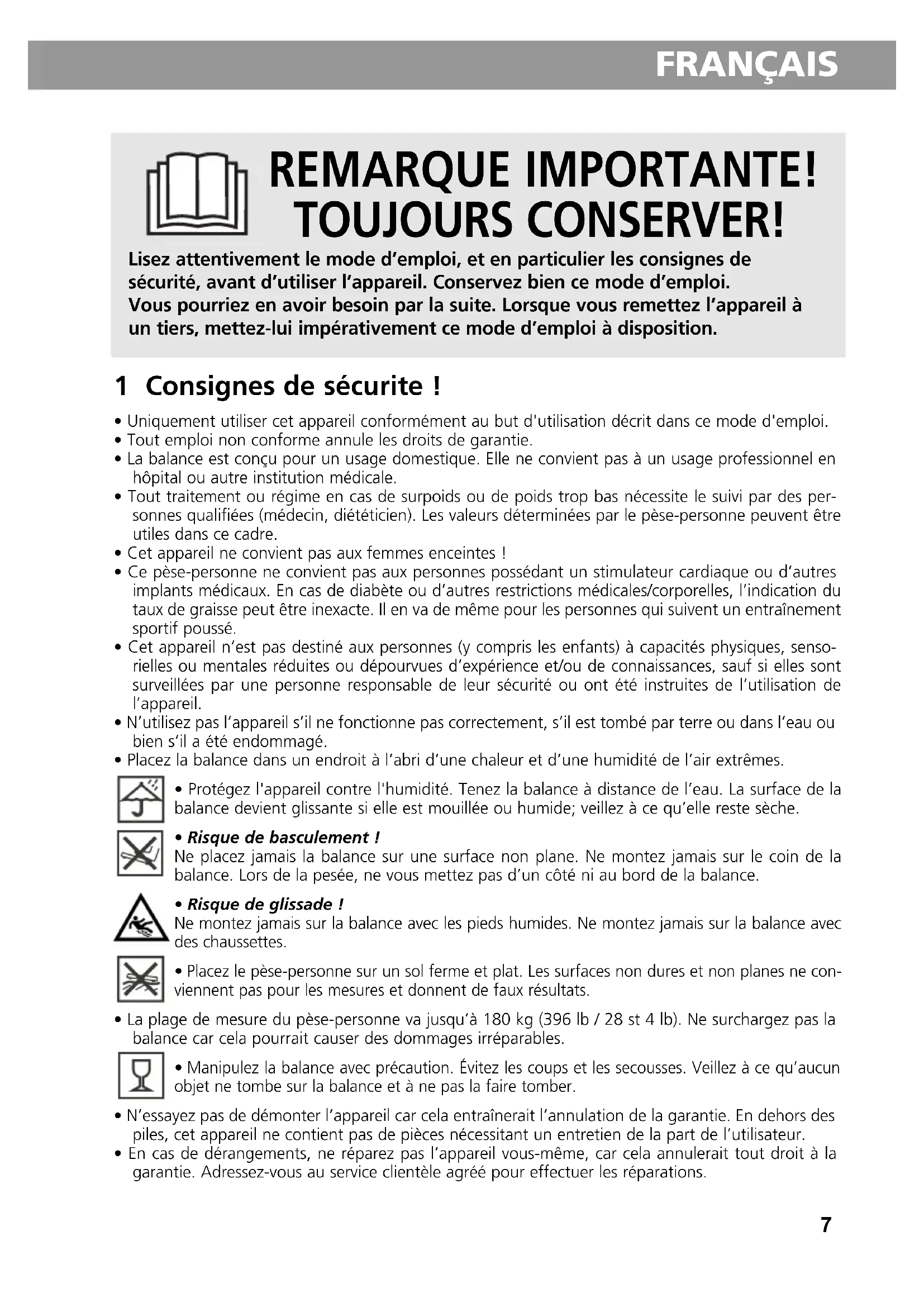 - Uniquement utiliser cet appareil conformément au but d'utilisation décrit dans ce mode d'emploi.• Tout emploi non conforme annule les droits de garantie.• La balance est conçu pour un usage domestique. Elle ne convient pas à un usage professionnel enhôpital ou autre institution médicale.• Tout traitement ou régime en cas de surpoids ou de poids trop bas nécessite le suivi par des per-sonnes qualifiées (médecin, diététicien). Les valeurs déterminées par le pèse-personne peuvent êtreutiles dans ce cadre.• Cet appareil ne convient pas aux femmes enceintes !• Ce pèse-personne ne convient pas aux personnes possédant un stimulateur cardiaque ou d’autresimplants médicaux. En cas de diabète ou d’autres restrictions médicales/corporelles, l’indication dutaux de graisse peut être inexacte. Il en va de même pour les personnes qui suivent un entraînementsportif poussé.• Cet appareil n’est pas destiné aux personnes (y compris les enfants) à capacités physiques, senso-rielles ou mentales réduites ou dépourvues d’expérience et/ou de connaissances, sauf si elles sontsurveillées par une personne responsable de leur sécurité ou ont été instruites de l’utilisation del’appareil.• N’utilisez pas l’appareil s’il ne fonctionne pas correctement, s’il est tombé par terre ou dans l’eau oubien s’il a été endommagé.• Placez la balance dans un endroit à l’abri d’une chaleur et d’une humidité de l’air extrêmes.