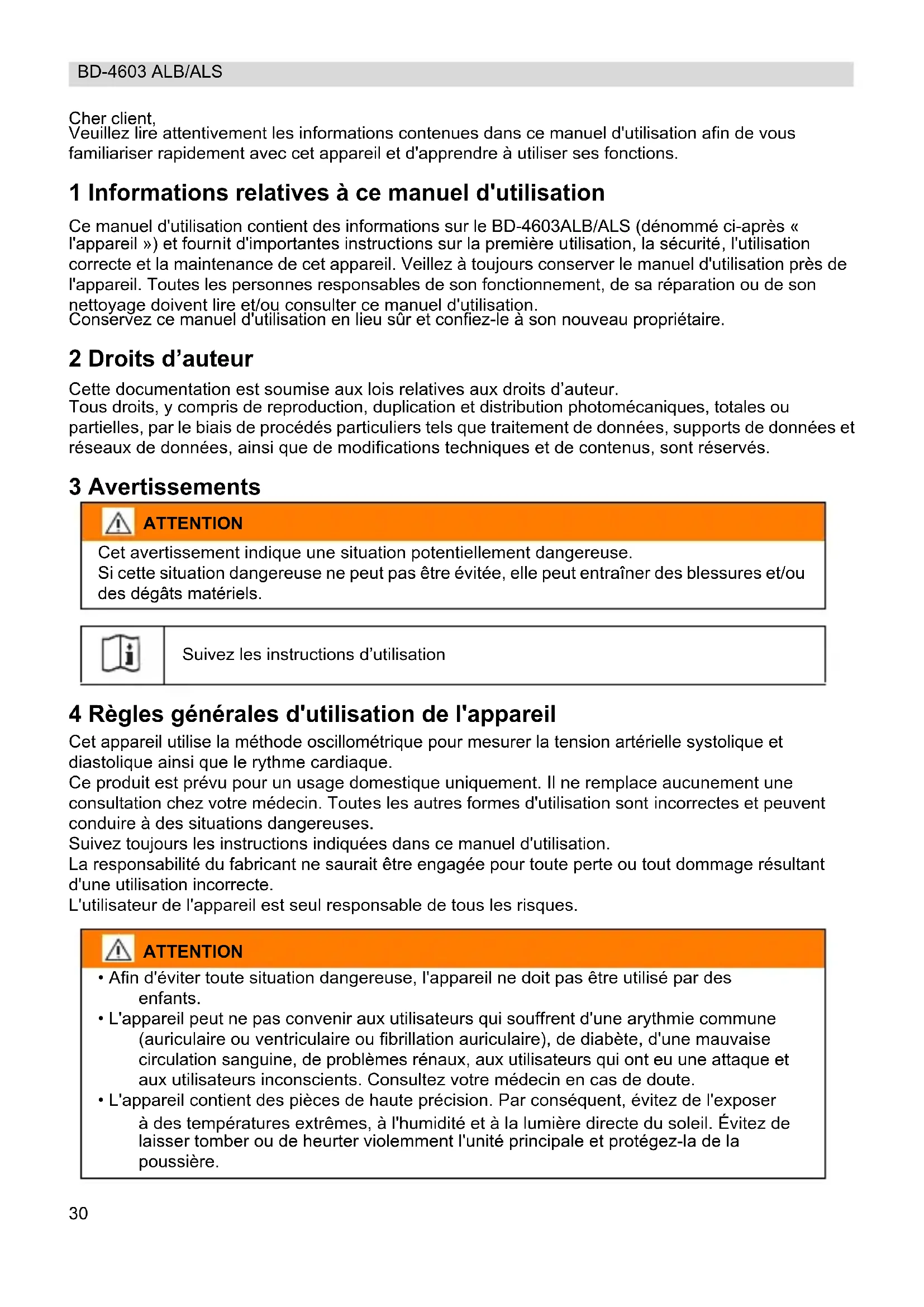 Cher client, Veuillez lire attentivement les informations contenues dans ce manuel d'utilisation afin de vous familiariser rapidement avec cet appareil et d'apprendre à utiliser ses fonctions. 1 Informations relatives à ce manuel d'utilisation Ce manuel d'utilisation contient des informations sur le BD-4603ALB/ALS (dénommé ci-après « l'appareil ») et fournit d'importantes instructions sur la première utilisation, la sécurité, l'utilisation correcte et la maintenance de cet appareil. Veillez à toujours conserver le manuel d'utilisation près de l'appareil. Toutes les personnes responsables de son fonctionnement, de sa réparation ou de son nettoyage doivent lire et/ou consulter ce manuel d'utilisation. Conservez ce manuel d'utilisation en lieu sûr et confiez-le à son nouveau propriétaire. 2 Droits d’auteur Cette documentation est soumise aux lois relatives aux droits d’auteur. Tous droits, y compris de reproduction, duplication et distribution photomécaniques, totales ou partielles, par le biais de procédés particuliers tels que traitement de données, supports de données et réseaux de données, ainsi que de modifications techniques et de contenus, sont réservés. 3 Avertissements 4 Règles générales d'utilisation de l'appareil Cet appareil utilise la méthode oscillométrique pour mesurer la tension artérielle systolique et diastolique ainsi que le rythme cardiaque. Ce produit est prévu pour un usage domestique uniquement. Il ne remplace aucunement une consultation chez votre médecin. Toutes les autres formes d'utilisation sont incorrectes et peuvent conduire à des situations dangereuses. Suivez toujours les instructions indiquées dans ce manuel d'utilisation. La responsabilité du fabricant ne saurait être engagée pour toute perte ou tout dommage résultant d'une utilisation incorrecte. L'utilisateur de l'appareil est seul responsable de tous les risques. ATTENTION Cet avertissement indique une situation potentiellement dangereuse. Si cette situation dangereuse ne peut pas être évitée, elle peut entraîner des blessures et/ou des dégâts matériels. Suivez les instructions d’utilisation ATTENTION