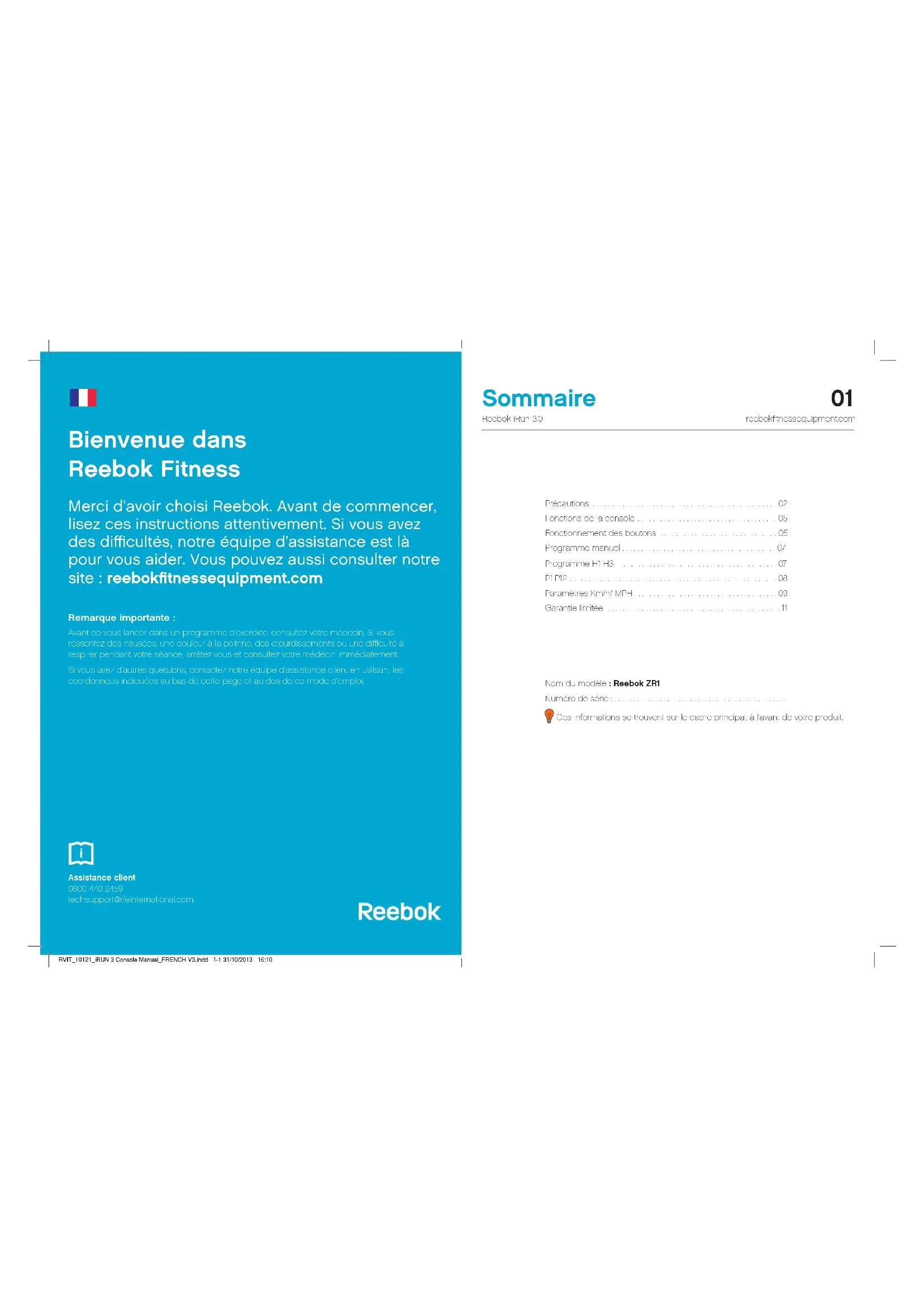 techsupport@rfeinternational.com Remarque importante : Avant de vous lancer dans un programme d’exercice, consultez votre médecin. Si vous ressentez des nausées, une douleur à la poitrine, des étourdissements ou une difficulté à respirer pendant votre séance, arrêtez-vous et consultez votre médecin immédiatement. Si vous avez d’autres questions, contactez notre équipe d’assistance client en utilisant les coordonnées indiquées au bas de cette page et au dos de ce mode d’emploi. RVIT_10121_iRUN 3 Console Manual_FRENCH V3.indd 1-1 31/10/2013 16:10Reebok iRun 3.0 Reebok iRun 3.0