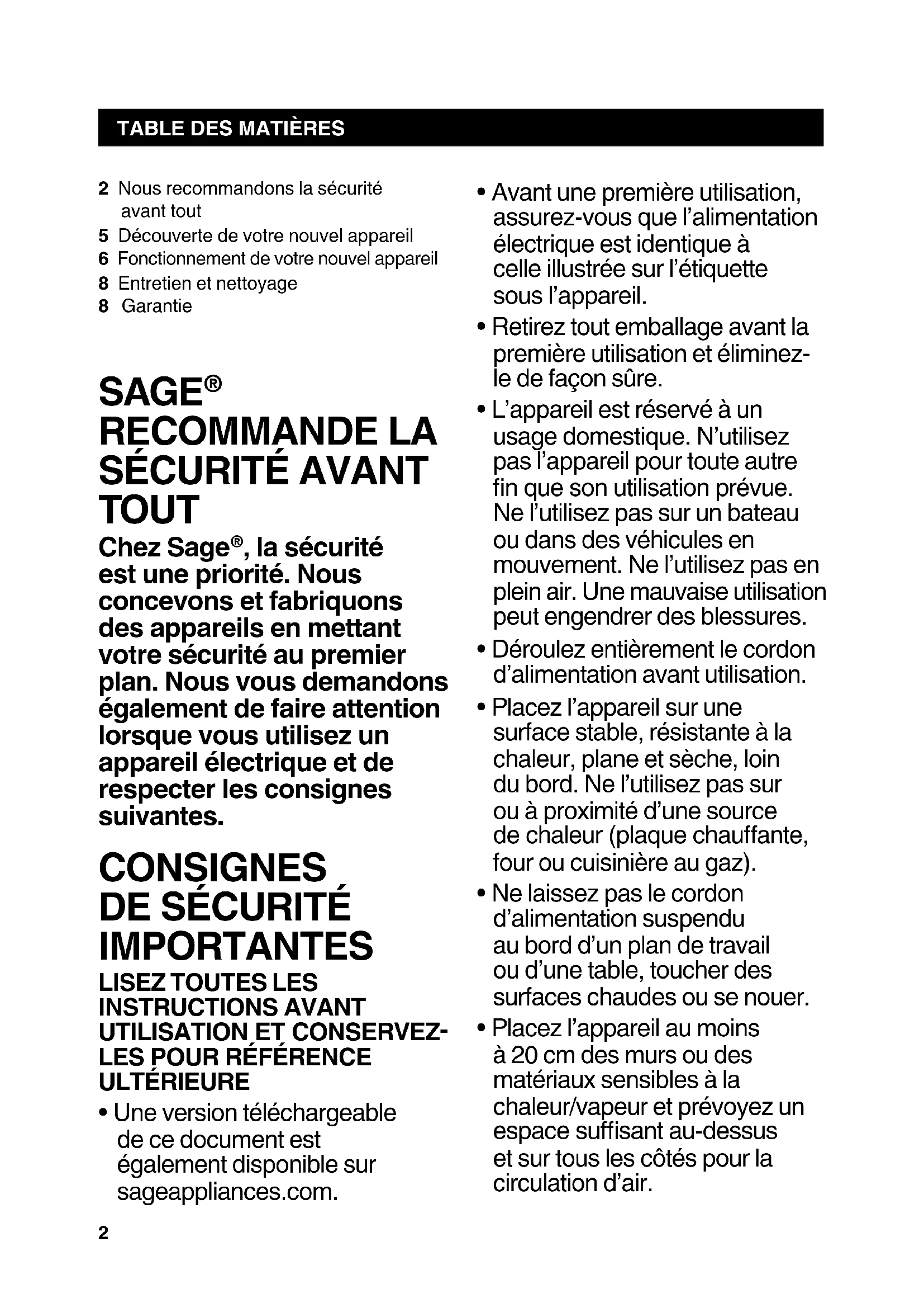 - Une version téléchargeable de ce document est également disponible sur sageappliances.com. 2 Nous recommandons la sécurité avant tout5 Découverte de votre nouvel appareil6 Fonctionnement de votre nouvel appareil8 Entretien et nettoyage8 Garantie3