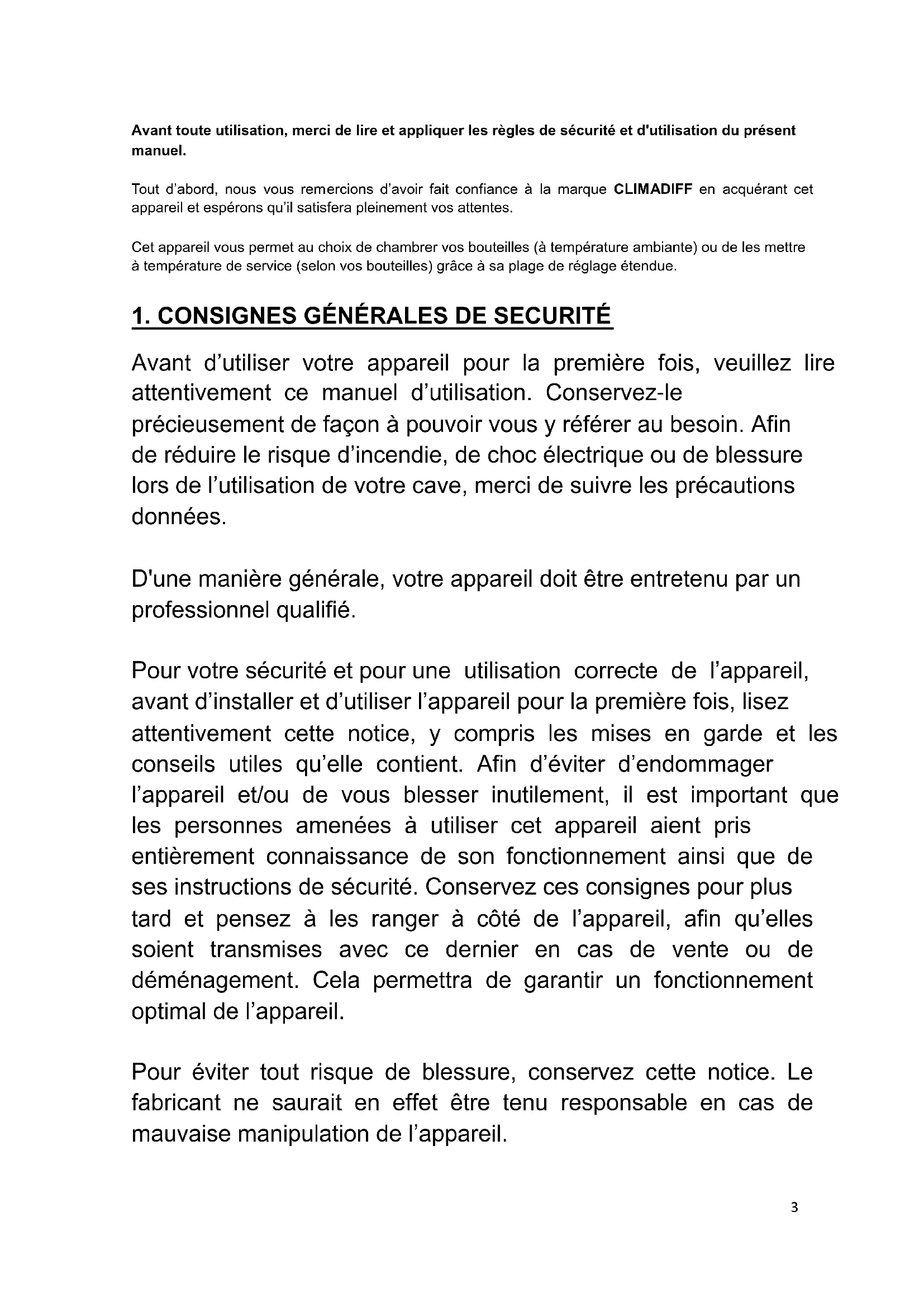 Avant toute utilisation, merci de lire et appliquer les règles de sécurité et d'utilisation du présent manuel. Tout d’abord, nous vous remercions d’avoir fait confiance à la marque CLIMADIFF en acquérant cet appareil et espérons qu’il satisfera pleinement vos attentes. Cet appareil vous permet au choix de chambrer vos bouteilles (à température ambiante) ou de les mettre à température de service (selon vos bouteilles) grâce à sa plage de réglage étendue.