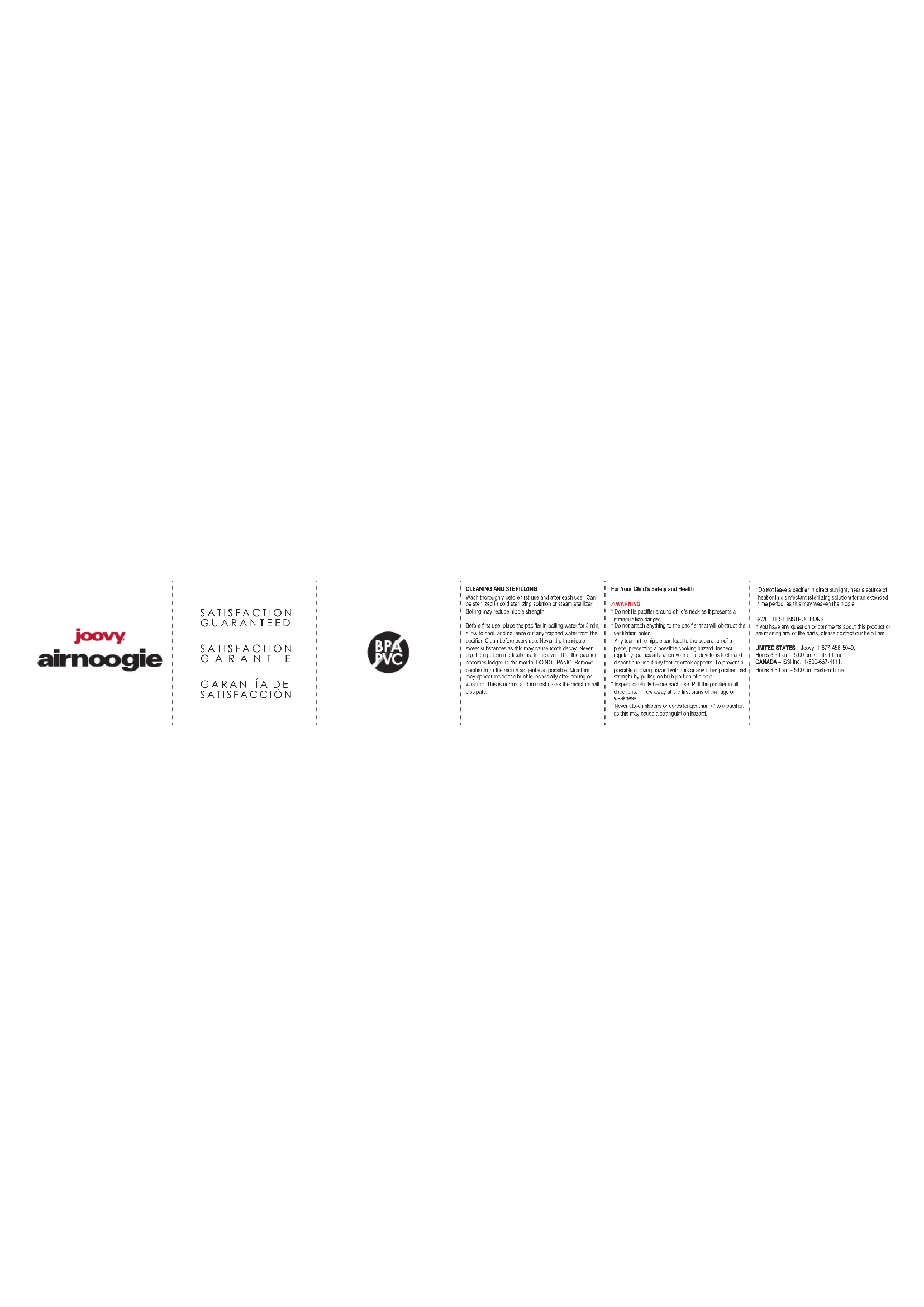 If you have any question or comments about this product or are missing any of the parts, please contact our help line: UNITED STATES – Joovy: 1-877-456-5049, Hours 8:30 am – 5:00 pm Central Time CANADA – ISSI Inc.: 1-800-667-4111, Hours 8:30 am – 5:00 pm Eastern TimeNETTOYAGE ET STÉRILISATION Laver le produit en profondeur avant la première utilisation et entre chaque utilisation subséquente. Peut aller dans une solution de stérilisation à froid ou dans un stérilisateur à vapeur. L’eau bouillante peut fragiliser la tétine. Avant la première utilisation, mettre la sucette dans l’eau bouillante pendant cinq minutes, puis la laisser refroidir. Presser la sucette pour en extraire toute eau résiduelle. Nettoyer la sucette avant chaque utilisation. Ne jamais tremper la tétine dans les substances sucrées, car celles-ci peuvent causer des caries. Ne jamais tremper la tétine dans un médicament. Si la sucette reste coincée dans la bouche de l’enfant, NE PAS PANIQUER. Enlever la sucette le plus délicatement possible. L'humidité peut apparaître à l'intérieur de la bulle, en particulier après l'ébullition ou le lavage. Ceci est normal et dans la plupart des cas, l'humidité se dissipe. Pour La Santé et La Sécurité de l’Enfant