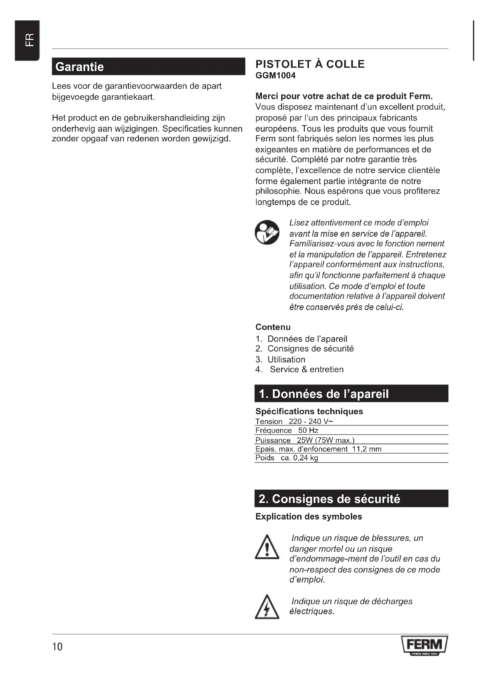 Garantie Lees voor de garantievoorwaarden de apart bijgevoegde garantiekaart. Het product en de gebruikershandleiding zijn onderhevig aan wijzigingen. Specificaties kunnen zonder opgaaf van redenen worden gewijzigd. PISTOLET À COLLE GGM1004 Merci pour votre achat de ce produit Ferm. Vous disposez maintenant d’un excellent produit, proposé par l’un des principaux fabricants européens. Tous les produits que vous fournit Ferm sont fabriqués selon les normes les plus exigeantes en matière de performances et de sécurité. Complété par notre garantie très complète, l’excellence de notre service clientèle forme également partie intégrante de notre philosophie. Nous espérons que vous profiterez longtemps de ce produit. Lisez attentivement ce mode d’emploi avant la mise en service de l’appareil. Familiarisez-vous avec le fonction nement et la manipulation de l’appareil. Entretenez l’appareil conformément aux instructions, afin qu’il fonctionne parfaitement à chaque utilisation. Ce mode d’emploi et toute documentation relative à l’appareil doivent être conservés près de celui-ci. Contenu
