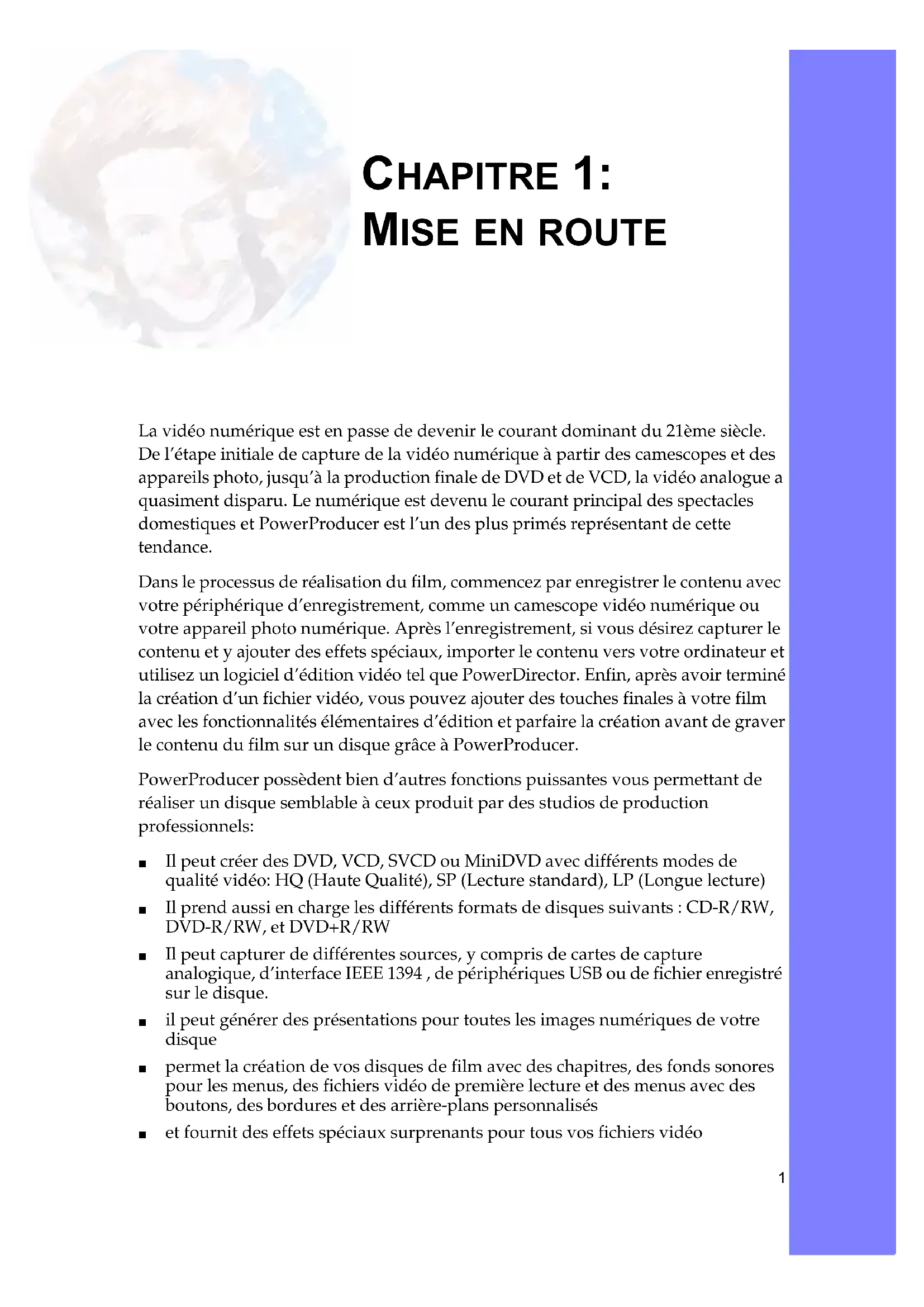 ROUTE La vidéo numérique est en passe de devenir le courant dominant du 21ème siècle. De l’étape initiale de capture de la vidéo numérique à partir des camescopes et des appareils photo, jusqu’à la production finale de DVD et de VCD, la vidéo analogue a quasiment disparu. Le numérique est devenu le courant principal des spectacles domestiques et PowerProducer est l’un des plus primés représentant de cette tendance. Dans le processus de réalisation du film, commencez par enregistrer le contenu avec votre périphérique d’enregistrement, comme un camescope vidéo numérique ou votre appareil photo numérique. Après l’enregistrement, si vous désirez capturer le contenu et y ajouter des effets spéciaux, importer le contenu vers votre ordinateur et utilisez un logiciel d’édition vidéo tel que PowerDirector. Enfin, après avoir terminé la création d’un fichier vidéo, vous pouvez ajouter des touches finales à votre film avec les fonctionnalités élémentaires d’édition et parfaire la création avant de graver le contenu du film sur un disque grâce à PowerProducer. PowerProducer possèdent bien d’autres fonctions puissantes vous permettant de réaliser un disque semblable à ceux produit par des studios de production professionnels: