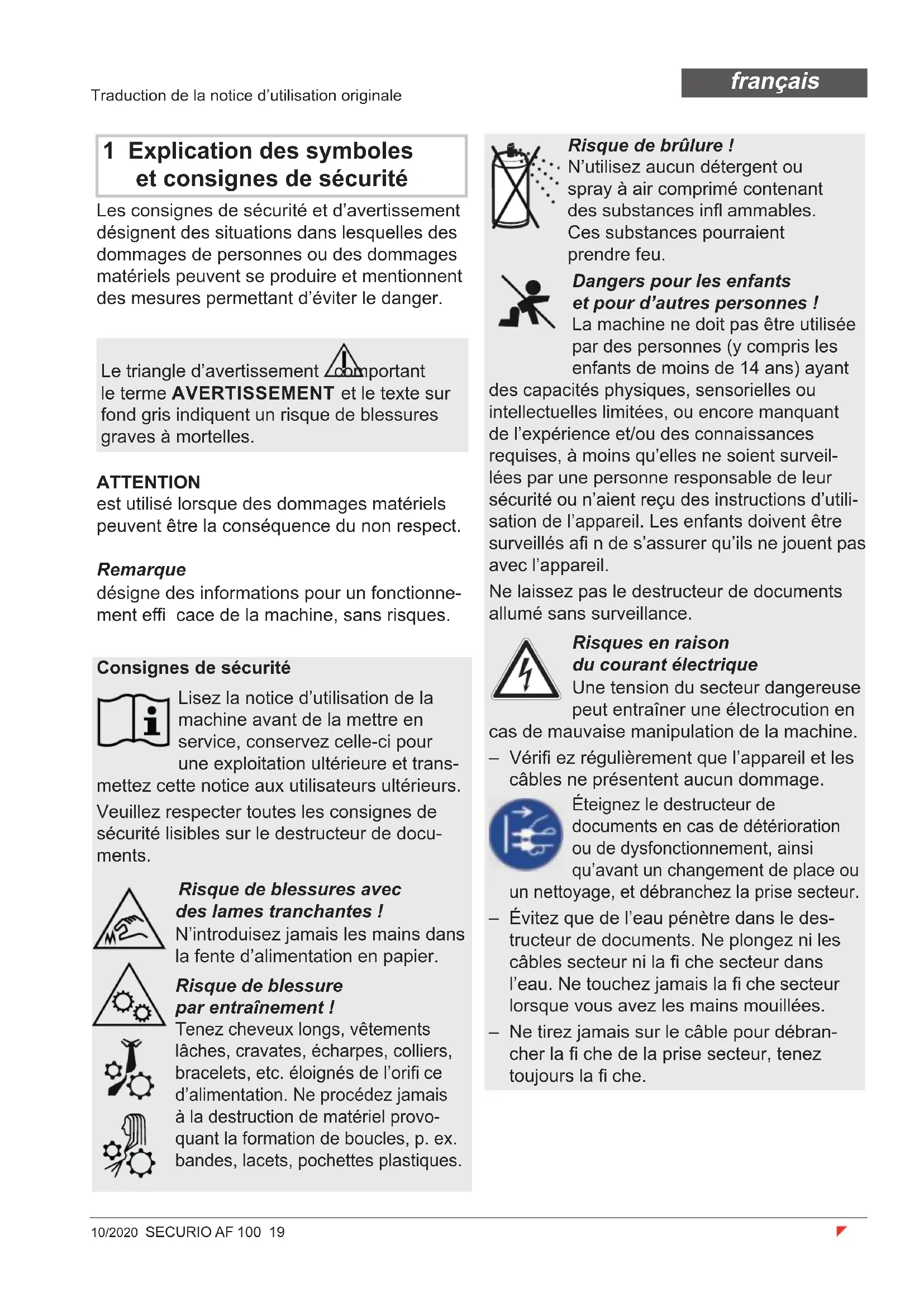 6–7 5–6 Weight 7.6 kg Intake width 225 mm Cutting speed 45 mm/s Power supply 220-240 V / 50/60 Hz 110-130 V / 50/60 Hz Output with max. number of sheets 185 W (EU) / 160 W (US) Energy consumption in standby mode < 2 Wh Operating time for max. number of sheets up to 15 min Operating time for single sheet up to 20 min Operating ambient conditions: Temperature relative humidity height above SL -10 °C up to +25 °C max. 90%, non-condensing max. 2,000 m Size W x D x H (mm) 375 x 260 x 620 Shredded material container volume 25 l Emission sound pressure level (idle running / under load) 55-60 dB / 65 -70 dB A-weighted sound power level (LWAd in idle mode) 71 dB10/2020 SECURIO AF 100 19 français Traduction de la notice d’utilisation originale 1 Explication des symboles et consignes de sécurité Les consignes de sécurité et d’avertissement désignent des situations dans lesquelles des dommages de personnes ou des dommages matériels peuvent se produire et mentionnent des mesures permettant d’éviter le danger. Remarque désigne des informations pour un fonctionne- ment effi cace de la machine, sans risques. Le triangle d’avertissement comportant le terme AVERTISSEMENT et le texte sur fond gris indiquent un risque de blessures graves à mortelles. ATTENTION est utilisé lorsque des dommages matériels peuvent être la conséquence du non respect. Consignes de sécurité Lisez la notice d’utilisation de la machine avant de la mettre en service, conservez celle-ci pour une exploitation ultérieure et trans- mettez cette notice aux utilisateurs ultérieurs. Veuillez respecter toutes les consignes de sécurité lisibles sur le destructeur de docu- ments. Risque de blessures avec des lames tranchantes ! N’introduisez jamais les mains dans la fente d’alimentation en papier. Risque de blessure par entraînement !