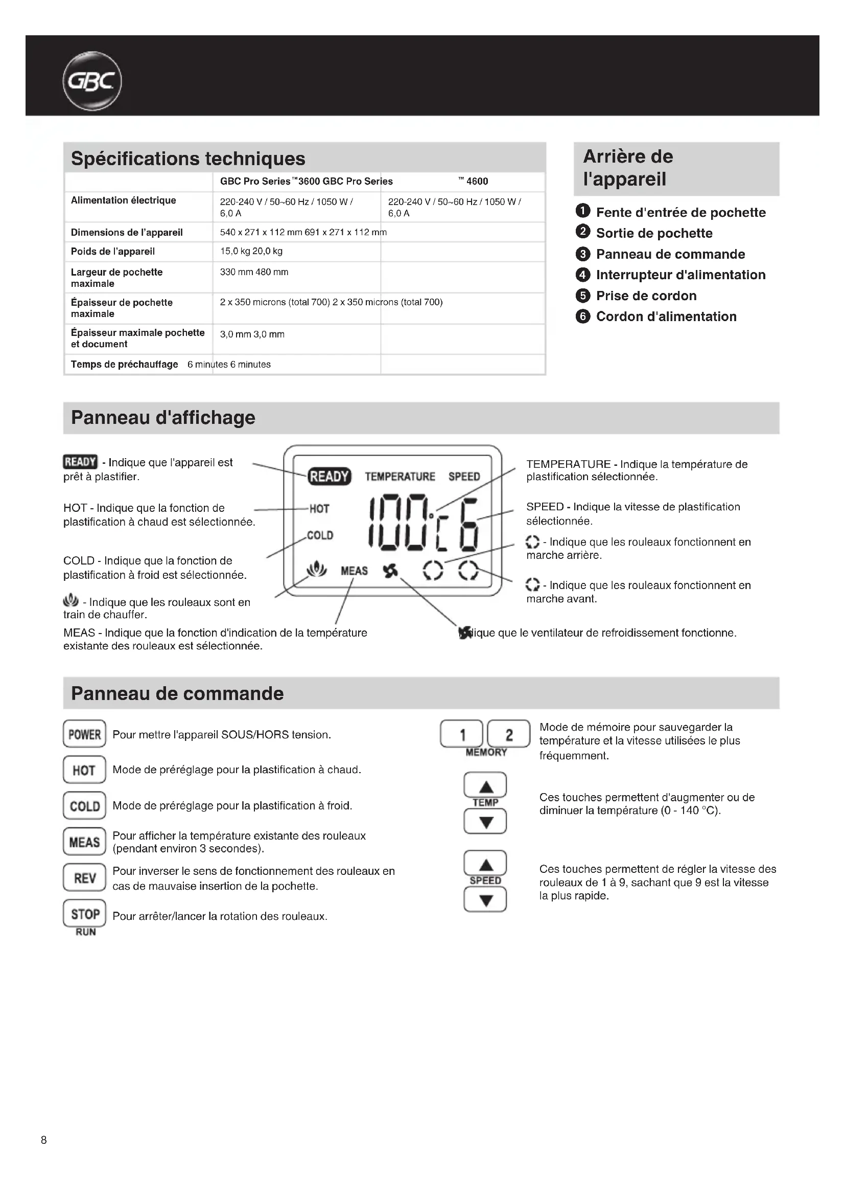 - Ne coupez pas les pochettes avant la plastication. Guidedeplastication Typedesupport Épaisseurdulm Réglage avec transporteur Réglage sans transporteur Température Vitesse Température Vitesse Papier imprimante 75-100 microns 100 °C 6 130 °C 4 125-150 microns 120 °C 4 130 °C 3 175-250 microns 120 °C 3 140 °C 2 300-350 microns 130 °C 2 - - Papier brochure 75-100 microns 100 °C 5 130 °C 4 125-150 microns 120 °C 3 140 °C 3 175-250 microns 130 °C 2 140 °C 2 300-350 microns 140 °C 2 - - Papier photographique 75-100 microns 100 °C 4 130 °C 3 125-150 microns 130 °C 3 140 °C 2 175-250 microns 140 °C 2 140 °C 1 REMARQUE : Pour laisser l'appareil en mode de veille, maintenez la température à 70 °C et la vitesse à 2. Garantie Le fonctionnement de cet appareil est garanti pendant 1 ans à partir de la date d’achat, sous réserve d’un usage normal. Pendant la période de garantie, ACCO Brands Europe décidera, à son gré, de réparer ou de remplacer gratuitement l'appareil défectueux. Les défauts dus à un usage abusif ou un usage à des ns non appropriées ne sont pas couverts par cette garantie. Une preuve de la date d’achat sera exigée. Les réparations ou modications eectuées par des personnes non autorisées par ACCO Brands Europe annuleront la garantie. Notre objectif est d’assurer le bon fonctionnement de nos produits conformément aux spécications précisées. Cette garantie ne compromet pas les droits légaux des consommateurs au titre de la législation nationale en vigueur régissant la vente des biens de consommation. En cas de défaillance technique de votre produit pendant la période de garantie, veuillez contacter votre centre de service client ACCO. Nous organiserons une visite de dépannage par un technicien ou bien nous vous demanderons de retourner l’appareil à ACCO en fonction du diagnostic et du type de modèle. Si vous retournez l’appareil, ACCO pourra à son gré, conformément à la loi, soit (i) réparer l’appareil en utilisant des pièces neuves ou remises à neuf, soit (ii) remplacer l’appareil par un appareil neuf ou remis à neuf équivalant à l’appareil défectueux. Enregistrez ce produit en ligne à www.accobrands.com12 Technische Daten GBC Pro Series