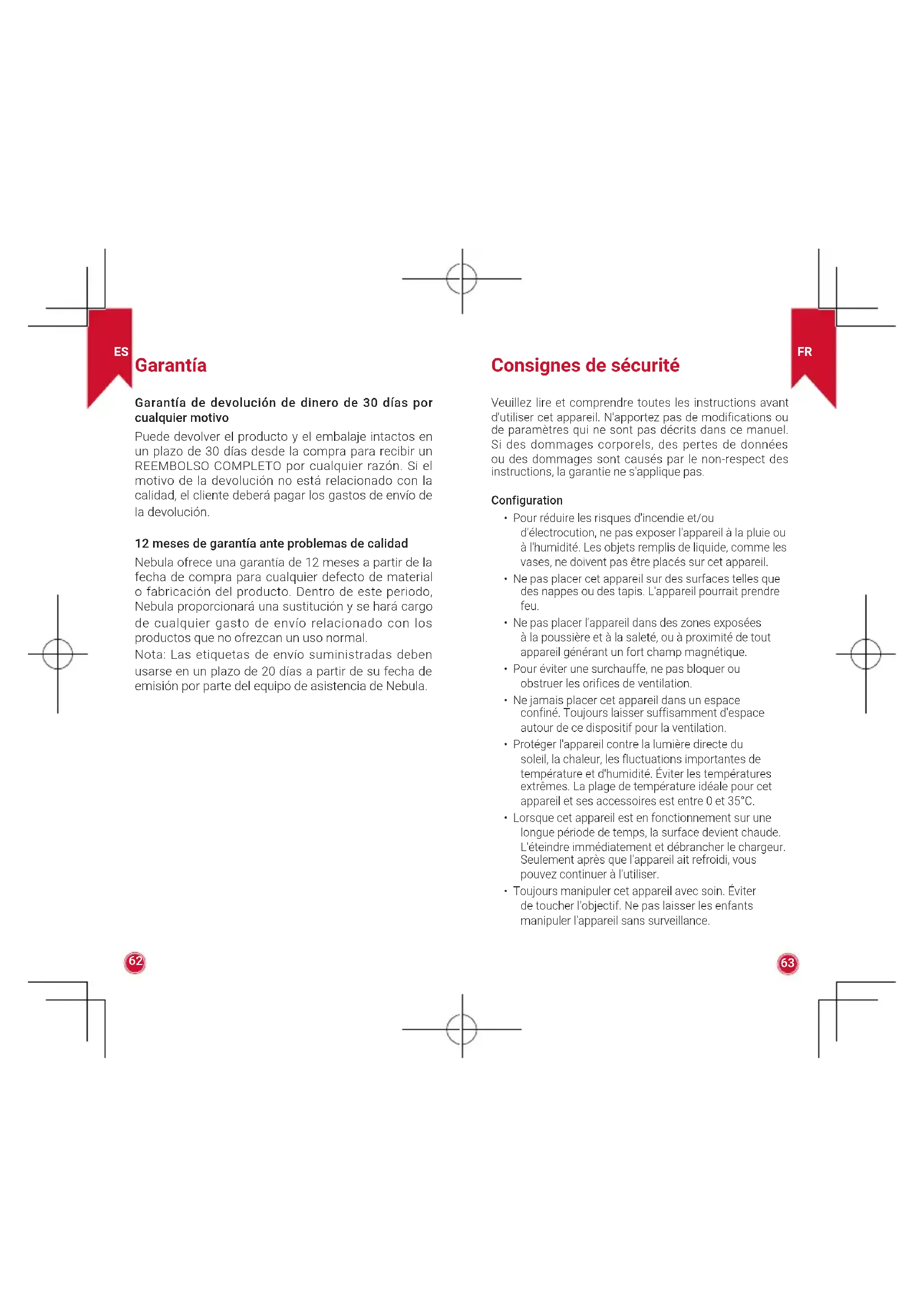Garantie Garantie de remboursement sous 30 jours pour toute raison Vous pouvez retourner votre produit en bon état et dans son emballage dans les 30 jours suivant l'achat pour recevoir un remboursement complet pour quelque raison que ce soit. Si le motif de retour n'est pas lié à la qualité, le client doit payer les frais d'expédition de retour. Garantie de 12 mois de garantie pour des problèmes liés à la qualité Les produits de Nebula sont garantis contre tout défauts matériels et de fabrication pendant 12 mois à compter de la date d'achat. Au cours de cette période, Nebula couvrira le remplacement et les frais d'expédition de retour pour les produits qui s'avéreraient défectueux lors de leur utilisation normale. Veuillez remarquer : Les étiquettes d'expédition fournies doivent être utilisées dans les 20 jours suivant la date à laquelle elles ont été envoyées par l'assistance de Nebula. Informazioni sulla sicurezza Leggere e comprendere tutte le istruzioni fornite in questo manuale prima di utilizzare il dispositivo. Non apportare modifiche o effettuare impostazioni non descritte in questo manuale. La garanzia non si applica in caso di lesioni fisiche, perdita di dati o danni causati dal mancato rispetto delle istruzioni. Configurazione