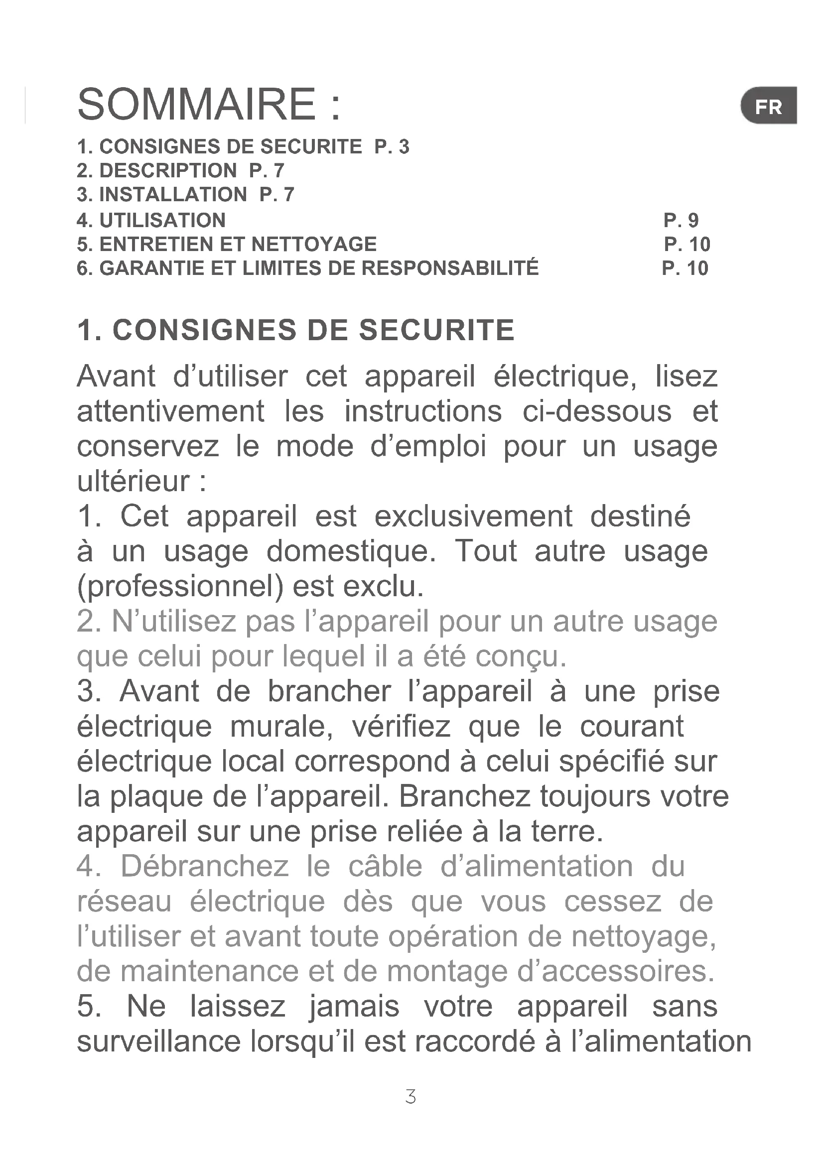 Avant d’utiliser cet appareil électrique, lisez attentivement les instructions ci-dessous et conservez le mode d’emploi pour un usage ultérieur :