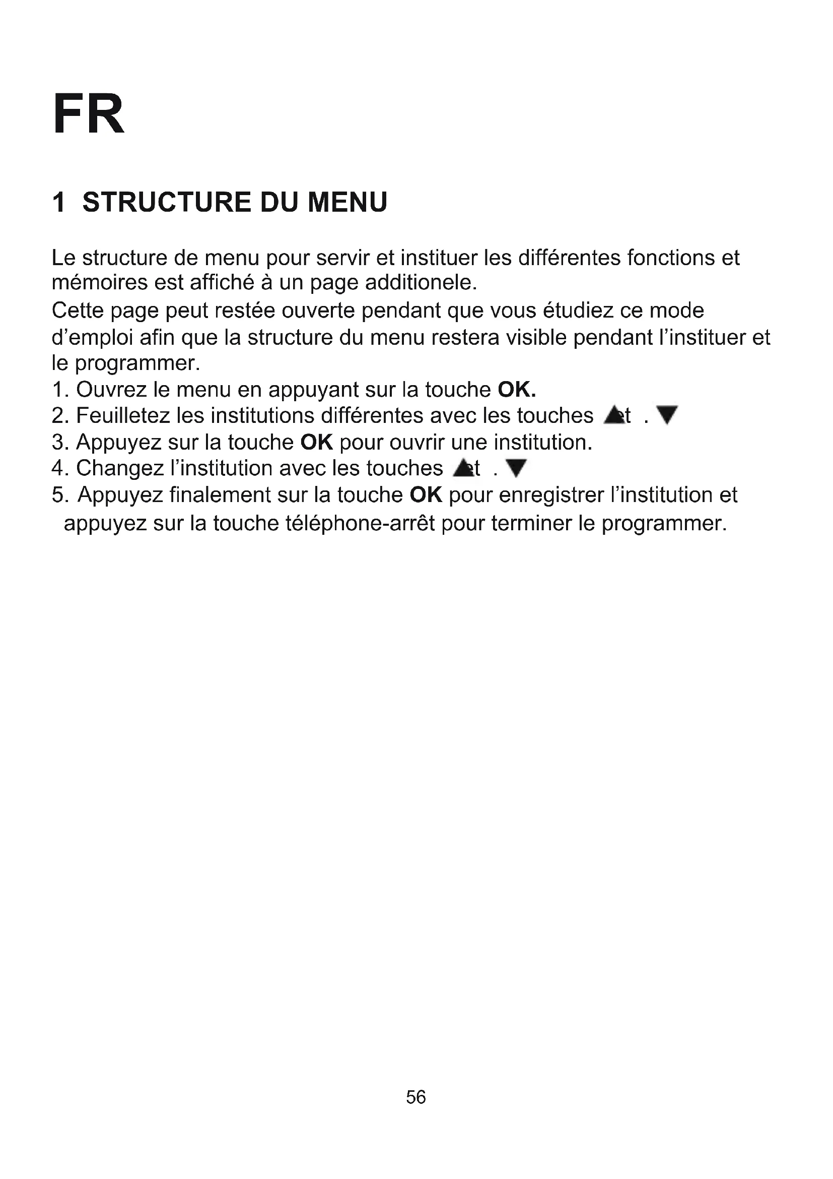 Le structure de menu pour servir et instituer les différentes fonctions et mémoires est afché à un page additionele. Cette page peut restée ouverte pendant que vous étudiez ce mode d’emploi an que la structure du menu restera visible pendant l’instituer et le programmer.