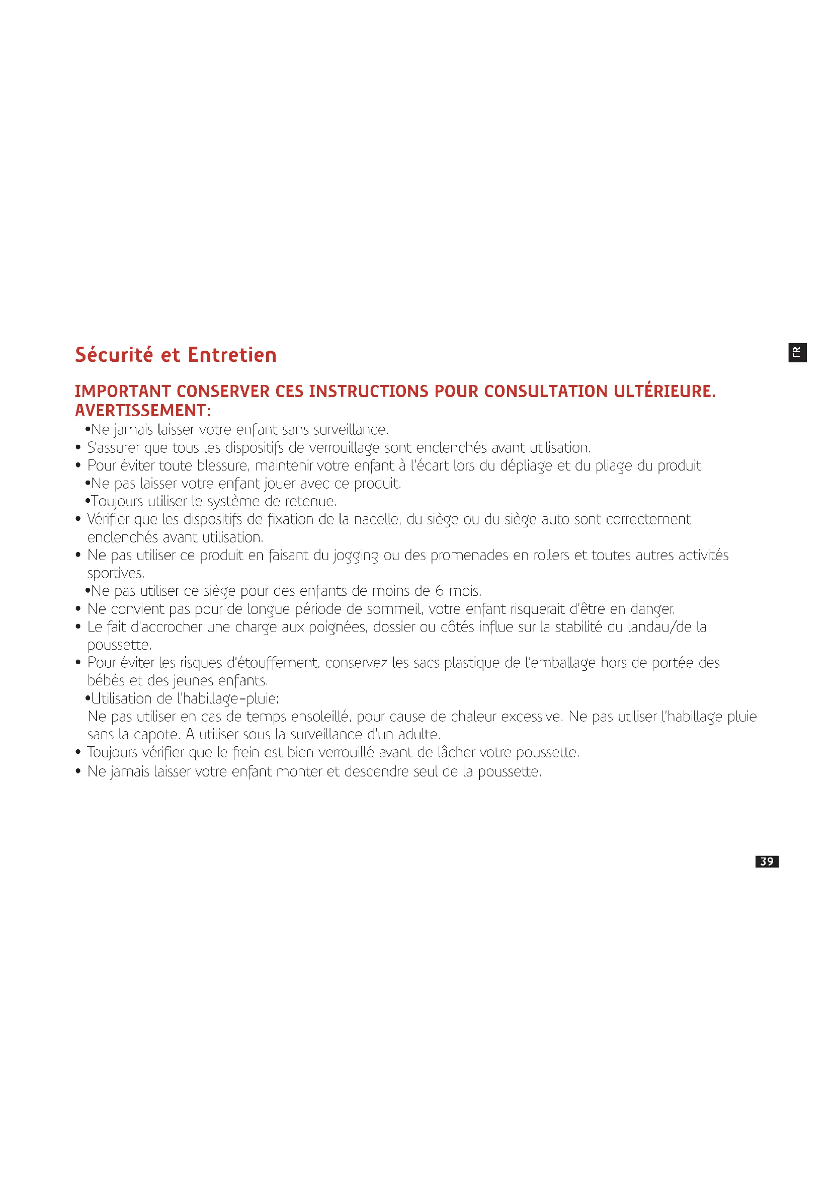 - Utilisation de l’habillage-pluie: Ne pas utiliser en cas de temps ensoleillé, pour cause de chaleur excessive. Ne pas utiliser l’habillage pluie sans la capote. A utiliser sous la surveillance d’un adulte.