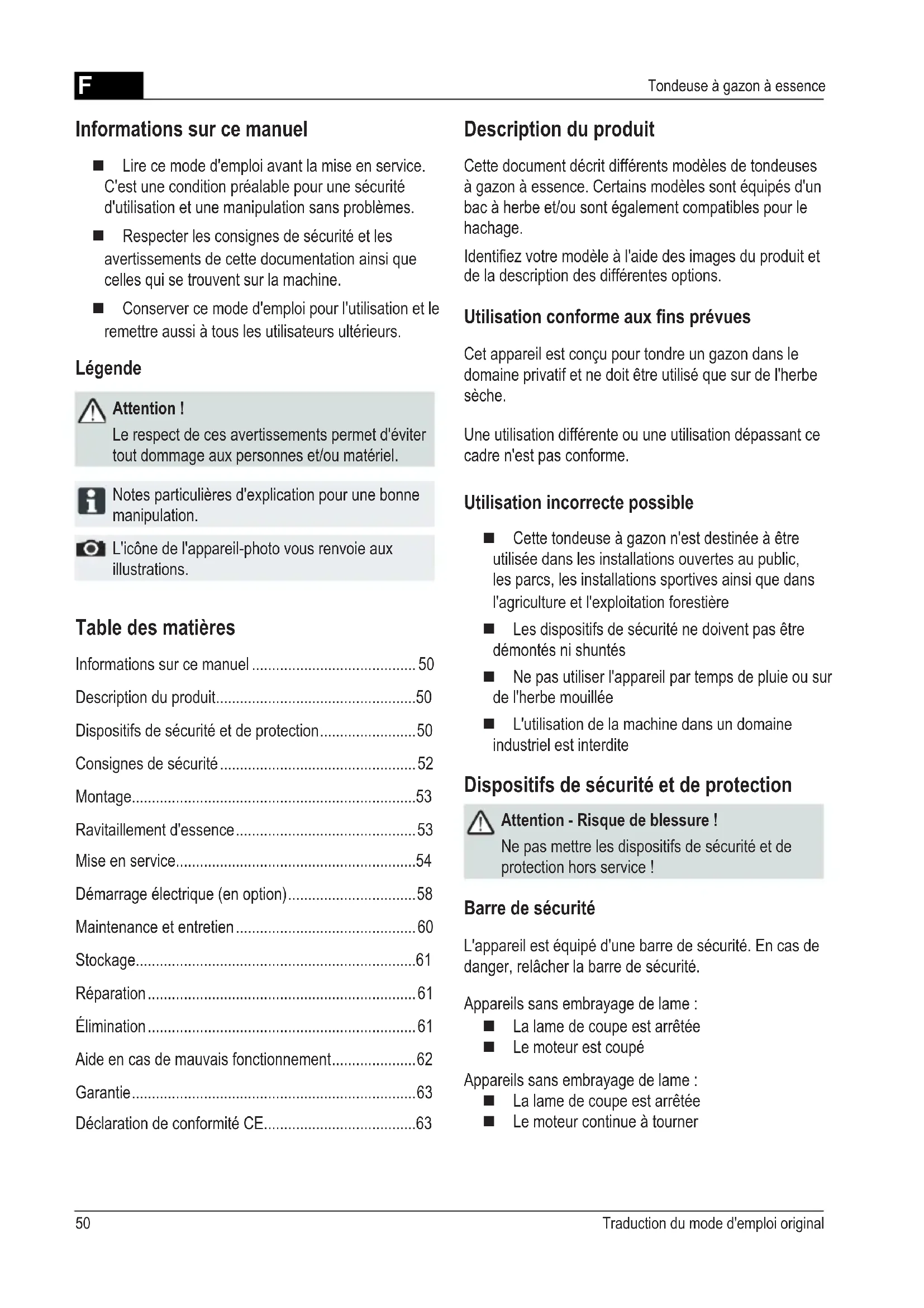 - Tondeuse à gazon à essence Table des matières Informations sur ce manuel p. 50
