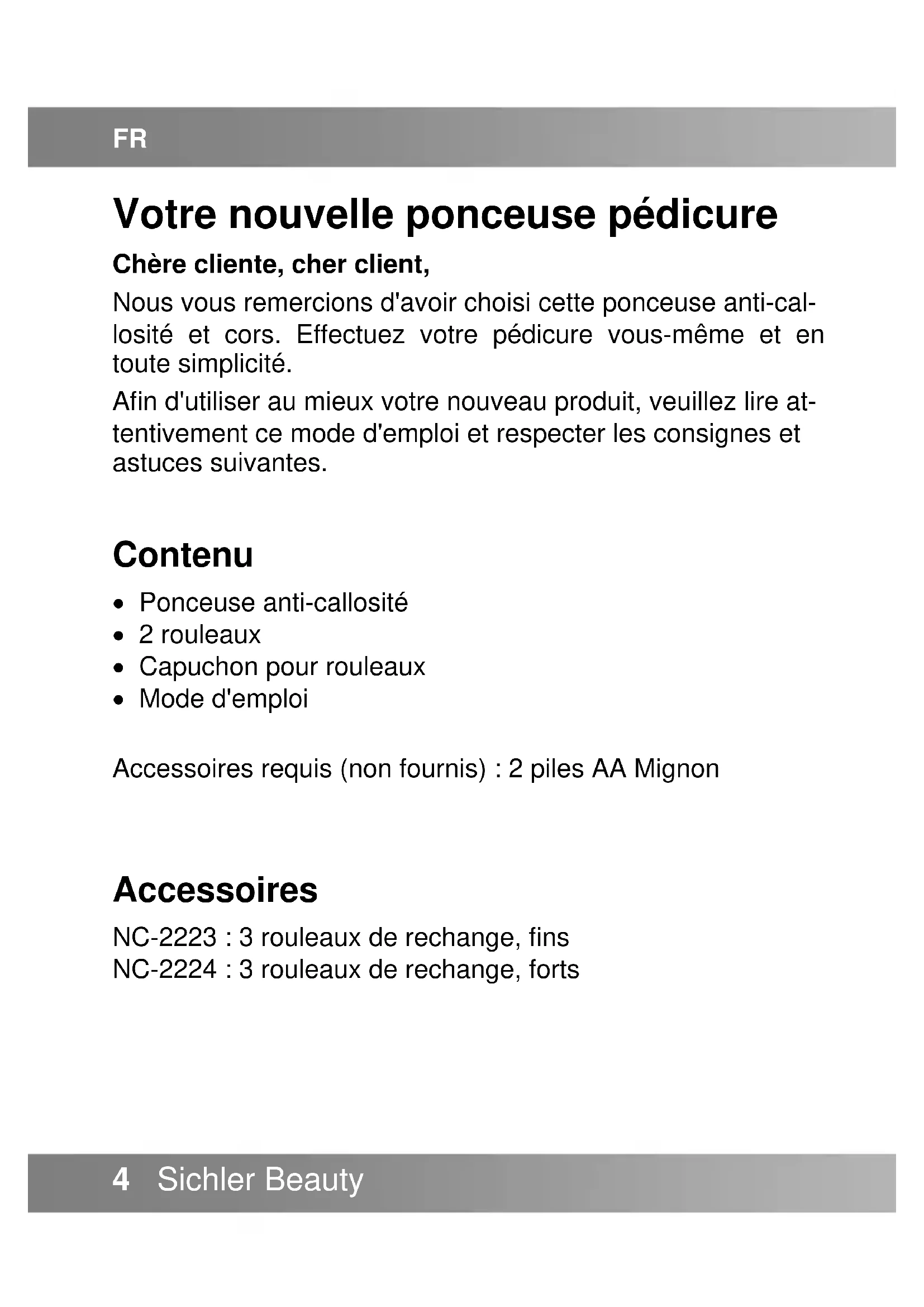 - Caractéristiques techniques FR 4 Sichler Beauty Votre nouvelle ponceuse pédicure Chère cliente, cher client, Nous vous remercions d'avoir choisi cette ponceuse anti-cal- losité et cors. Effectuez votre pédicure vous-même et en toute simplicité. Afin d'utiliser au mieux votre nouveau produit, veuillez lire at- tentivement ce mode d'emploi et respecter les consignes et astuces suivantes. Contenu Ponceuse anti-callosité 2 rouleaux Capuchon pour rouleaux Mode d'emploi Accessoires requis (non fournis) : 2 piles AA Mignon p. 14