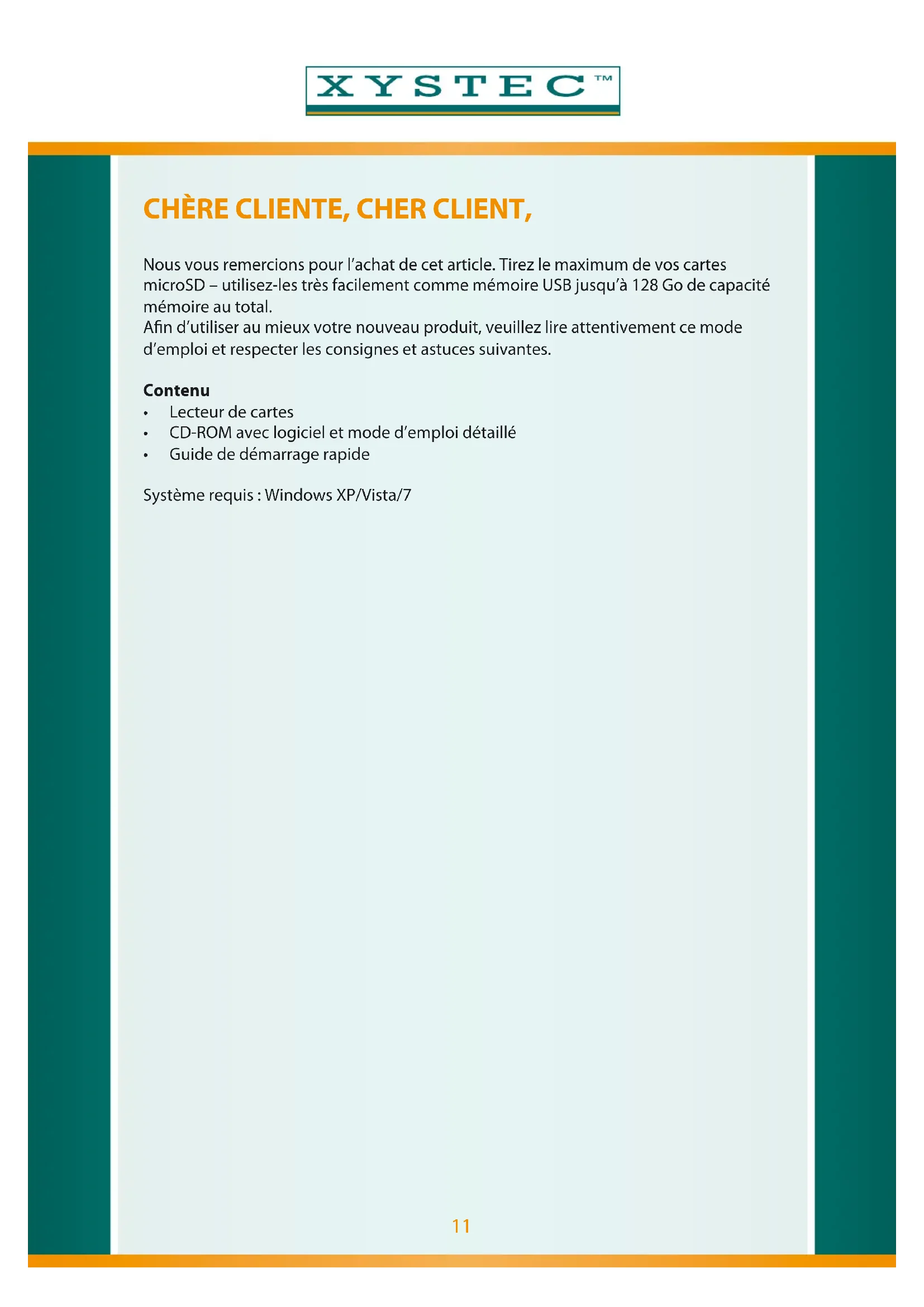 PX-1134-675 Mode d‘emploi11 CHÈRE CLIENTE, CHER CLIENT, Nous vous remercions pour l’achat de cet article. Tirez le maximum de vos cartes microSD – utilisez-les très facilement comme mémoire USB jusqu’à 128 Go de capacité mémoire au total. Afin d’utiliser au mieux votre nouveau produit, veuillez lire attentivement ce mode d’emploi et respecter les consignes et astuces suivantes. Contenu Lecteur de cartes CD-ROM avec logiciel et mode d’emploi détaillé Guide de démarrage rapide Système requis : Windows XP/Vista/7