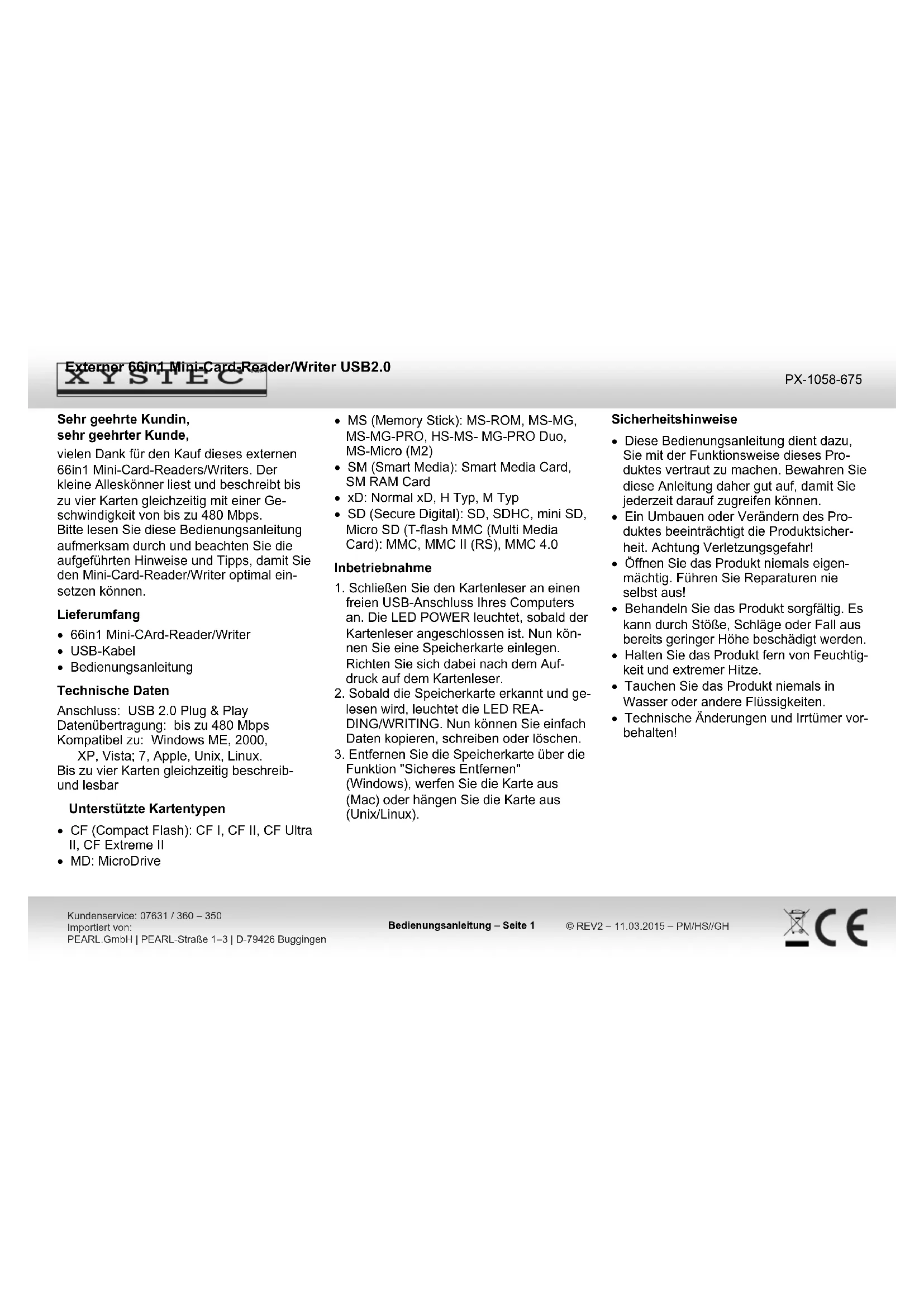 fonction "Retirer en toute sécurité" (Win- dows), "éjectez" la carte (Mac), ou "éjec- tez/démontez" la carte (Unix/Linux). Consignes de sécurité Ce mode d'emploi vous permet de vous familiariser avec le fonctionnement du produit. Conservez-le précieusement afin de pouvoir le consulter en cas de besoin. Pour connaître les conditions de garantie, veuillez contacter votre revendeur. Veuil- lez également tenir compte des condi- tions générales de vente ! Veillez à utiliser le produit uniquement comme indiqué dans la notice. Une mau- vaise utilisation peut endommager le pro- duit ou son environnement. Le démontage ou la modification du pro- duit affecte sa sécurité. Attention, risque de blessure ! N'ouvrez jamais l'appareil, sous peine de perdre toute garantie. Ne tentez jamais de réparer vous-même le produit ! Manipulez le produit avec précaution. Un coup, un choc, ou une chute, même de faible hauteur, peut l'endommager. N'exposez pas le produit à l'humidité ni à une chaleur extrême. Ne plongez jamais l'appareil dans l'eau ni dans aucun autre liquide. Surveillez les enfants pour vous assurer qu'ils ne jouent pas avec l'appareil. Si le câble d'alimentation est endom- magé, il doit être remplacé afin d'éviterMini lecteur de cartes 66 en 1 externe & USB 2.0 Mode d'emploi – page 2 Service commercial : 0033 (0) 3 88 58 02 02 Importé par : Pearl | 6 rue de la Scheer | F-67600 Sélestat