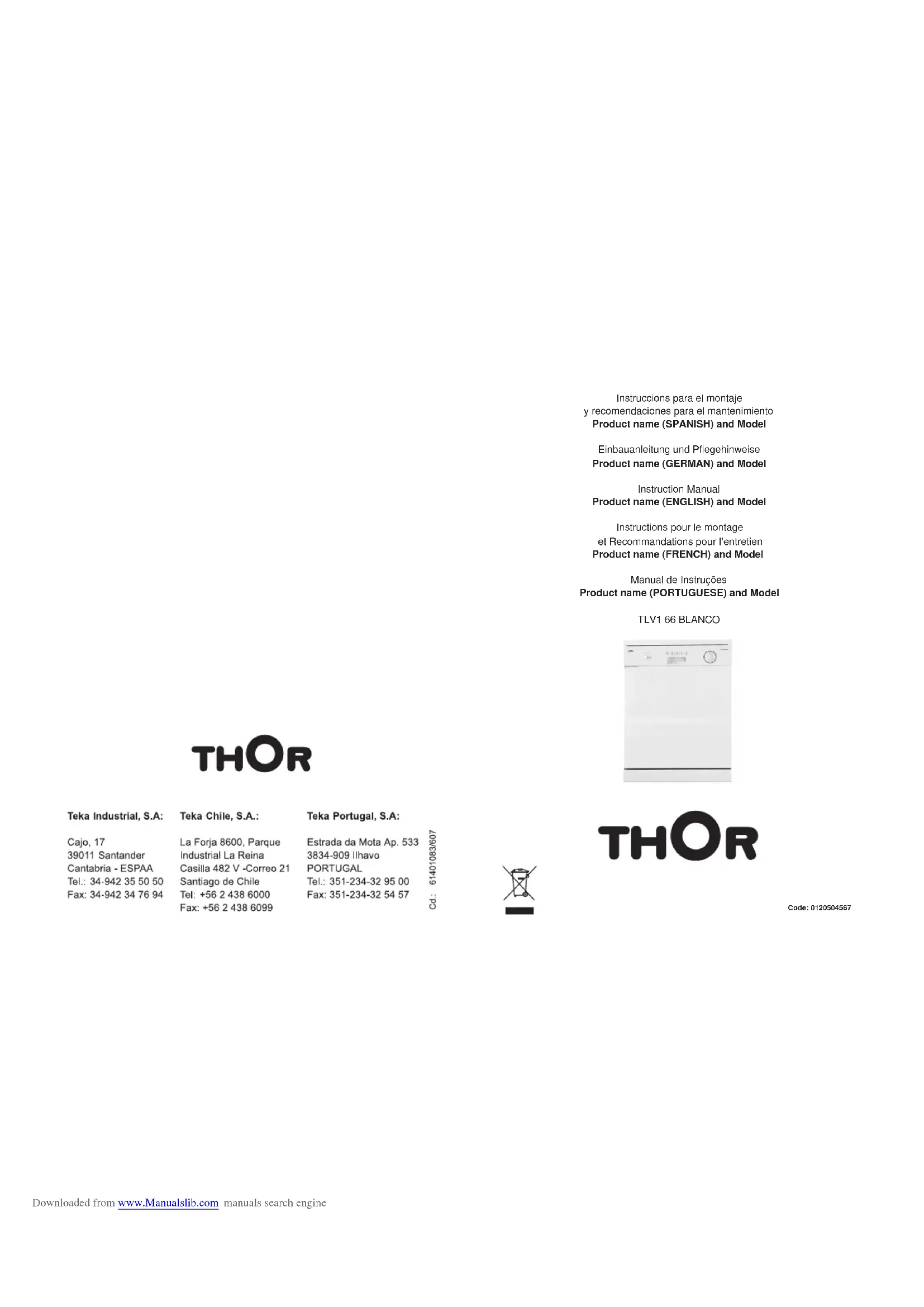 TLV1 66 Blanco - Lave-vaisselle Thor - Notice d'utilisation et mode d'emploi gratuit
