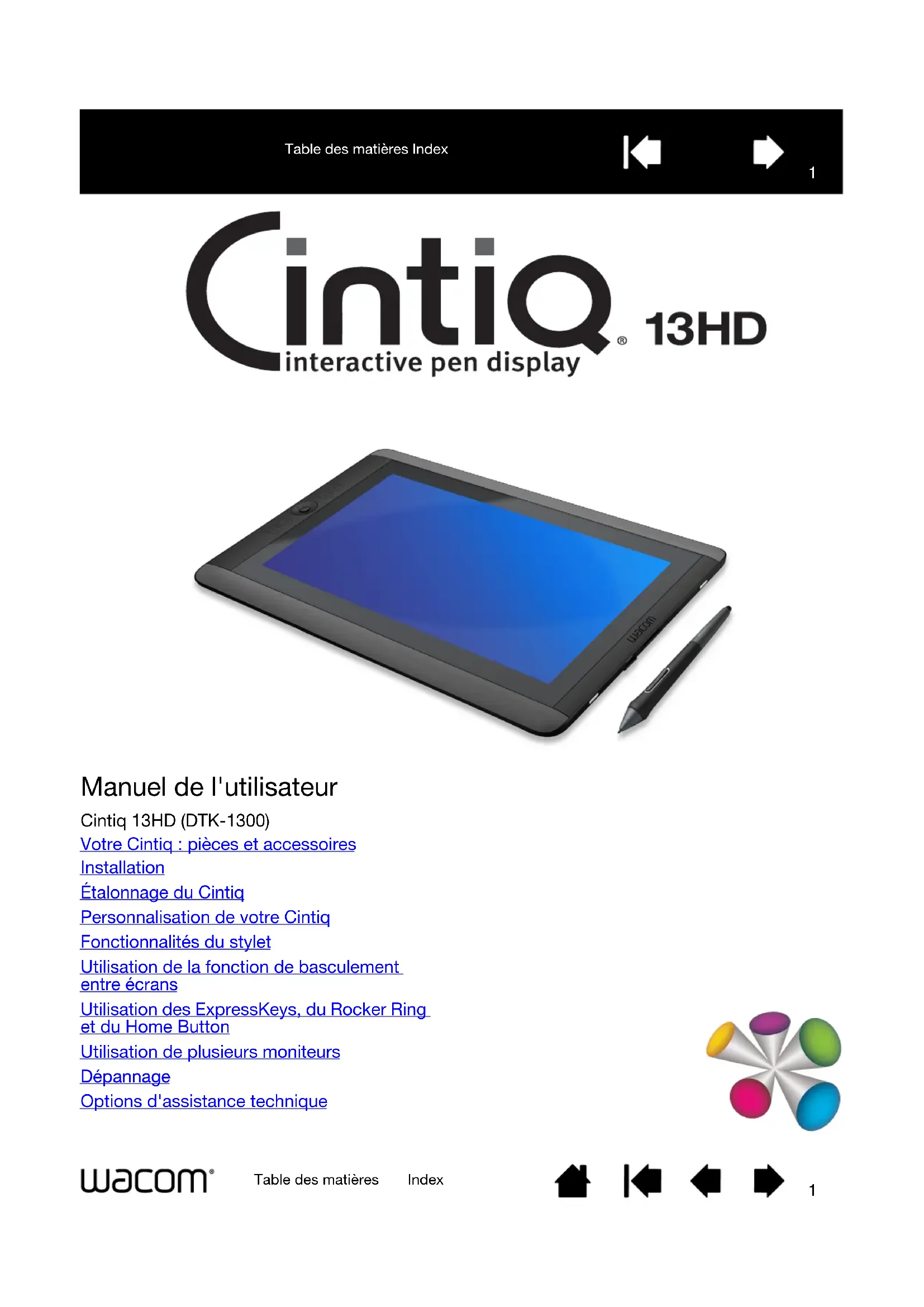 Table des matières Index Cintiq 13HD (DTK-1300) Votre Cintiq : pièces et accessoires Installation Étalonnage du Cintiq Personnalisation de votre Cintiq Fonctionnalités du stylet Utilisation de la fonction de basculement entre écrans Utilisation des ExpressKeys, du Rocker Ring et du Home Button Utilisation de plusieurs moniteurs Dépannage Options d'assistance technique2