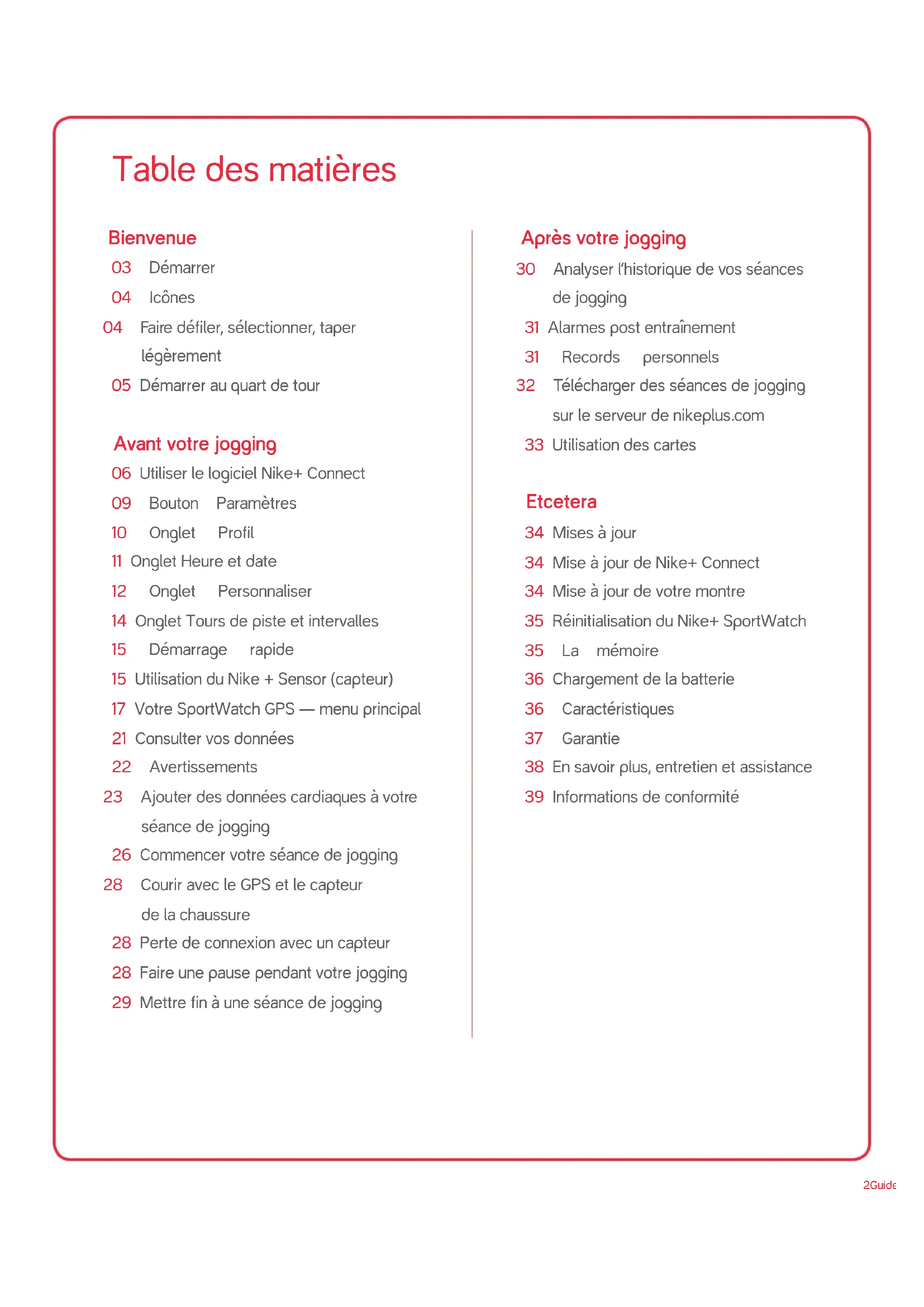 2Guide d’utilisation du Nike+ SportWatch GPS Bienvenue 03 Démarrer 04 Icônes 04 Faire défiler, sélectionner, taper légèrement 05 Démarrer au quart de tour Avant votre jogging 06 Utiliser le logiciel Nike+ Connect 09 Bouton Paramètres 10 Onglet Profil 11 Onglet Heure et date 12 Onglet Personnaliser 14 Onglet Tours de piste et intervalles 15 Démarrage rapide 15 Utilisation du Nike + Sensor (capteur) 17 Votre SportWatch GPS — menu principal 21 Consulter vos données 22 Avertissements 23 Ajouter des données cardiaques à votre séance de jogging 26 Commencer votre séance de jogging 28 Courir avec le GPS et le capteur de la chaussure 28 Perte de connexion avec un capteur 28 Faire une pause pendant votre jogging 29 Mettre fin à une séance de jogging Après votre jogging 30 Analyser l’historique de vos séances de jogging 31 Alarmes post entraînement 31 Records personnels 32 Télécharger des séances de jogging sur le serveur de nikeplus.com 33 Utilisation des cartes Etcetera 34 Mises à jour 34 Mise à jour de Nike+ Connect 34 Mise à jour de votre montre 35 Réinitialisation du Nike+ SportWatch 35 La mémoire 36 Chargement de la batterie 36 Caractéristiques 37 Garantie 38 En savoir plus, entretien et assistance 39 Informations de conformité Table des matières3Guide d’utilisation du Nike+ SportWatch GPS run history stopwatch records clock v2.0 Tous les entraînements ont été téléchargés sur le serveur.