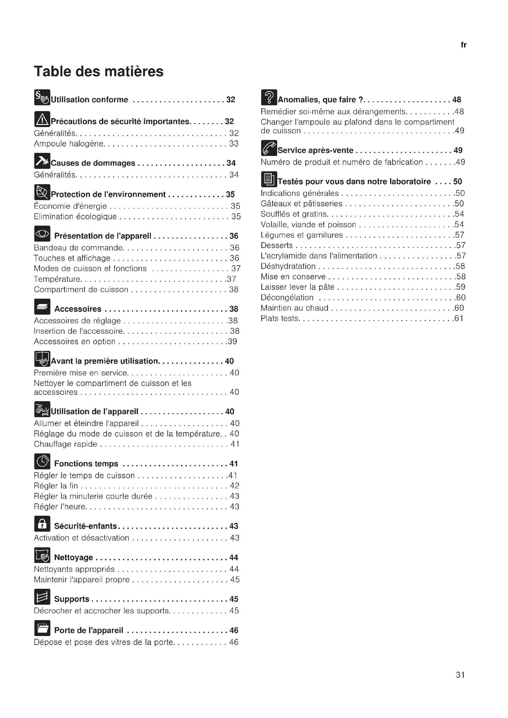 - Présentation de l'appareil . . . . . . . . . . . . . . . . . 36 Bandeau de commande. . . . . . . . . . . . . . . . . . . . . . . 36 Touches et affichage . . . . . . . . . . . . . . . . . . . . . . . . . 36 Modes de cuisson et fonctions . . . . . . . . . . . . . . . . . 37 Température. . . . . . . . . . . . . . . . . . . . . . . . . . . . . . . .37 Compartiment de cuisson . . . . . . . . . . . . . . . . . . . . . 38 _ Accessoires . . . . . . . . . . . . . . . . . . . . . . . . . . . . 38 Accessoires de réglage . . . . . . . . . . . . . . . . . . . . . . .38 Insertion de l'accessoire. . . . . . . . . . . . . . . . . . . . . . . 38 Accessoires en option . . . . . . . . . . . . . . . . . . . . . . . .39 K Avant la première utilisation. . . . . . . . . . . . . . . 40 Première mise en service. . . . . . . . . . . . . . . . . . . . . . 40 Nettoyer le compartiment de cuisson et les accessoires . . . . . . . . . . . . . . . . . . . . . . . . . . . . . . . . 40 1 Utilisation de l’appareil . . . . . . . . . . . . . . . . . . . 40 Allumer et éteindre l'appareil . . . . . . . . . . . . . . . . . . . 40 Réglage du mode de cuisson et de la température. . 40 Chauffage rapide . . . . . . . . . . . . . . . . . . . . . . . . . . . . 41 O Fonctions temps . . . . . . . . . . . . . . . . . . . . . . . . 41 Régler le temps de cuisson . . . . . . . . . . . . . . . . . . . .41 Régler la fin . . . . . . . . . . . . . . . . . . . . . . . . . . . . . . . . 42 Régler la minuterie courte durée . . . . . . . . . . . . . . . . 43 Régler l’heure. . . . . . . . . . . . . . . . . . . . . . . . . . . . . . . 43 A Sécurité-enfants. . . . . . . . . . . . . . . . . . . . . . . . . 43 Activation et désactivation . . . . . . . . . . . . . . . . . . . . . 43 D Nettoyage . . . . . . . . . . . . . . . . . . . . . . . . . . . . . . 44 Nettoyants appropriés . . . . . . . . . . . . . . . . . . . . . . . . 44 Maintenir l'appareil propre . . . . . . . . . . . . . . . . . . . . . 45 p Supports . . . . . . . . . . . . . . . . . . . . . . . . . . . . . . . 45 Décrocher et accrocher les supports. . . . . . . . . . . . . 45 q Porte de l'appareil . . . . . . . . . . . . . . . . . . . . . . . 46 Dépose et pose des vitres de la porte. . . . . . . . . . . . 46 3 Anomalies, que faire ?. . . . . . . . . . . . . . . . . . . . 48 Remédier soi-même aux dérangements. . . . . . . . . . .48 Changer l'ampoule au plafond dans le compartiment de cuisson . . . . . . . . . . . . . . . . . . . . . . . . . . . . . . . . .49 4 Service après-vente . . . . . . . . . . . . . . . . . . . . . . 49 Numéro de produit et numéro de fabrication . . . . . . .49 J Testés pour vous dans notre laboratoire . . . . 50 Indications générales . . . . . . . . . . . . . . . . . . . . . . . . .50 Gâteaux et pâtisseries . . . . . . . . . . . . . . . . . . . . . . . .50 Soufflés et gratins. . . . . . . . . . . . . . . . . . . . . . . . . . . .54 Volaille, viande et poisson . . . . . . . . . . . . . . . . . . . . .54 Légumes et garnitures . . . . . . . . . . . . . . . . . . . . . . . .57 Desserts . . . . . . . . . . . . . . . . . . . . . . . . . . . . . . . . . . .57 L'acrylamide dans l'alimentation . . . . . . . . . . . . . . . . .57 Déshydratation . . . . . . . . . . . . . . . . . . . . . . . . . . . . . .58 Mise en conserve . . . . . . . . . . . . . . . . . . . . . . . . . . . .58 Laisser lever la pâte . . . . . . . . . . . . . . . . . . . . . . . . . .59 Décongélation . . . . . . . . . . . . . . . . . . . . . . . . . . . . . .60 Maintien au chaud . . . . . . . . . . . . . . . . . . . . . . . . . . .60 Plats tests. . . . . . . . . . . . . . . . . . . . . . . . . . . . . . . . . .61fr Utilisation conforme