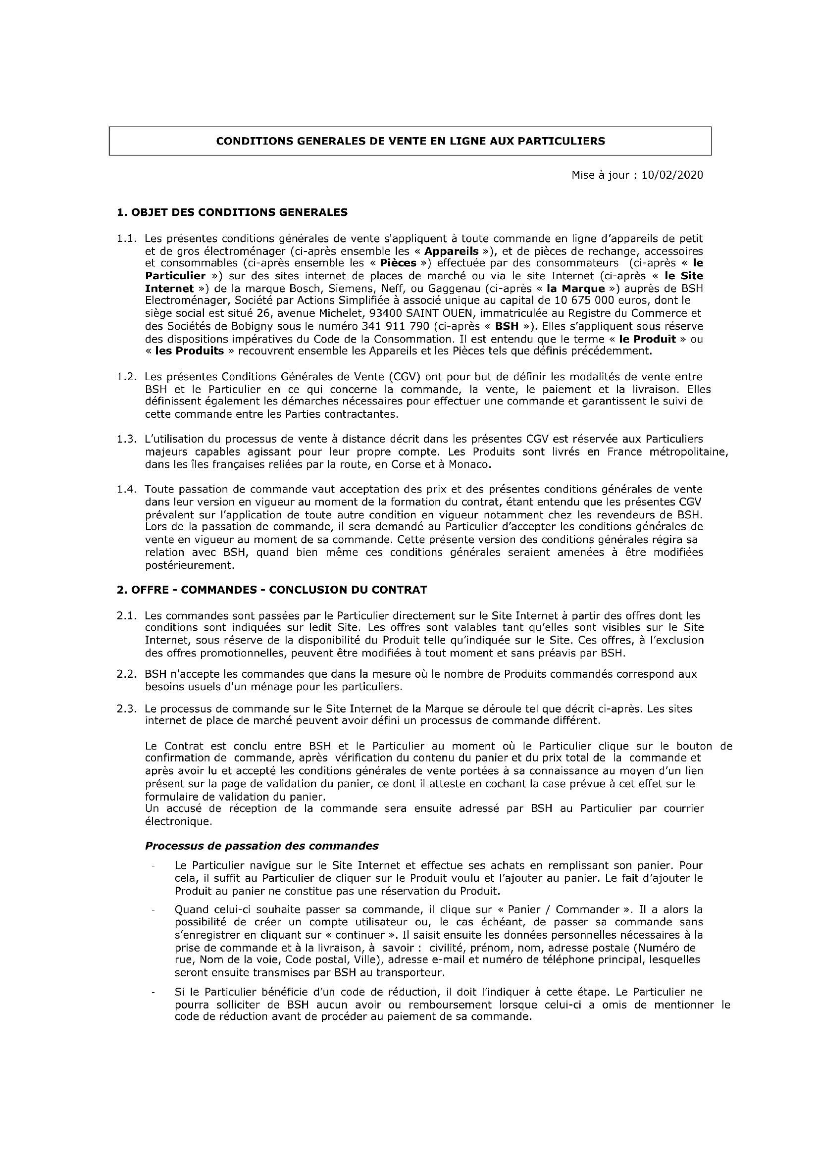 1.1. Les présentes conditions générales de vente s'appliquent à toute commande en ligne d’appareils de petit et de gros électroménager (ci-après ensemble les « Appareils »), et de pièces de rechange, accessoires et consommables (ci-après ensemble les « Pièces ») effectuée par des consommateurs (ci-après « le Particulier ») sur des sites internet de places de marché ou via le site Internet (ci-après « le Site Internet ») de la marque Bosch, Siemens, Neff, ou Gaggenau (ci-après « la Marque ») auprès de BSH Electroménager, Société par Actions Simplifiée à associé unique au capital de 10 675 000 euros, dont le siège social est situé 26, avenue Michelet, 93400 SAINT OUEN, immatriculée au Registre du Commerce et des Sociétés de Bobigny sous le numéro 341 911 790 (ci-après « BSH »). Elles s’appliquent sous réserve des dispositions impératives du Code de la Consommation. Il est entendu que le terme « le Produit » ou « les Produits » recouvrent ensemble les Appareils et les Pièces tels que définis précédemment. 1.2. Les présentes Conditions Générales de Vente (CGV) ont pour but de définir les modalités de vente entre BSH et le Particulier en ce qui concerne la commande, la vente, le paiement et la livraison. Elles définissent également les démarches nécessaires pour effectuer une commande et garantissent le suivi de cette commande entre les Parties contractantes. 1.3. L’utilisation du processus de vente à distance décrit dans les présentes CGV est réservée aux Particuliers majeurs capables agissant pour leur propre compte. Les Produits sont livrés en France métropolitaine, dans les îles françaises reliées par la route, en Corse et à Monaco. 1.4. Toute passation de commande vaut acceptation des prix et des présentes conditions générales de vente dans leur version en vigueur au moment de la formation du contrat, étant entendu que les présentes CGV prévalent sur l’application de toute autre condition en vigueur notamment chez les revendeurs de BSH. Lors de la passation de commande, il sera demandé au Particulier d’accepter les conditions générales de vente en vigueur au moment de sa commande. Cette présente version des conditions générales régira sa relation avec BSH, quand bien même ces conditions générales seraient amenées à être modifiées postérieurement.
