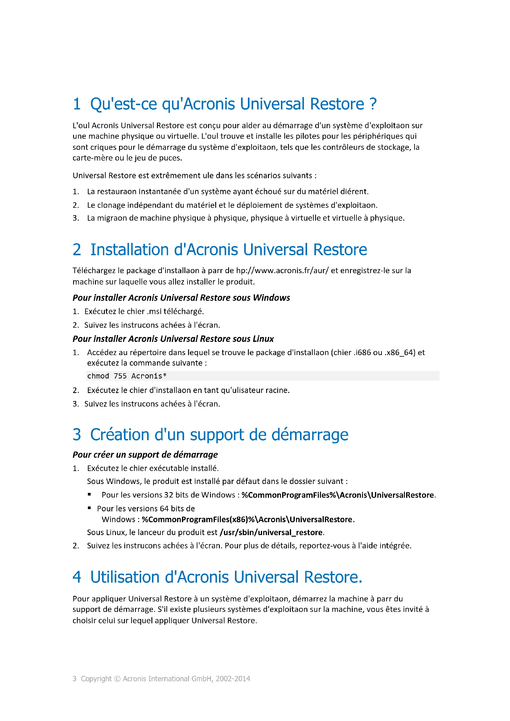 Universal Restore peut être appliqué aux systèmes opérationnels de version Linux 2.6.8 ou supérieure. Quand Universal Restore est appliqué à un système d'exploitation Linux, il met à jour un système de fichiers temporaire connu comme le disque RAM initial (initrd). Cela garantit que le système d'exploitation peut démarrer sur le nouveau matériel. Universal Restore ajoute des modules pour le nouveau matériel (y compris les pilotes de périphériques) pour le disque RAM initial. En règle générale, il trouve les modules nécessaires dans le répertoire /lib/modules. Si Universal Restore ne peut pas trouver un module dont il a besoin, il enregistre le nom de fichier du module dans le journal. Universal Restore peut modifier la configuration du chargeur de démarrage GRUB. Cela peut être nécessaire, par exemple, pour assurer la capacité de démarrage du système lorsque la nouvelle machine possède une structure de volume différente de la machine d'origine. Universal Restore ne modifie jamais le noyau Linux. Pour rétablir le disque RAM initial d'origine Vous pouvez rétablir le disque RAM initial d'origine si nécessaire. Le disque RAM initial est stocké sur la machine dans un fichier. Avant de mettre à jour le disque RAM initial pour la première fois, Universal Restore en enregistre une copie dans le même répertoire. Le nom de la copie est le nom du fichier, suivi du suffixe _acronis_backup.img. Cette copie ne sera pas6 Copyright © Acronis International GmbH, 2002-2014