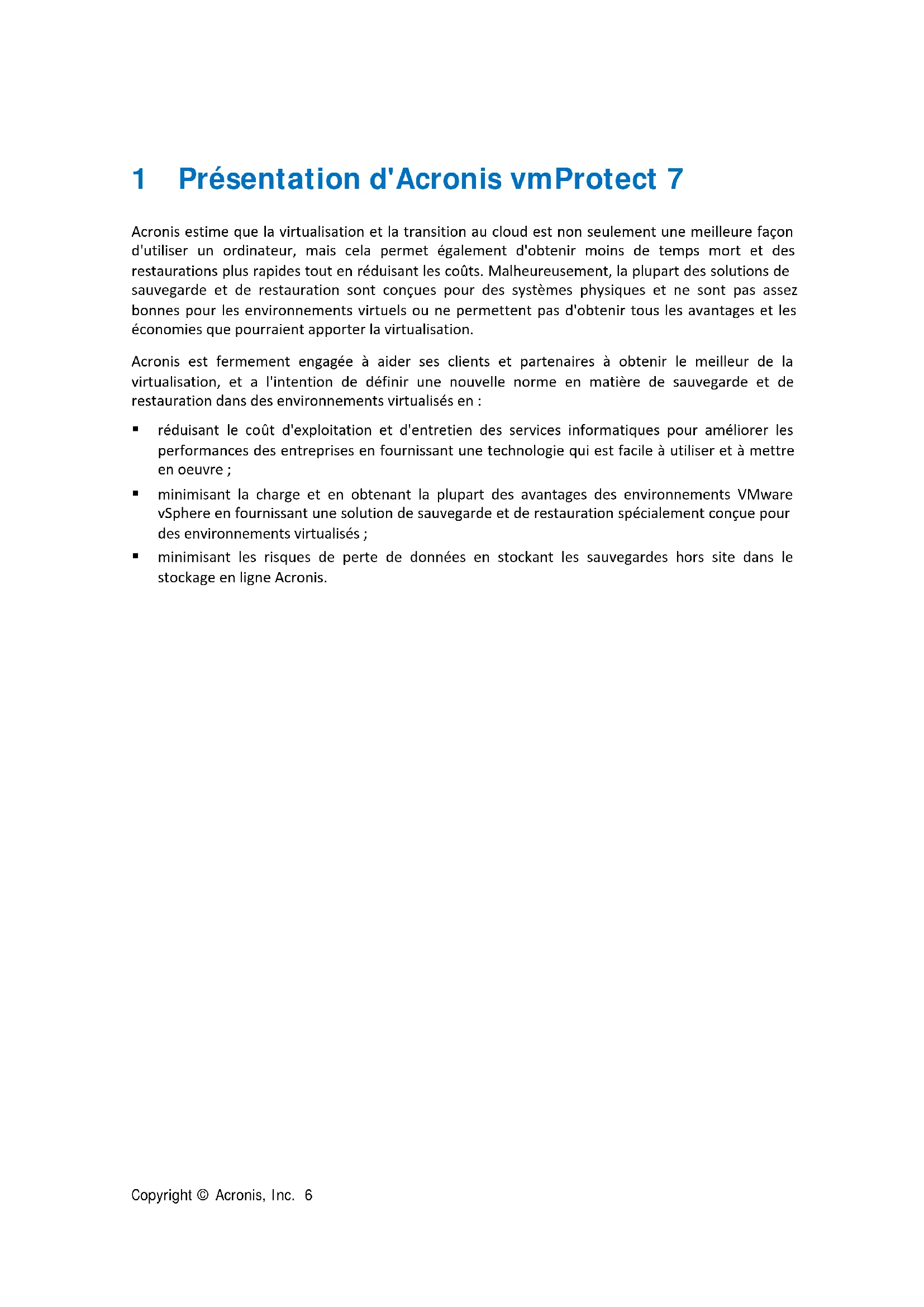 1 Présentation d'Acronis vmProtect 7 Acronis estime que la virtualisation et la transition au cloud est non seulement une meilleure façon d'utiliser un ordinateur, mais cela permet également d'obtenir moins de temps mort et des restaurations plus rapides tout en réduisant les coûts. Malheureusement, la plupart des solutions de sauvegarde et de restauration sont conçues pour des systèmes physiques et ne sont pas assez bonnes pour les environnements virtuels ou ne permettent pas d'obtenir tous les avantages et les économies que pourraient apporter la virtualisation. Acronis est fermement engagée à aider ses clients et partenaires à obtenir le meilleur de la virtualisation, et a l'intention de définir une nouvelle norme en matière de sauvegarde et de restauration dans des environnements virtualisés en : réduisant le coût d'exploitation et d'entretien des services informatiques pour améliorer les performances des entreprises en fournissant une technologie qui est facile à utiliser et à mettre en oeuvre ; minimisant la charge et en obtenant la plupart des avantages des environnements VMware vSphere en fournissant une solution de sauvegarde et de restauration spécialement conçue pour des environnements virtualisés ; minimisant les risques de perte de données en stockant les sauvegardes hors site dans le stockage en ligne Acronis.Copyright © Acronis, Inc. 7