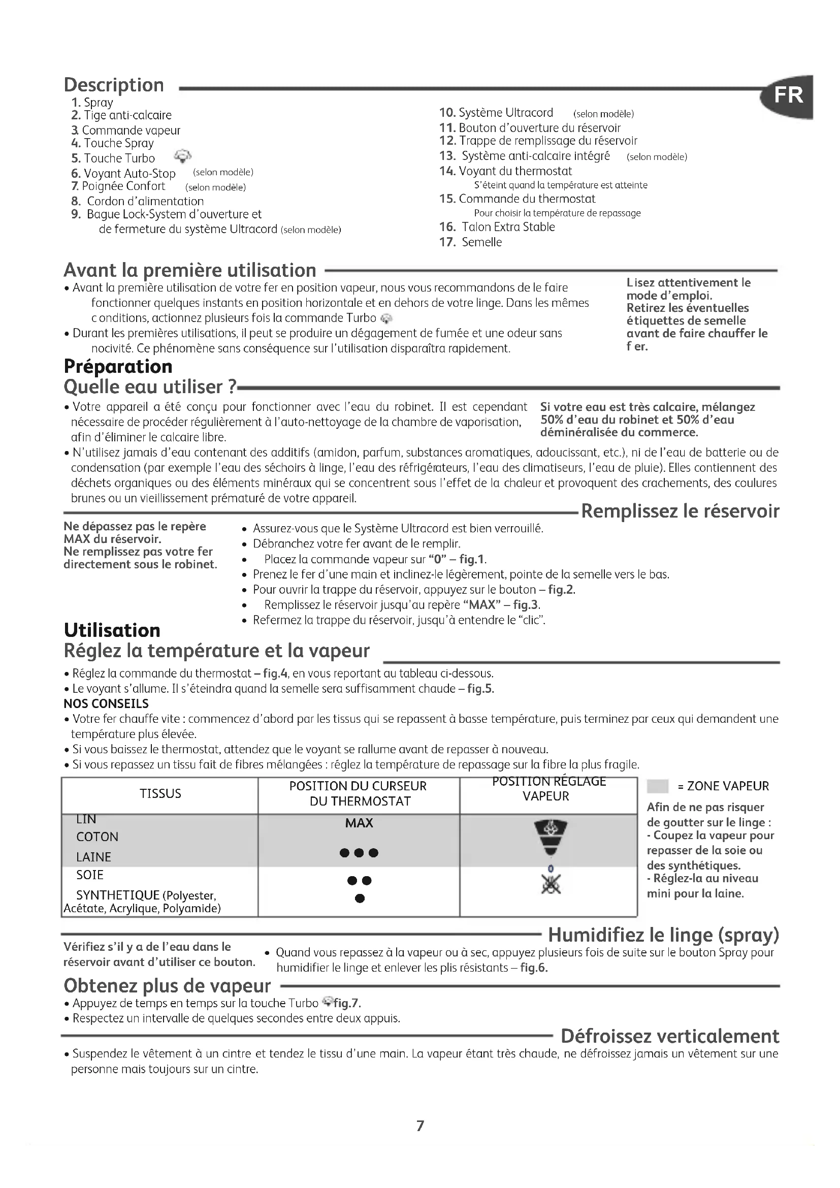 . Commande vapeur4. Touche Spray5. Touche Turbo 6. Voyant Auto-Stop (selon modèle) . Poignée Confort (selon modèle)8. Cordon d’alimentation9. Bague Lock-System d’ouverture etde fermeture du système Ultracord (selon modèle)10. Système Ultracord (selon modèle)11. Bouton d’ouverture du réservoir 2. Trappe de remplissage du réservoir13. Système anti-calcaire intégré (selon modèle)14. Voyant du thermostatS’éteint quand la température est atteinte15. Commande du thermostatPour choisir la température de repassage16. Talon Extra Stable17. Semelle Avant la première utilisation