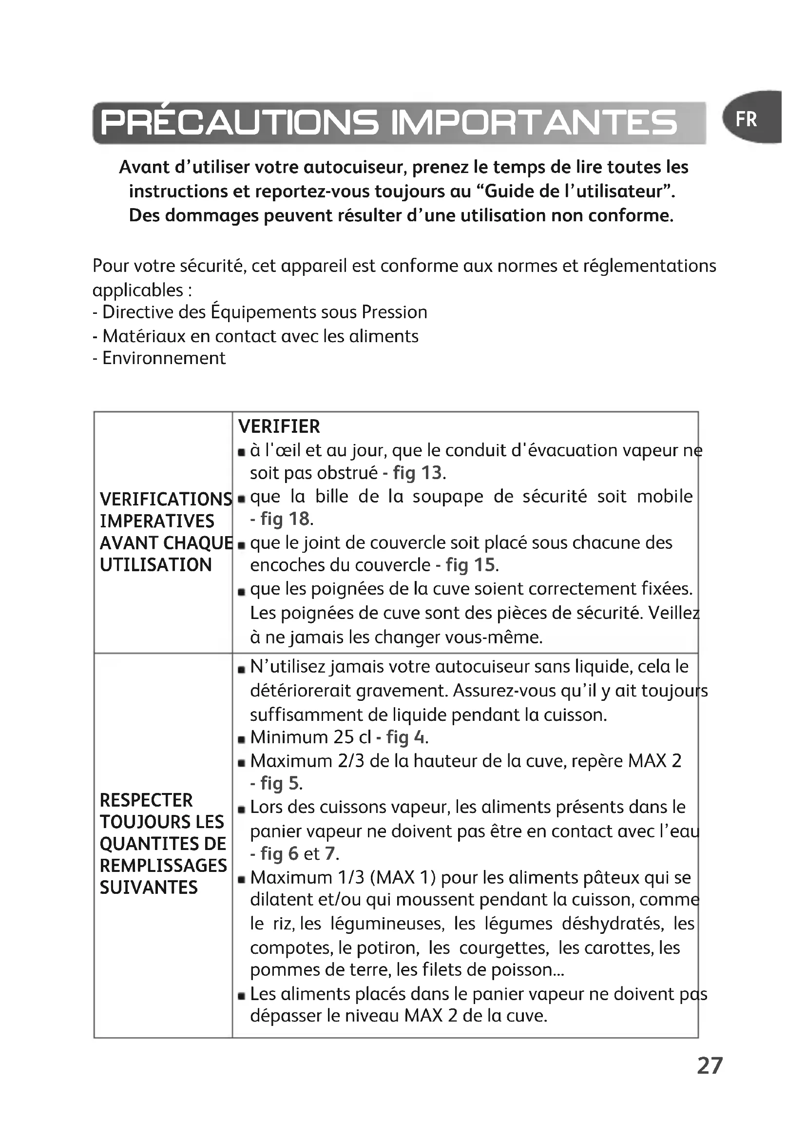 VERIFICATIONS IMPERATIVES AVANT CHAQUE UTILISATION VERIFIER à l'œil et au jour, que le conduit d'évacuation vapeur ne soit pas obstrué - fig 13. que la bille de la soupape de sécurité soit mobile - fig 18. que le joint de couvercle soit placé sous chacune des encoches du couvercle - fig 15. que les poignées de la cuve soient correctement fixées. Les poignées de cuve sont des pièces de sécurité. Veillez à ne jamais les changer vous-même. RESPECTER TOUJOURS LES QUANTITES DE REMPLISSAGES SUIVANTES N’utilisez jamais votre autocuiseur sans liquide, cela le détériorerait gravement. Assurez-vous qu’il y ait toujours suffisamment de liquide pendant la cuisson. Minimum 25 cl - fig 4. Maximum 2/3 de la hauteur de la cuve, repère MAX 2 - fig 5. Lors des cuissons vapeur, les aliments présents dans le panier vapeur ne doivent pas être en contact avec l’eau - fig 6 et 7. Maximum 1/3 (MAX 1) pour les aliments pâteux qui se dilatent et/ou qui moussent pendant la cuisson, comme le riz, les légumineuses, les légumes déshydratés, les compotes, le potiron, les courgettes, les carottes, les pommes de terre, les filets de poisson... Les aliments placés dans le panier vapeur ne doivent pas dépasser le niveau MAX 2 de la cuve.28 AVANT ET PENDANT LA CUISSON Ne pas laisser les enfants à proximité lorsque l'autocuiseur est en cours d'utilisation. Votre autocuiseur cuit sous pression. Des blessures par ébouillantage peuvent résulter d’une utilisation inadéquate. Assurez-vous que l’autocuiseur est convenablement fermé avant de le mettre en service. (Voir paragraphe “Fermeture”). Veillez, au cours de la cuisson, à ce que la soupape chuchote toujours. S’il n’y a pas assez de vapeur qui s’échappe, décompressez le produit et vérifiez la présence suffisante de liquide, ainsi que la non obstruction du conduit d'évacuation vapeur. Après ces vérifications si la vapeur ne s'échappe toujours pas, augmentez légèrement la source de chaleur. Ne pas cuire des aliments risquant d'obstruer les conduits des organes de sécurité : - les airelles - l'orge perlé - les flocons d'avoine - les pois cassés - les nouilles, macaronis, spaghettis - la rhubarbe - les groseilles Ne réalisez jamais de recette à base de lait animal dans votre autocuiseur. Dans le cas d'un autocuiseur avec cuve en inox, n’utilisez pas de gros sel dans votre autocuiseur, ajoutez du sel fin en fin de cuisson. Vous éviterez ainsi l'apparition de "piqûres" qui pourraient altérer le fond de votre autocuiseur. N’utilisez pas votre autocuiseur pour frire sous pression avec de l’huile. N’utilisez pas votre autocuiseur dans un autre but que celui auquel il est destiné. Ne mettez pas votre autocuiseur dans un four chaud. Ne jamais mettre de feuille de papier d'aluminium non maintenue sur un moule dans votre autocuiseur. Ne jamais mettre de film plastique dans votre autocuiseur Les vapeurs d’alcool sont inflammables. Portez à ébullition environ 2 minutes avant de mettre le couvercle. Surveillez votre appareil dans le cadre des recettes à base d’alcool. Utilisez la(les) source(s) de chaleur compatible(s), conformément aux instructions d’utilisation.FR