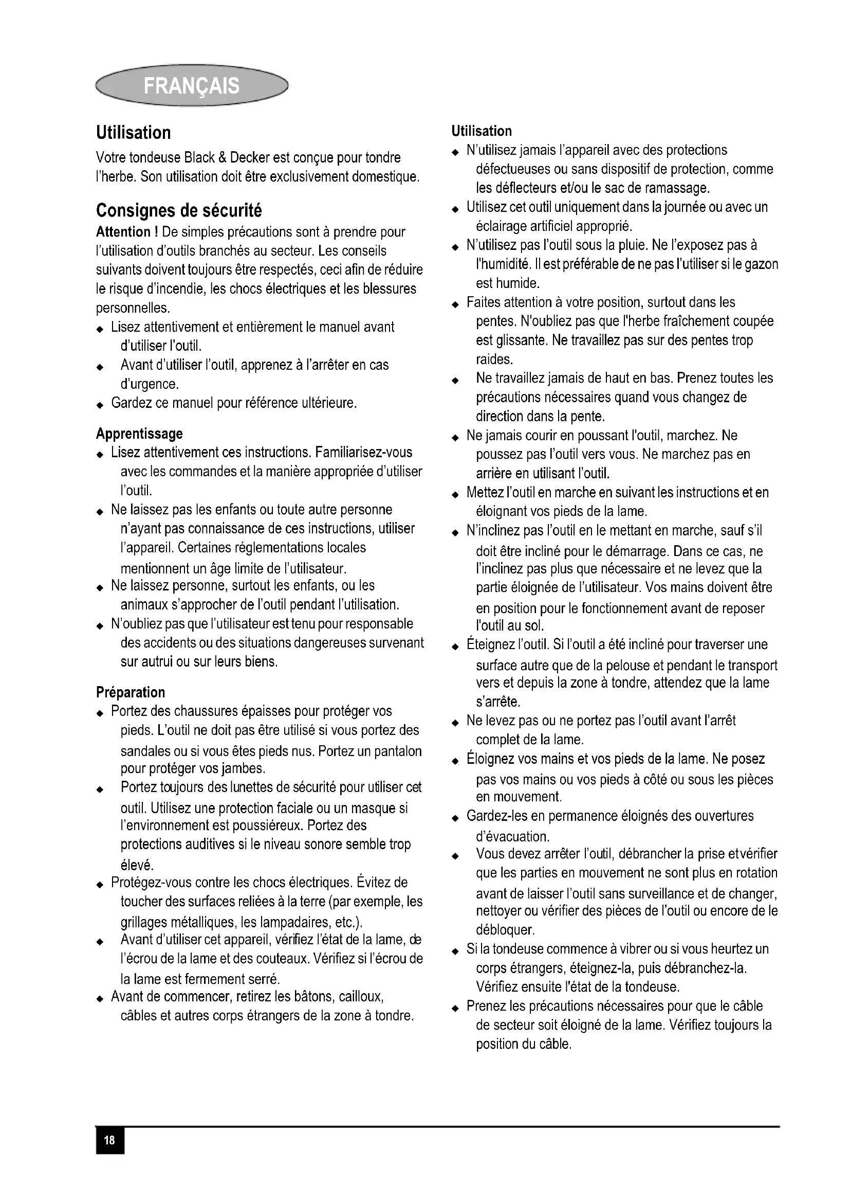 Garantie Black & Decker vertraut auf die Qualität der eigenen Geräte und bietet dem Käufer eine außergewöhnliche Garantie. Diese Garantiezusage versteht sich unbeschadet der gesetzlichen Gewährleistungsansprüche und schränkt diese keinesfalls ein. Sie gilt in sämtlichen Mitgliedsstaaten der Europäischen Union und der Europäischen Freihandelszone EFTA. Tritt innerhalb von 24 Monaten ab Kaufdatum an einem Gerät von Black & Decker ein auf Material- oder Verarbeitungsfehler zurückzuführender Mangel auf, garantiert Black & Decker den Austausch defekter Teile, die Reparatur von Geräten mit üblichem Verschleiß bzw. den Aust ausch eines mangelhaften Geräts, ohne dass dem Kunden dabei mehr als unvermeidlich Unannehmlichkeiten entstehen, allerdings vorbehaltlich folgender Ausnahmen: wenn das Gerät gewerblich, beruflich oder im Verleihgeschäft benutzt wurde; wenn das Gerät missbräuchlich verwendet oder mit mangelnder Sorgfalt behandelt wurde; wenn das Gerät durch Fremdeinwirkung beschädigt wurde; wenn ein unbefugter Reparaturversuch durch anderes Personal als das einer Vertragswerkstatt oder des Black & Decker-Kundendienstes unternommen wurde. Zur Inanspruchnahme dieser Garantie ist dem Verkäufer bzw. der Vertragswerkstatt ein Kaufnachweis vorzulegen. Die Adresse der zuständigen Niederlassung von Black & Decker steht in dieser Anleitung. Diese teilt Ihnen gerne die nächstgelegene Vertragswerkstatt mit. Außerdem ist eine Liste der Vertragswerkstätten und aller Kundendienststellen von Black & Decker sowie der zuständigen Ansprechpartner im Internet zu finden unter: www.2he lpU.com. Bitte besuchen Sie unsere Website www.blackanddecker.de, um Ihr neues Black & Decker- Produkt zu registrieren und über neue Produkte und Sonderangebote informiert zu werden. Weitere Informationen über die Marke Black & Decker und unsere Produkte finden Sie unter www.blackanddecker.de. GR3000C, GR3000, GR390018 FRANÇAIS Français Utilisation Votre tondeuse Black & Decker est conçue pour tondre l’herbe. Son utilisation doit être exclusivement domestique. Consignes de sécurité Attention ! De simples précautions sont à prendre pour l’utilisation d’outils branchés au secteur. Les conseils suivants doivent toujours être respectés, ceci afin de réduire le risque d’incendie, les chocs électriques et les blessures personnelles. Lisez attentivement et entièrement le manuel avant d’utiliser l’outil. Avant d’utiliser l’outil, apprenez à l’arrêter en cas d’urgence. Gardez ce manuel pour référence ultérieure. Apprentissage Lisez attentivement ces instructions. Familiarisez-vous avec les commandes et la manière appropriée d’utiliser l’outil. Ne laissez pas les enfants ou toute autre personne n’ayant pas connaissance de ces instructions, utiliser l’appareil. Certaines réglementations locales mentionnent un âge limite de l’utilisateur. Ne laissez personne, surtout les enfants, ou les animaux s’approcher de l’outil pendant l’utilisation. N’oubliez pas que l’utilisateur est tenu pour responsable des accidents ou des situations dangereuses survenant sur autrui ou sur leurs biens. Préparation Portez des chaussures épaisses pour protéger vos pieds. L’outil ne doit pas être utilisé si vous portez des sandales ou si vous êtes pieds nus. Portez un pantalon pour protéger vos jambes. Portez toujours des lunettes de sécurité pour utiliser cet outil. Utilisez une protection faciale ou un masque si l’environnement est poussiéreux. Portez des protections auditives si le niveau sonore semble trop élevé. Protégez-vous contre les chocs électriques. Évitez de toucher des surfaces reliées à la terre (par exemple, les grillages métalliques, les lampadaires, etc.). Avant d’utiliser cet appareil, vérifiez l’état de la lame, de l’écrou de la lame et des couteaux. Vérifiez si l’écrou de la lame est fermement serré. Avant de commencer, retirez les bâtons, cailloux, câbles et autres corps étrangers de la zone à tondre. Utilisation N’utilisez jamais l’appareil avec des protections défectueuses ou sans dispositif de protection, comme les déflecteurs et/ou le sac de ramassage. Utilisez cet outil uniquement dans la journée ou avec un éclairage artificiel approprié. N’utilisez pas l’outil sous la pluie. Ne l’exposez pas à l'humidité. Il est préférable de ne pas l’utiliser si le gazon est humide. Faites attention à votre position, surtout dans les pentes. N'oubliez pas que l'herbe fraîchement coupée est glissante. Ne travaillez pas sur des pentes trop raides. Ne travaillez jamais de haut en bas. Prenez toutes les précautions nécessaires quand vous changez de direction dans la pente. Ne jamais courir en poussant l'outil, marchez. Ne poussez pas l’outil vers vous. Ne marchez pas en arrière en utilisant l’outil. Mettez l’outil en marche en suivant les instructions et en éloignant vos pieds de la lame. N’inclinez pas l’outil en le mettant en marche, sauf s’il doit être incliné pour le démarrage. Dans ce cas, ne l’inclinez pas plus que nécessaire et ne levez que la partie éloignée de l’utilisateur. Vos mains doivent être en position pour le fonctionnement avant de reposer l'outil au sol. Éteignez l’outil. Si l’outil a été incliné pour traverser une surface autre que de la pelouse et pendant le transport vers et depuis la zone à tondre, attendez que la lame s’arrête. Ne levez pas ou ne portez pas l’outil avant l’arrêt complet de la lame. Éloignez vos mains et vos pieds de la lame. Ne posez pas vos mains ou vos pieds à côté ou sous les pièces en mouvement. Gardez-les en permanence éloignés des ouvertures d’évacuation. Vous devez arrêter l’outil, débrancher la prise et vérifier que les parties en mouvement ne sont plus en rotation avant de laisser l’outil sans surveillance et de changer, nettoyer ou vérifier des pièces de l’outil ou encore de le débloquer. Si