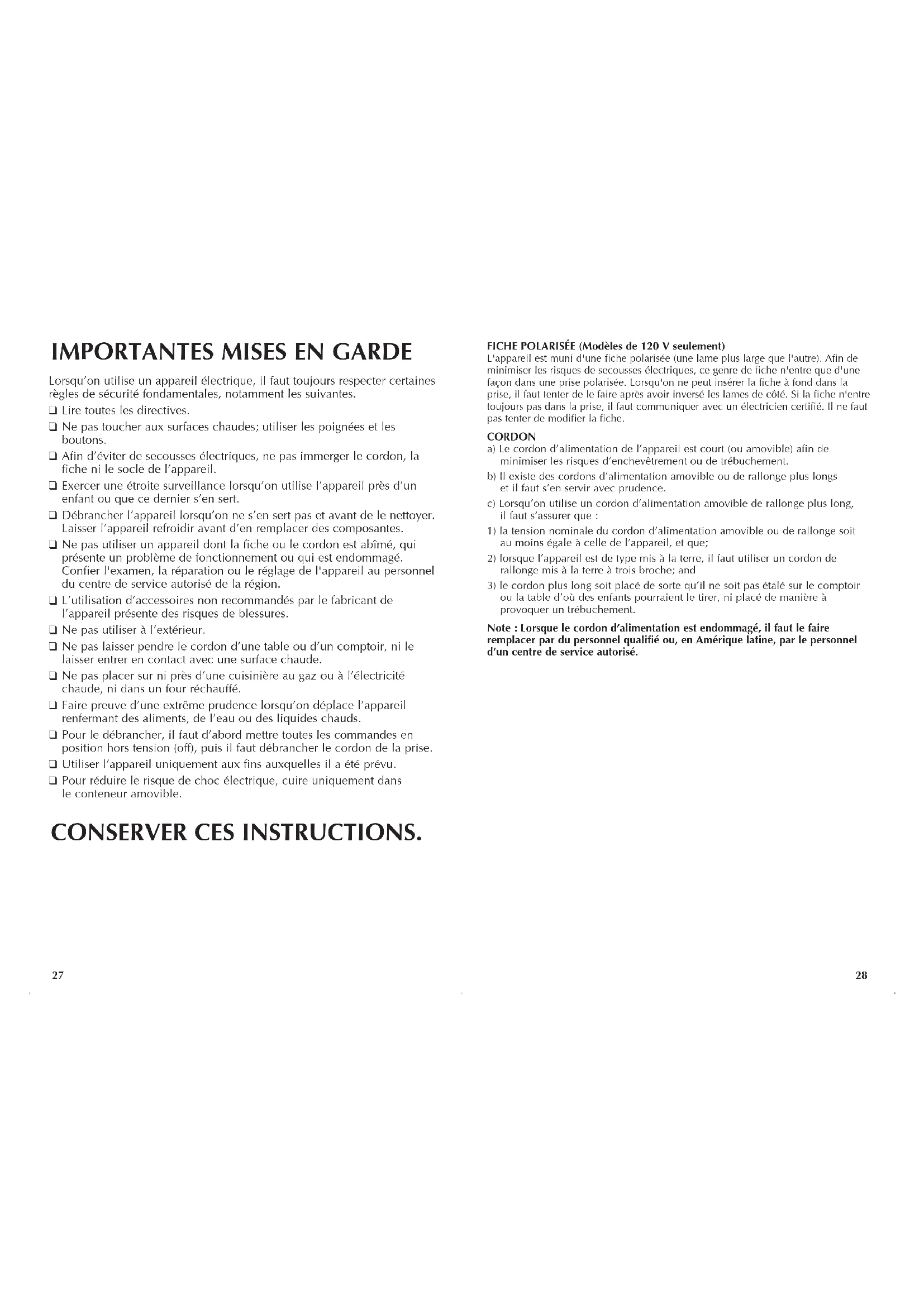 Lire toutes les directives. Ne pas toucher aux surfaces chaudes ; utiliser les poignées et les boutons. Afin d’éviter des secousses électriques, ne pas immerger le cordon, la fiche ni le socle de l’appareil. Exercer une étroite surveillance lorsqu’on utilise l’appareil près d’un enfant ou que ce dernier s’en sert. Débrancher l’appareil lorsqu’on ne s’en sert pas et avant de le nettoyer. Laisser l’appareil refroidir avant d’en remplacer des composantes. Ne pas utiliser un appareil dont la fiche ou le cordon est abimé, qui présente un problème de fonctionnement ou qui est endommagé. Confier l’examen, la réparation ou le réglage de l’appareil au personnel du centre de service autorisé de la région. L’utilisation d’accessoires non recommandés par le fabricant de l’appareil présente des risques de blessures. Ne pas utiliser à l’extérieur. Ne pas laisser pendre le cordon d’une table ou d’un comptoir, ni le laisser en contact avec une surface chaude. Ne pas placer sur ni près d’une cuisinière au gaz ou à l’électricité chaude, ni dans un four réchauffé. Faire preuve d’une extrême prudence lorsqu’on déplace l’appareil renfermant des aliments, de l’eau ou des liquides chauds. Pour le débrancher, il faut d’abord mettre toutes les commandes en position hors tension (off), puis il faut débrancher le cordon de la prise. Utiliser l’appareil uniquement aux fins auxquelles il a été prévu. Pour réduire le risque de choc électrique, cuire uniquement dans le conteneur amovible.