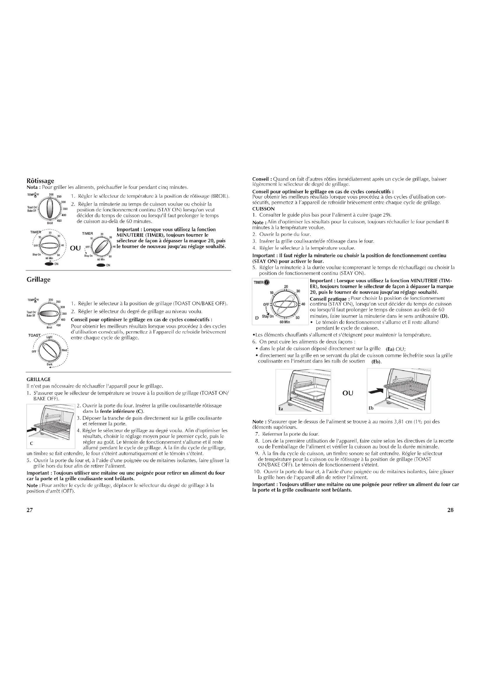 - Retirer tous les matériaux d'emballage et toute étiquette.• Sortir la grille et le plat du four.• Les laver dans de l'eau savonneuse, les rincer et les assécher à l'aide d'un chiffon ou d'un essuie-tout.• Remettre la grille en place dans le four.• Choisir un emplacement pour l'appareil. Celui-ci ne doit pas se trouver sous des armoires ni trop près d'un mur afin de laisser la chaleur circuler sans endommager l'espace de comptoir.1. Régler le sélecteur à la température voulue.2. Régler la minuterie au temps de cuisson voulue, y compris l e temps de réchauffage, ou choisir la position de fonctionnement continu (STAY ON). lorsqu'on veut décider du temps de cuisson ou lorsqu'il faut prolonger le temps de cuisson au-delà de 60 minutes.