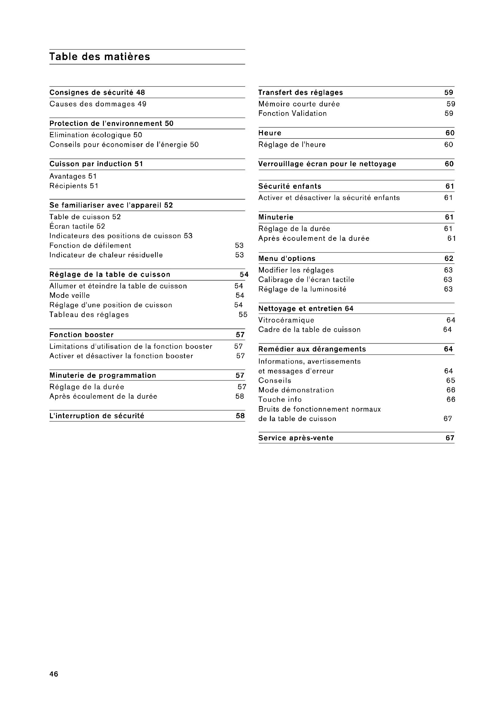 ,QIRUPDWLH 2PGHYHUPRJHQVVWDQGWHYHUDQGHUHQUDDNWXGHFLMIHUV DDQHQJOLMGWXPHWXZYLQJHUQDDUERYHQRIEHQHGHQ45 Klantenservice Indien het apparaat moet worden gerepareerd, staat onze klantenservice voor u klaar. Wij zullen altijd een geschikte oplossing vinden, ook om te voorkomen dat de technicus onnodig bij u langskomt. Vermeld bij de klantenservice het artikelnummer (E- Nr.) en het productienummer (FD-Nr.) zodat wij u op een vakkundige wijze te woord kunnen staan. Het typeplaatje met de nummers vindt u aan de onderkant van het apparaat. Om te voorkomen dat u in geval van een storing lang moet zoeken, kunt u hier de gegevens van uw apparaat en het telefoonnummer van de klantenservice invullen. Houd er rekening mee dat de komst van een servicetechnicus in het geval van een foutieve bediening ook tijdens de garantie niet gratis is. ã Kans op een elektrische schok! Ondeskundige reparaties zijn gevaarlijk.Reparaties mogen uitsluitend worden uitgevoerd door technici die zijn geïnstrueerd door de klantenservice.Is het apparaat defect, haal dan de stekker uit het stopcontact of schakel de zekering in de meterkast uit. Contact opnemen met de klantenservice. De contactgegevens in alle landen vindt u in de bijgesloten lijst met Servicedienstadressen. Verzoek om reparatie en advies bij storingen Vertrouw op de competentie van de producent. Zo bent u er zeker van dat de reparatie wordt uitgevoerd door geschoolde onderhoudstechnici, die beschikken over de originele onderdelen voor uw huishoudelijke apparaten. E-Nr. FD-Nr. Klantenservice O NL 088 424 4030 B 070 222 14846 Table des matières Notice d'utilisation Consignes de sécurité 48 Causes des dommages 49 Protection de l'environnement 50 Elimination écologique 50 Conseils pour économiser de l'énergie 50 Cuisson par induction 51 Avantages 51 Récipients 51 Se familiariser avec l'appareil 52 Table de cuisson 52 Écran tactile 52 Indicateurs des positions de cuisson 53 Fonction de défilement 53 Indicateur de chaleur résiduelle 53 Réglage de la table de cuisson 54 Allumer et éteindre la table de cuisson 54 Mode veille 54 Réglage d'une position de cuisson 54 Tableau des réglages 55 Fonction booster 57 Limitations d'utilisation de la fonction booster 57 Activer et désactiver la fonction booster 57 Minuterie de programmation 57 Réglage de la durée 57 Après écoulement de la durée 58 L'interruption de sécurité 58 Transfert des réglages 59 Mémoire courte durée 59 Fonction Validation 59 Heure 60 Réglage de l'heure 60 Verrouillage écran pour le nettoyage 60 Sécurité enfants 61 Activer et désactiver la sécurité enfants 61 Minuterie 61 Réglage de la durée 61 Après écoulement de la durée 61 Menu d'options 62 Modifier les réglages 63 Calibrage de l'écran tactile 63 Réglage de la luminosité 63 Nettoyage et entretien 64 Vitrocéramique 64 Cadre de la table de cuisson 64 Remédier aux dérangements 64 Informations, avertissements et messages d'erreur 64 Conseils 65 Mode démonstration 66 Touche info 66 Bruits de fonctionnement normaux de la table de cuisson 67 Service après-vente 6747 Vous trouverez des informations supplementaires concernant les produits, accessoires, pièces de rechange et services sur Internet sous : www.gaggenau.com et la boutique en ligne : www.gaggenau-eshop.com48 m Consignes de sécurité Lire attentivement cette notice. Conserver la notice d'utilisation et de montage ainsi que le passeport de l'appareil pour une utilisation ultérieure ou pour de futurs propriétaires. Vérifier votre appareil après l'avoir retiré de l'emballage. S'il a souffert de dommages pendant le transport, ne le branchez pas, contactez le Service technique puis indiquez par écrit les dommages observés, sinon le droit à tout type d'indemnisation sera perdu. Cet appareil doit être installé en respectant la notice de montage ci-incluse. Cet appareil est destiné exclusivement à une utilisation domestique et non professionnelle. Utiliser l'appareil uniquement pour préparer des aliments et des boissons. Le processus de cuisson doit être effectué sous surveillance. Un processus de cuisson court doit être surveillé sans interruption. Utiliser l'appareil uniquement dans des pièces fermées. Cet appareil n'est pas conçu pour un fonctionnement avec une minuterie externe ou une commande à distance. Cet appareil peut être utilisé par des enfants de 8 ans ou plus et par des personnes dotées de capacités physiques, sensorielles ou mentales réduites ou disposant de connaissances ou d’expérience insuffisantes, sous la surveillance d'un tiers responsable de leur sécurité ou bien lorsqu'ils ont reçu des instructions liées à l'utilisation de l'appareil en toute sécurité et qu'ils ont intégré les risques qui en résultent. Les enfants ne doivent pas jouer avec l'appareil. Le nettoyage et l'entretien effectué par l'utilisateur ne doivent pas être accomplis par des enfants, sauf s'ils sont âgés de 8 ans et plus et qu'un adulte les surveille. Les enfants de moins de 8 ans doivent être tenus à distance de l'appareil et du cordon d'alimentation. Risque d'incendie ! ▯ L'huile et la graisse chaude s'enflamme rapidement. Ne jamais laisser l'huile et la graisse chaude sans surveillance. Ne jamais éteindre le feu avec de l'eau. Eteindre le foyer. Etouffer les flammes prudemment avec un couvercle, une couverture ou similaire. Risque d'incendie ! ▯ Les foyers deviennent très chauds. Ne jamais poser des objets inflammables sur la table de cuisson. Ne pas conserver des objets sur la table de cuisson. Risque d'incendie ! ▯ L'appareil devient chaud. Ne jamais ranger des objets inflammables ni d'aérosols dans les tiroirs situés directement sous la table de cuisson. Risque d'incendie ! ▯ La table de cuisson se coupe automatiquement et ne peut plus être réglée. Elle peut ultérieurement se mettre en service involontairement. Couper le fusible dans la boîte à fusibles. Appeler le service aprèsvente. Risque de brûlure ! 