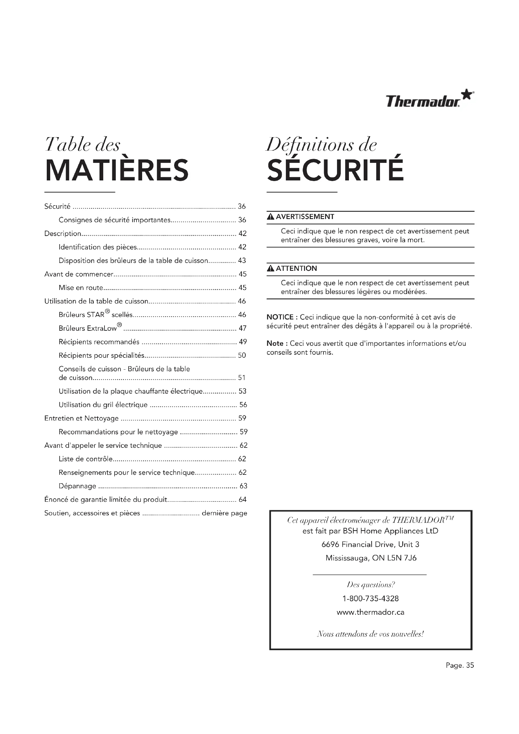 Récipients recommandés ................................................ 49 Récipients pour spécialités.............................................. 50 Conseils de cuisson - Brûleurs de la table de cuisson........................................................................ 51 Utilisation de la plaque chauffante électrique................. 53 Utilisation du gril électrique ............................................ 56 Entretien et Nettoyage .......................................................... 59 Recommandations pour le nettoyage ............................. 59 Avant d'appeler le service technique ..................................... 62 Liste de contrôle.............................................................. 62 Renseignements pour le service technique..................... 62 Dépannage ...................................................................... 63 Énoncé de garantie limitée du produit................................... 64 Soutien, accessoires et pièces ............................. dernière page Définitions de SÉCURITÉ AVERTISSEMENT Ceci indique que le non respect de cet avertissement peut entraîner des blessures graves, voire la mort. ATTENTION Ceci indique que le non respect de cet avertissement peut entraîner des blessures légères ou modérées. NOTICE : Ceci indique que la non-conformité à cet avis de sécurité peut entraîner des dégâts à l'appareil ou à la propriété. Note : Ceci vous avertit que d'importantes informations et/ou conseils sont fournis.Page. 36 Sécurité