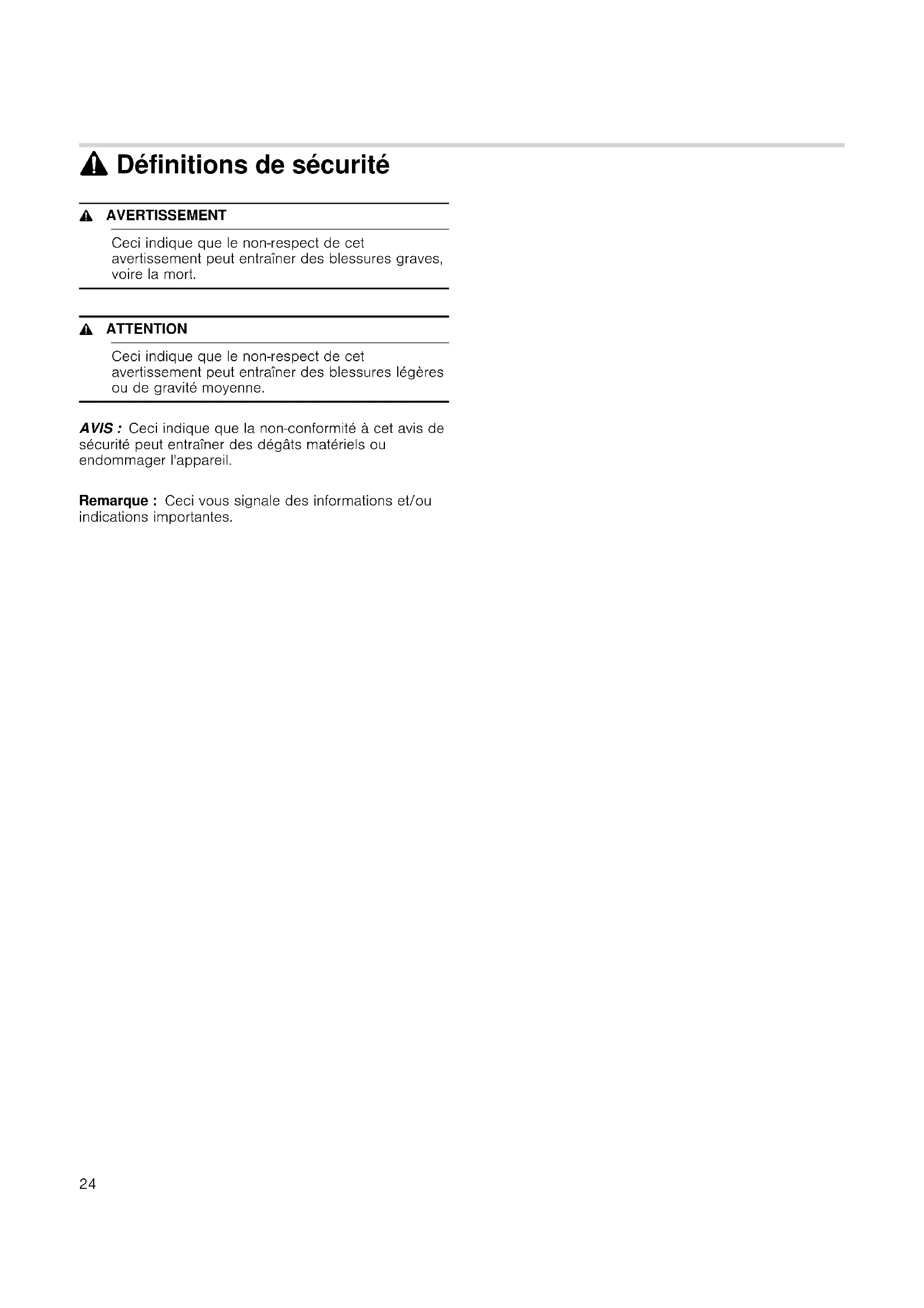 9 Définitions de sécurité Définitions de sécurité 9 AVERTISSEMENT Ceci indique que le non-respect de cet avertissement peut entraîner des blessures graves, voire la mort. 9 ATTENTION Ceci indique que le non-respect de cet avertissement peut entraîner des blessures légères ou de gravité moyenne. AVIS : Ceci indique que la non-conformité à cet avis de sécurité peut entraîner des dégâts matériels ou endommager l'appareil. Remarque : Ceci vous signale des informations et/ou indications importantes.25