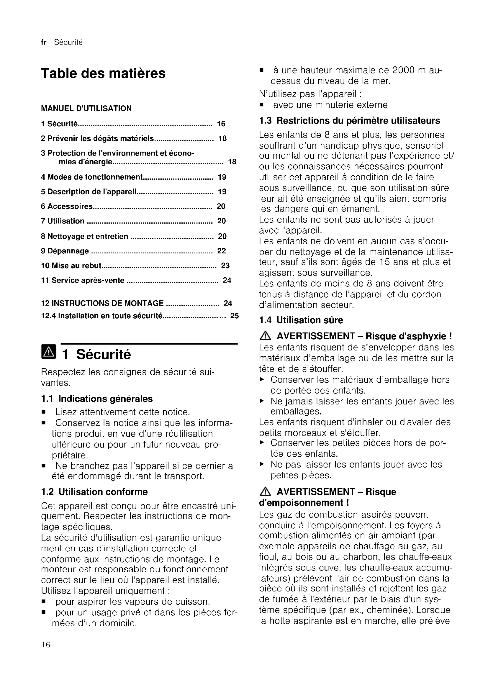 1 Sécurité Respectez les consignes de sécurité sui- vantes. 1.1 Indications générales ¡ Lisez attentivement cette notice. ¡ Conservez la notice ainsi que les informa- tions produit en vue d’une réutilisation ultérieure ou pour un futur nouveau pro- priétaire. ¡ Ne branchez pas l’appareil si ce dernier a été endommagé durant le transport. 1.2 Utilisation conforme Cet appareil est conçu pour être encastré uni- quement. Respecter les instructions de mon- tage spécifiques. La sécurité d'utilisation est garantie unique- ment en cas d'installation correcte et conforme aux instructions de montage. Le monteur est responsable du fonctionnement correct sur le lieu où l'appareil est installé. Utilisez l‘appareil uniquement: ¡ pour aspirer les vapeurs de cuisson. ¡ pour un usage privé et dans les pièces fer- mées d’un domicile. ¡ à une hauteur maximale de 2000m au- dessus du niveau de la mer. N’utilisez pas l’appareil: ¡ avec une minuterie externe 1.3 Restrictions du périmètre utilisateurs Les enfants de 8 ans et plus, les personnes souffrant d’un handicap physique, sensoriel ou mental ou ne détenant pas l’expérience et/ ou les connaissances nécessaires pourront utiliser cet appareil à condition de le faire sous surveillance, ou que son utilisation sûre leur ait été enseignée et qu’ils aient compris les dangers qui en émanent. Les enfants ne sont pas autorisés à jouer avec l'appareil. Les enfants ne doivent en aucun cas s’occu- per du nettoyage et de la maintenance utilisa- teur, sauf s’ils sont âgés de 15ans et plus et agissent sous surveillance. Les enfants de moins de 8ans doivent être tenus à distance de l’appareil et du cordon d’alimentation secteur. 1.4 Utilisation sûre AVERTISSEMENT‒Risque d'asphyxie! Les enfants risquent de s’envelopper dans les matériaux d’emballage ou de les mettre sur la tête et de s’étouffer.