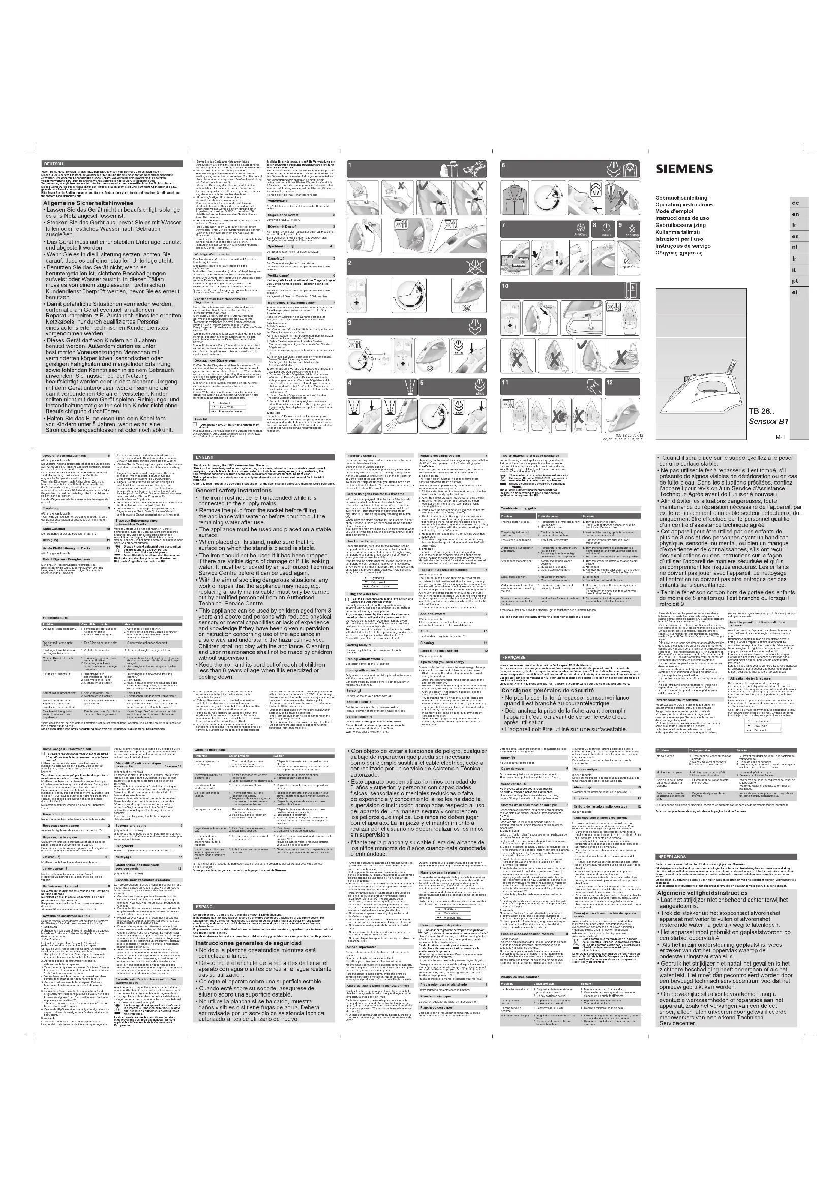 - Keeptheironanditscordoutofreachofchildren lessthan8yearsofagewhenitisenergizedor coolingdown. FRANÇAISENous vous remercions d’avoir acheté le fer à vapeur TB26 de Siemens.Ce fer à repasser a été conçu selon les critères écologiques de développement durable : à partir de l’analyse de son cycle de vie depuis la sélection des matériaux jusqu’à leur réutilisation ou recyclage ; en tenant compte des possibilités d’amélioration d’un point de vue technique, économique et environnemental.Cet appareil est exclusivement conçu pour une utilisation domestique et ne doit en aucun cas être utilisé à des ns industrielles. Lisez attentivement le mode d’emploi de l’appareil et conservez-le pour une consultation ultérieure. Consignes générales de sécurité