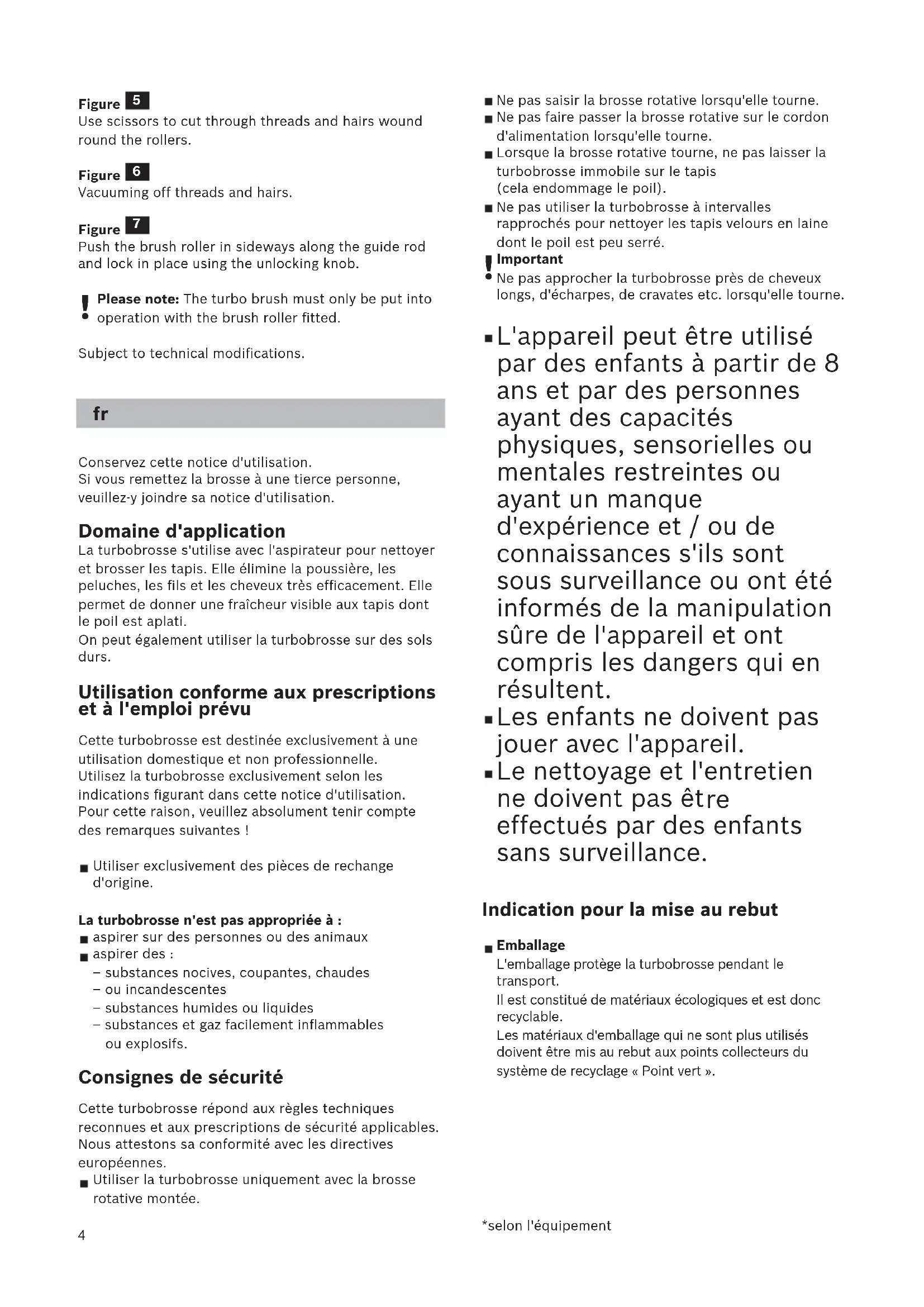 Attention : La turbobrosse doit uniquement être utilisée avec la brosse rotative en place. Sous réserve de modifications techniques.