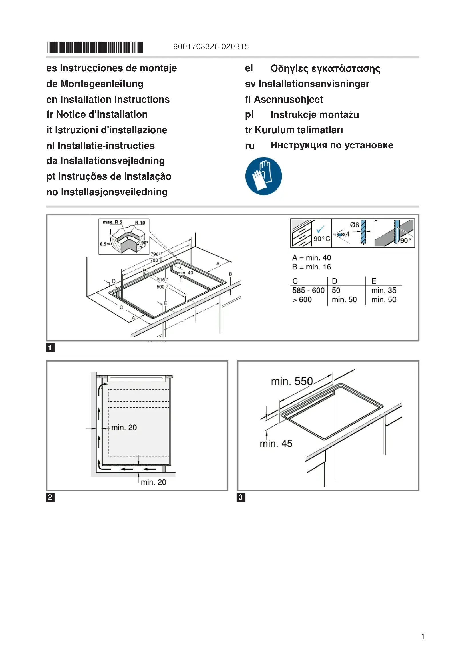 de montage. ‒ Veiller à ce que l'angle du chant de la découpe par rapport au plan de travail soit de 90°.