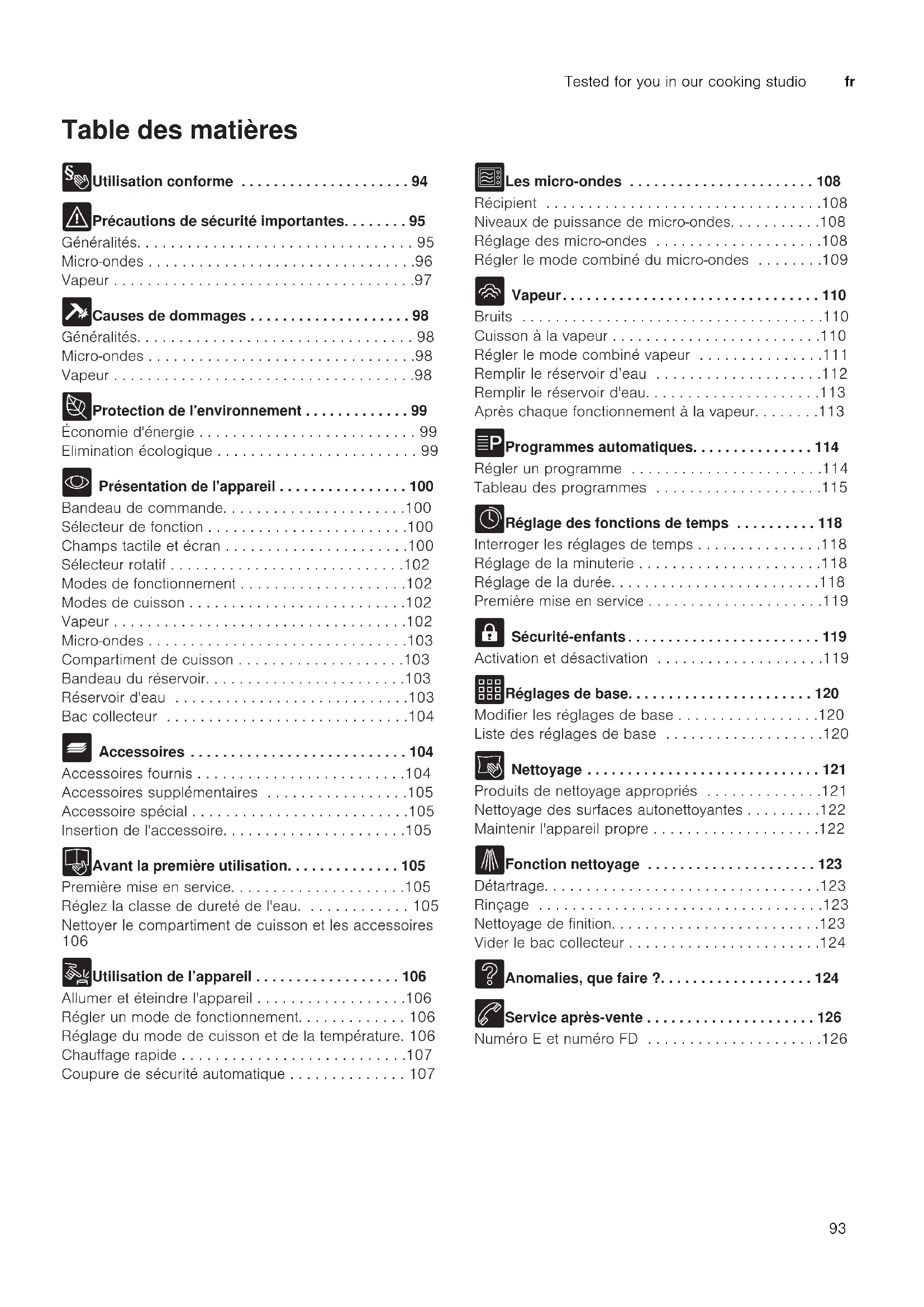 - Présentation de l'appareil . . . . . . . . . . . . . . . . 100 Bandeau de commande. . . . . . . . . . . . . . . . . . . . . .100 Sélecteur de fonction . . . . . . . . . . . . . . . . . . . . . . . .100 Champs tactile et écran . . . . . . . . . . . . . . . . . . . . . .100 Sélecteur rotatif . . . . . . . . . . . . . . . . . . . . . . . . . . . .102 Modes de fonctionnement . . . . . . . . . . . . . . . . . . . .102 Modes de cuisson . . . . . . . . . . . . . . . . . . . . . . . . . .102 Vapeur . . . . . . . . . . . . . . . . . . . . . . . . . . . . . . . . . . .102 Micro-ondes . . . . . . . . . . . . . . . . . . . . . . . . . . . . . . .103 Compartiment de cuisson . . . . . . . . . . . . . . . . . . . .103 Bandeau du réservoir. . . . . . . . . . . . . . . . . . . . . . . .103 Réservoir d'eau . . . . . . . . . . . . . . . . . . . . . . . . . . . .103 Bac collecteur . . . . . . . . . . . . . . . . . . . . . . . . . . . . .104 _ Accessoires . . . . . . . . . . . . . . . . . . . . . . . . . . . 104 Accessoires fournis . . . . . . . . . . . . . . . . . . . . . . . . .104 Accessoires supplémentaires . . . . . . . . . . . . . . . . .105 Accessoire spécial . . . . . . . . . . . . . . . . . . . . . . . . . .105 Insertion de l'accessoire. . . . . . . . . . . . . . . . . . . . . .105 K Avant la première utilisation. . . . . . . . . . . . . . 105 Première mise en service. . . . . . . . . . . . . . . . . . . . .105 Réglez la classe de dureté de l'eau. . . . . . . . . . . . . 105 Nettoyer le compartiment de cuisson et les accessoires