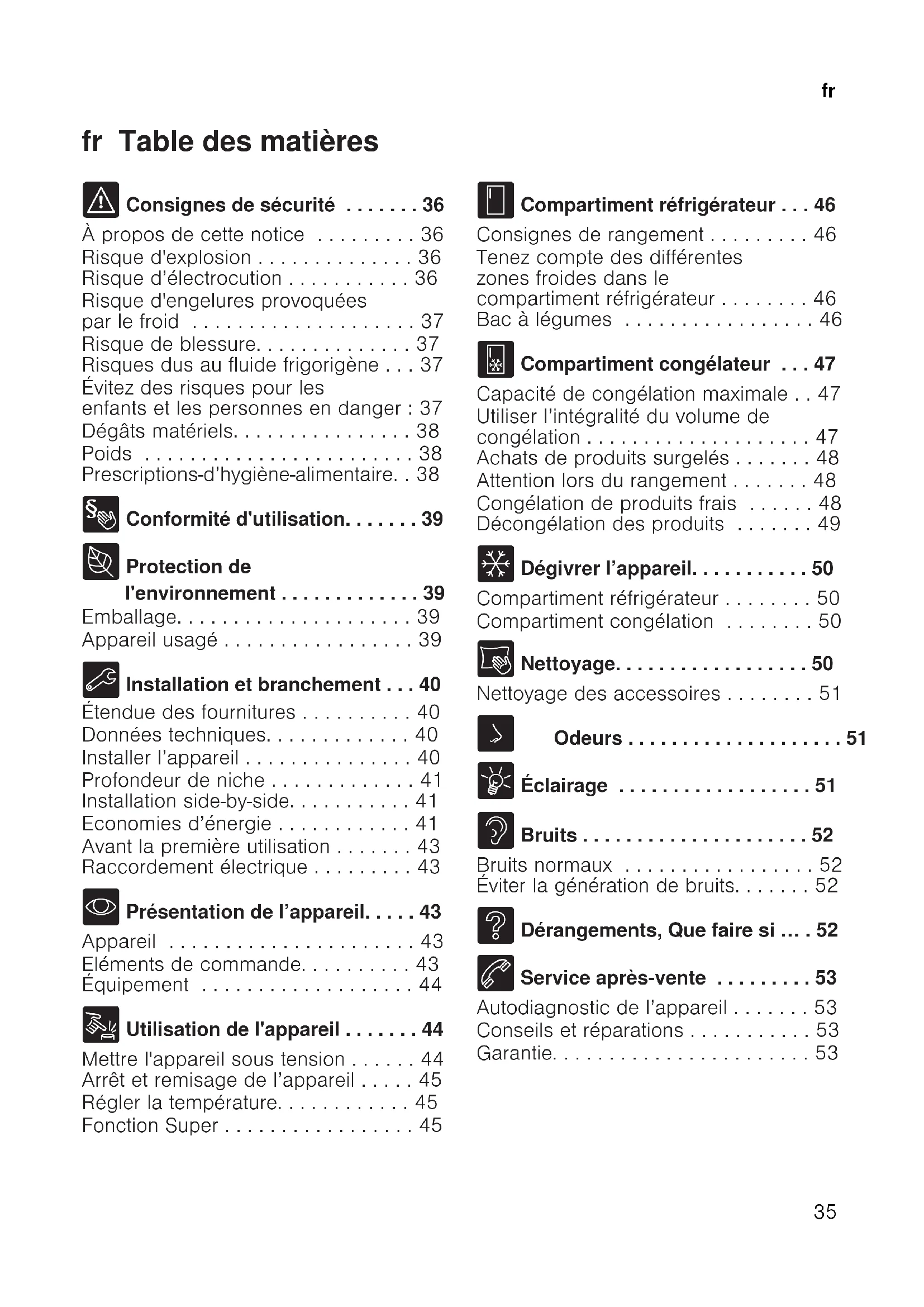 - fr Table des matières fr Notice d'utilisation ( Consignes de sécurité p. 36