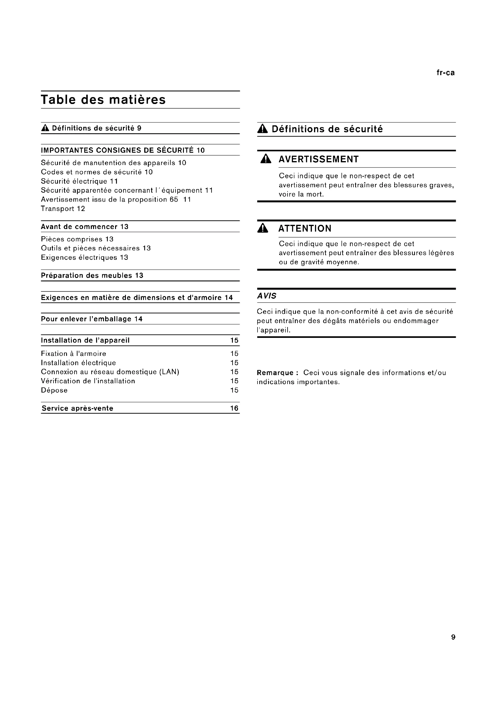 9 AVERTISSEMENT Si l’information de ce guide n’est pas suivie exactement, il peut en résulter un incendie ou un choc électrique causant des dommages à la propriété, des blessures ou la mort. 9 AVERTISSEMENT Ne réparez, remplacez, ni ne retirez aucune partie de l'appareil, excepté si les manuels recommandent de le faire. Une installation, un entretien ou une inspection incorrects peuvent occasionner des blessures ou des dommages matériels. Reportez-vous au présent manuel pour obtenir des indications. Toute autre intervention doit être effectuée par un technicien agréé. Sécurité de manutention des appareils Cet appareil est lourd et il faut au moins deux personnes ou l´équipement approprié pour le déplacer. Ne pas soulever I´appareil par la poignée de la porte. Codes et normes de sécurité Cet appareil est conforme aux plus récentes versions de l'une ou plus des normes suivantes : ▯ CAN/CSA C22.2 No. 61 - Cuisinières pour usage ménager (Household Cooking Ranges) ▯ UL 858 - Cuisinières électriques domestiques (Household Electric Ranges) ▯ CAN/CSA C22.2 No. 150 - Fours à micro-ondes (Microwave Ovens) ▯ UL 923 - Appareils de cuisson à micro- ondes (Microwave Cooking Appliances) ▯ CSA C22.2 No. 64 - Appareils de cuisson domestique et de chauffage des liquides (Household Cooking and Liquid-Heating Appliances) ▯ UL 1026 - Appareils électriques domestiques pour la cuisson et la préparation des aliments (Electric Household Cooking and Food Serving Appliances) Il incombe au propriétaire et à l'installateur de déterminer si des exigences et/ou normes additionnelles s'appliquent pour des installations spécifiques. Certaines surfaces peuvent avoir des bords tranchants. Faire attention en étendant le bras derrière l’appareil ou en dessous.11