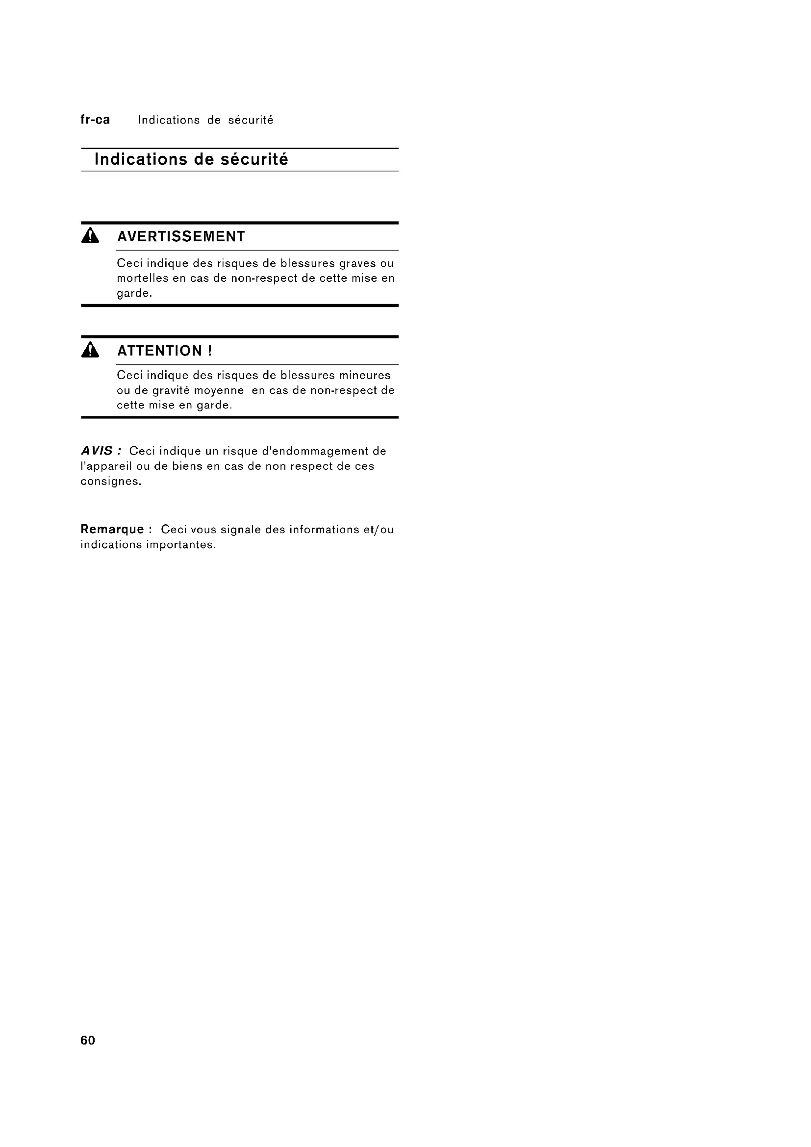 Indications de sécurité Indicati ons de sécuri té 9 AVERTISSEMENT Ceci indique des risques de blessures graves ou mortelles en cas de non-respect de cette mise en garde. 9 ATTENTION ! Ceci indique des risques de blessures mineures ou de gravité moyenne en cas de non-respect de cette mise en garde. AVIS : Ceci indique un risque d'endommagement de l'appareil ou de biens en cas de non respect de ces consignes. Remarque : Ceci vous signale des informations et/ou indications importantes.9 CONSIGNES DE SÉCURITÉ IMPORTANTES