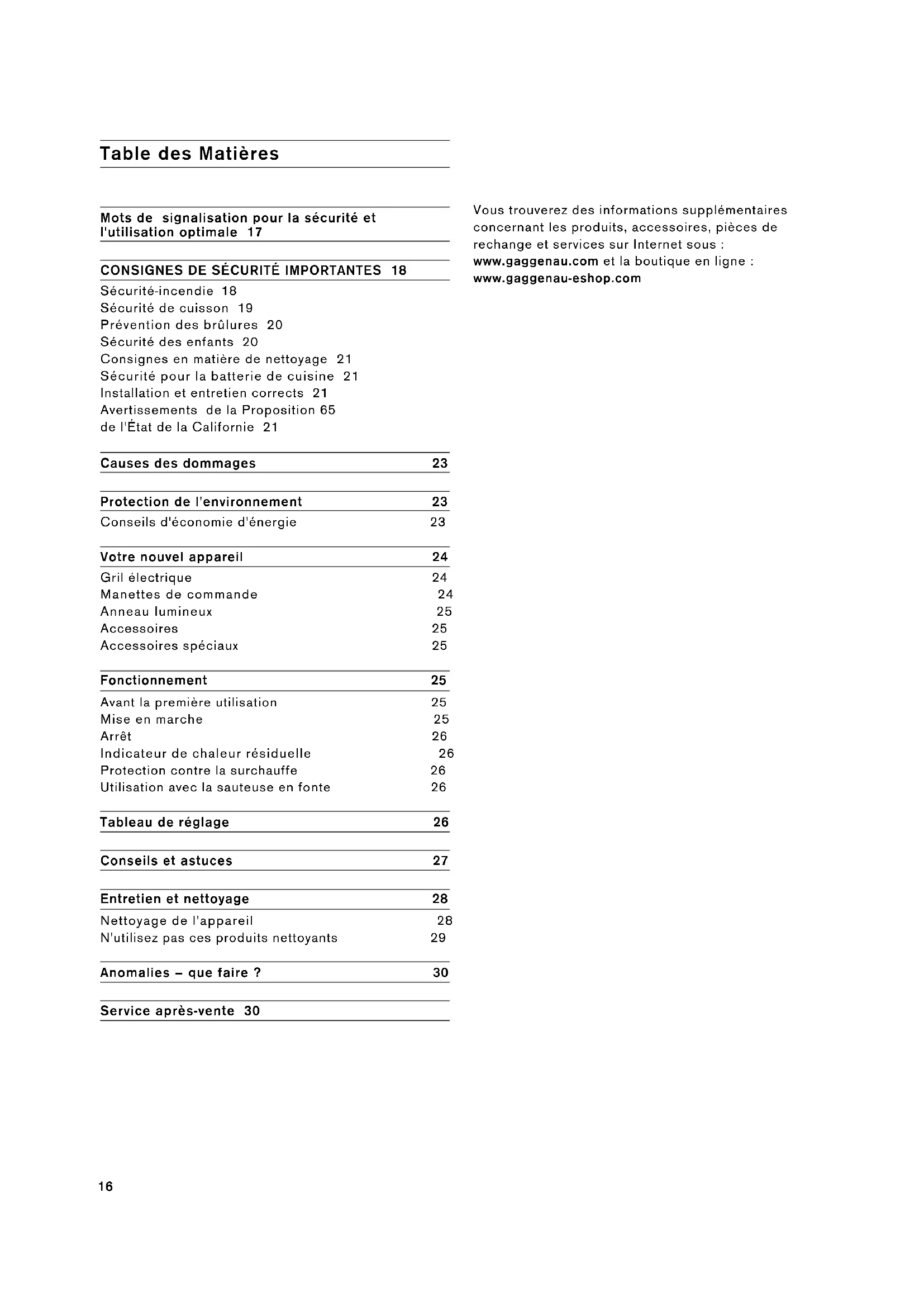 Sécurité-incendie 18 Sécurité de cuisson 19 Prévention des brûlures 20 Sécurité des enfants 20 Consignes en matière de nettoyage 21 Sécurité pour la batterie de cuisine 21 Installation et entretien corrects 21 Avertissements de la Proposition 65 de l'État de la Californie 21 Causes des dommages 23 Protection de l'environnement 23 Conseils d'économie d'énergie 23 Votre nouvel appareil 24 Gril électrique 24 Manettes de commande 24 Anneau lumineux 25 Accessoires 25 Accessoires spéciaux 25 Fonctionnement 25 Avant la première utilisation 25 Mise en marche 25 Arrêt 26 Indicateur de chaleur résiduelle 26 Protection contre la surchauffe 26 Utilisation avec la sauteuse en fonte 26 Tableau de réglage 26 Conseils et astuces 27 Entretien et nettoyage 28 Nettoyage de l'appareil 28 N'utilisez pas ces produits nettoyants 29 Anomalies – que faire ? 30 Service après-vente 30 Vous trouverez des informations supplémentaires concernant les produits, accessoires, pièces de rechange et services sur Internet sous : www.gaggenau.com et la boutique en ligne : www.gaggenau-eshop.com17 Mots de signalisation pour la sécurité et l'utilisation optimale 9 AVERTISSEMENT Le non-respect de cet avertissement peut entraîner la mort ou des blessures graves. 9 ATTENTION Le non-respect de cet avertissement peut entraîner des blessures mineures ou modérées. AVIS : Vous indique que des dommages à l'appareil ou aux biens peuvent survenir si vous ne respectez pas cet avertissement. Remarque : Vous signale des informations importantes ou des conseils.18