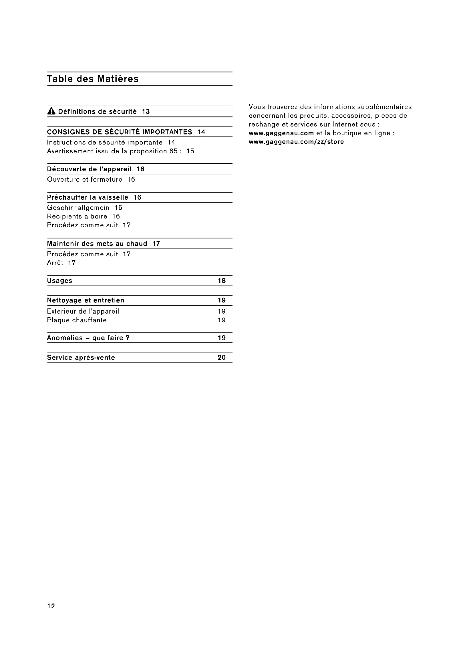 Instructions de sécurité importante 14 Avertissement issu de la proposition 65 : 15 Découverte de l'appareil 16 Ouverture et fermeture 16 Préchauffer la vaisselle 16 Geschirr allgemein 16 Récipients à boire 16 Procédez comme suit 17 Maintenir des mets au chaud 17 Procédez comme suit 17 Arrêt 17 Usages 18 Nettoyage et entretien 19 Extérieur de l'appareil 19 Plaque chauffante 19 Anomalies – que faire ? 19 Service après-vente 20 Vous trouverez des informations supplémentaires concernant les produits, accessoires, pièces de rechange et services sur Internet sous : www.gaggenau.com et la boutique en ligne : www.gaggenau.com/zz/store13 9 Définitions de sécurité Définitions de sécuri té 9 AVERTISSEMENT Ceci indique que le non-respect de cet avertissement peut entraîner des blessures graves, voire la mort. 9 ATTENTION Ceci indique que le non-respect de cet avertissement peut entraîner des blessures légères ou de gravité moyenne. AVIS : Ceci indique que la non-conformité à cet avis de sécurité peut entraîner des dégâts matériels ou endommager l'appareil. Remarque : Ceci vous signale des informations et/ou indications importantes.9 CONSIGNES DE SÉCURITÉ IMPORTANTES LISEZ TOUTES LES INSTRUCTIONS AVANT D'UTILISER L'APPAREIL