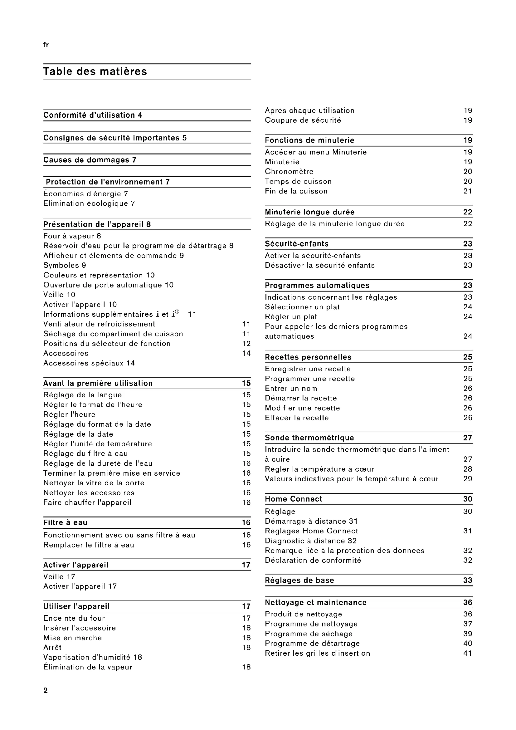 Consignes de sécurité importantes Consignes de sécuri t é importantes m Mise en garde – Risque d'incendie ! ▯ Tout objet inflammable entreposé dans le compartiment de cuisson peut s'enflammer. Ne jamais entreposer d'objets inflammables dans le compartiment de cuisson. Ne jamais ouvrir la porte de l'appareil lorsqu'il s'en dégage de la fumée. Éteindre l'appareil et débrancher la fiche secteur ou enlever le fusible dans le boîtier à fusibles. Risque d'incendie ! ▯ Il se produit un courant d'air lors de l'ouverture de la porte de l'appareil. Le papier sulfurisé peut toucher les résistances chauffantes et s'enflammer. Ne jamais poser de papier sulfurisé non attaché sur un accessoire lors du préchauffage. Toujours déposer un plat ou un moule de cuisson sur le papier sulfurisé pour le lester. Recouvrir uniquement la surface nécessaire de papier sulfurisé. Le papier sulfurisé ne doit pas dépasser des accessoires. m Mise en garde – Risque de brûlure ! ▯ L'appareil devient très chaud. Ne jamais toucher les surfaces intérieures chaudes du compartiment de cuisson ni les résistances chauffantes. Toujours laisser l'appareil refroidir. Tenir les enfants éloignés. Cet appareil et ses parties accessibles deviennent chauds pendant leur utilisation. Il convient de veiller à ne pas toucher les éléments chauffants. Il convient de maintenir à distance les enfants de moins de 8ans à moins qu’ils ne soient sous une surveillance continue. Risque de brûlure ! ▯ Les récipients ou les accessoires deviennent très chaud. Toujours utiliser des maniques pour retirer le récipient ou les accessoires du compartiment de cuisson. Risque de brûlure ! ▯ Les vapeurs d'alcool peuvent s'enflammer dans un compartiment de cuisson chaud. Ne jamais préparer de plats contenant de grandes quantités de boissons fortement alcoolisées. Utiliser uniquement de petites quantités de boissons fortement alcoolisées. Ouvrir la porte de l'appareil avec précaution. Risque de brûlure ! ▯ De la vapeur chaude peut s'échapper lors du fonctionnement. Ne pas toucher les orifices d'aération. Eloigner les enfants. m Mise en garde – Risque de brûlures ! ▯ De la vapeur chaude peut s'échapper lorsque vous ouvrez la porte de l'appareil. La vapeur n'est pas visible selon sa température. Ne pas se placer trop près de l'appareil lors de l'ouverture. Ouvrir prudemment la porte de l'appareil. Eloigner les enfants. Risque de brûlure ! ▯ Du liquide chaud peut déborder lors de l'enlèvement de l'accessoire. Retirer l'accessoire chaud prudemment avec des gants isolants. m Mise en garde – Risque de choc électrique ! ▯ Tenter de réparer vous-même l'appareil est dangereux. Seul un technicien du service après-vente formé par nos soins est habilité à effectuer des réparations et à remplacer des câbles d'alimentation défectueux. Si l'appareil est défectueux, débrancher la fiche secteur ou enlever le fusible dans le tableau électrique. Appeler le service après-vente. Risque de choc électrique ! ▯ L'isolation des câbles des appareils électroménagers peut fondre au contact des pièces chaudes de l'appareil. Ne jamais mettre le câble de raccordement des appareils électroménagers en contact avec des pièces chaudes de l'appareil.6 fr Consignes de sécurité importantes Risque de choc électrique ! ▯ De l'humidité qui pénètre peut occasionner un choc électrique. Ne pas utiliser de nettoyeur haute pression ou de nettoyeur à vapeur. Risque de choc électrique ! ▯ Un appareil défectueux peut provoquer un choc électrique. Ne jamais mettre en service un appareil défectueux. Débrancher la fiche secteur ou enlever le fusible dans le boîtier à fusibles. Appeler le service après-vente. Risque de choc électrique ! ▯ L'isolation peut être endommagée en cas de capteur de la température à cœur non approprié. Utiliser exclusivement le capteur de la température à cœur affecté à l'appareil. m Mise en garde – Risque de blessure ! ▯ Les pastilles de détartrage peuvent provoquer des brûlures dans la bouche, la gorge, les yeux et sur la peau. Respectez les consignes de sécurité figurant sur l'emballage des pastilles de détartrage. Évitez tout contact entre la peau et les pastilles de détartrage. Tenez les pastilles de détartrage hors de portée des enfants. Risque de blessure ! ▯ La solution détartrante peut provoquer des brûlures dans la bouche, la gorge, les yeux et sur la peau. Évitez tout contact entre la peau et la solution détartrante. Éloignez les enfants de la solution détartrante. Ne buvez pas la solution détartrante. La solution détartrante ne doit pas entrer en contact avec des aliments. Rincez soigneusement le réservoir d'eau avant de réutiliser l'appareil. m Mise en garde – Risque de blessure ! La lumière des lampes LED est très éblouissante et peut causer des dommages aux yeux (groupe de risque 1). Ne pas regarder plus longtemps que 100secondes directement les lampes LED allumées.7 Causes de dommages