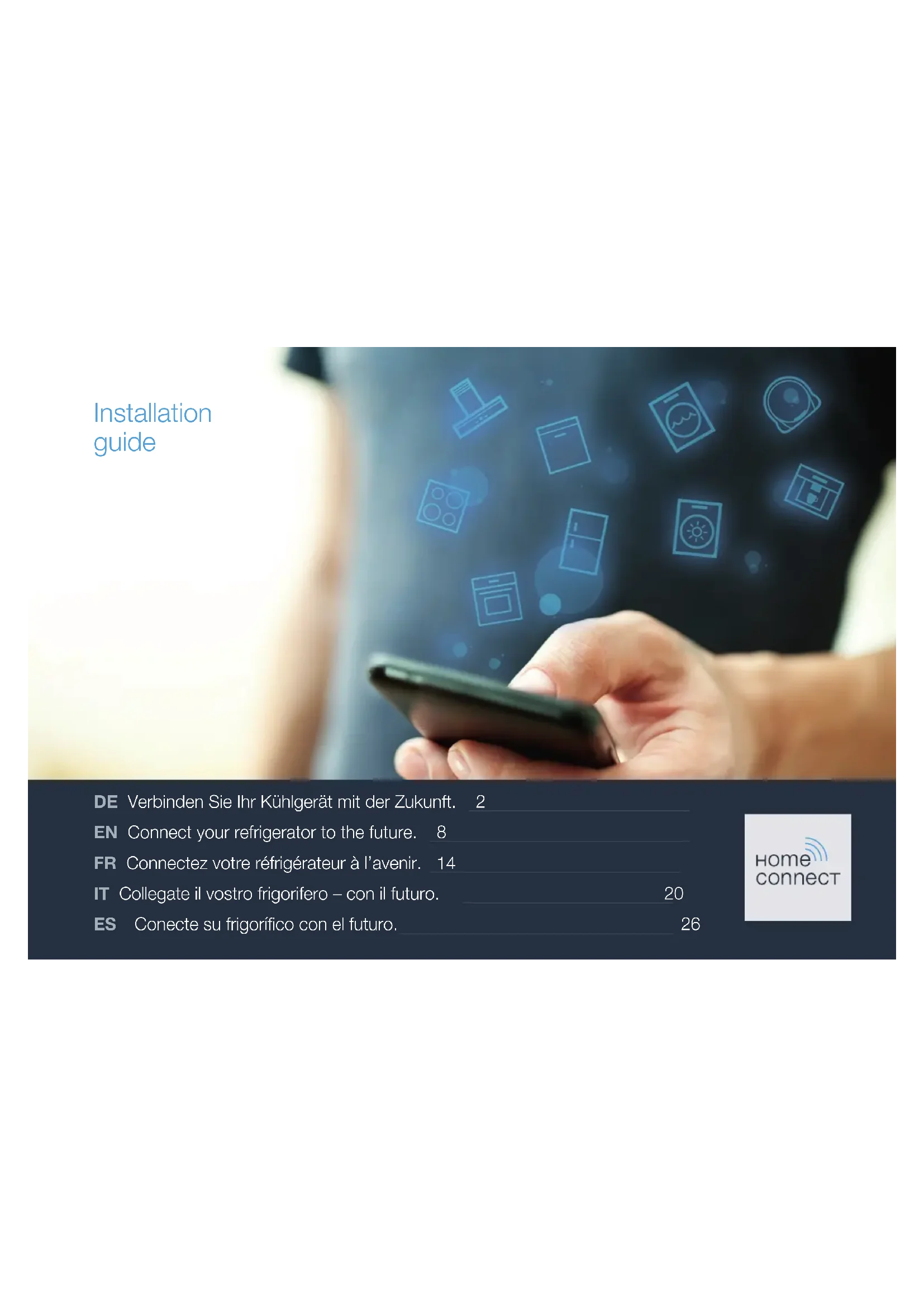 313 EN Step 3: Connect your refrigerator to the HomeConnectapp Please enter step 3 only when prompted to by the app. The following steps describe operations at the appliance itself. 1 | OpentheHome network menu on your refrigerator. 2 | Pressbutton to move to menu item Connect to app. 3 | Press buttontoopenthemenuitem. Connect to the app 4 | Thefollowingmessageappearsonthecontrolpanelofyour refrigerator:.Connect to mobile device. 5 | Pressbutton toconrm. Theappwillnowattempttoconnecttotherefrigerator.The followingmessageappearsonthecontrolpanelofyour refrigerator:Synchronization is running. Synchronization is running 6 | Followtheinstructionsintheapptocompletetheprocess. Whenconnectionissuccessful,thefollowingmessage appearsonthecontrolpanelofyourrefrigerator: Connection to app successful. Connection to app successful 7 | Pressbutton toconrm. Thefollowingmessageappearsinthestatusbarofthe controlpanel . 8 | Followtheinstructionsintheapp. Information: If the connection could not be established make sureyoursmartphone/tabletiswithinrangeofyour Wi-Finetwork. 314 DE Nousvousfélicitonspourl’achatdevotrenouvelappareilélectroménagerintelligentetpourla nouvelleexpériencequotidiennequivousattendavecHomeConnect.* HomeConnectvousfaciliteeneffetlecontrôledevosappareilsélectroménagers:dulave-linge aufourenpassantparlamachineàcaféoul’aspirateur. L’appliHomeConnectvousdonneaccèsàtoutmomentàdesinformationsimportanteset utilesconcernantvotreappareilélectroménager.Vouspouvezainsicontrôlerlesfonctions devotreappareilélectroménageretlesadapterindividuellementàvosbesoins.L’applivous accompagneenoutredanslamaintenanceoptimaledevotreappareilélectroménageretdonne desailesàvotreinspirationgrâceàunlargeéventailderecettes.Découvrezl’écosystème HomeConnect,dontlespartenairesvousoffrentencoreplusdefonctionnalitésetdeservices. HomeConnectvousouvredenombreusespossibilitésquevousn’attendezpasd’unappareil électroménager. *LadisponibilitédelafonctionHomeConnectdépenddel’offredeservicesHomeConnectdansvotrepays.Lesservices HomeConnectnesontpasdisponiblesdanstouslespays.Voustrouverezdeplusamplesinformationsàcesujetàl’adresse www.home-connect.com. Bienvenue dans une maison interconnectée!15 FR Découvrezlespossibilitésde HomeConnect Gérez votre appareil électroménager Dansl’appli,l’aperçudesappareilsvousmontretousles appareilsélectroménagersconnectésetvousdonneaccès àdesinformationsimportantesetutiles.Vouspouvezainsi contrôler,parexemple,lesfonctionsdevotreappareil électroménagersetlesadapteràvosbesoinsindividuels. Venez trouver l’inspiration LarubriqueRecettescontientunegrandevariétéde recettesinspirantes,deconseilsetdevidéosquifontde lacuisineetdelapâtisserieuneexpérienceencoreplus agréable. Aide et assistance LarubriqueServicefournitdesinformationsprécieusespour lamaintenanceetl’utilisationconformedevotreappareil électroménagers. Encore plus d’avantages Notreréseaudepartenairesaugmenteenpermanence. Voustrouverezlalistedetousnospartenairessous www.home-connect.com. En avant ! Dequoiavez-vousbesoin? 1 | Votre réfrigérateur branché au secteur et allumé. 2 | Unsmartphoneouunetablettedoté(e)delaversionactuelle deleursystèmed’exploitation. 3 | VotreréfrigérateuràportéedusignalWLANdevotreréseau domestique. 4 | Lenom(SSID)etlemotdepasse(Key)devotreréseau domestiqueWLAN. 5 | Laprésentenoticed’installation. Informationimportante: Sécurité des données:pourHomeConnect,la sécuritédesdonnéesaprioritéabsolue.L’échange desdonnéess’effectuetoujoursdemanière cryptée.HomeConnectmetenplacedesmesures desécuritéquisontcontrôléesetactualisées régulièrement.Pourensavoirplus,consultezlesite www.home-connect.com. Sécurité de l’appareil:pourutiliservotreappareil électroménager en toute sécurité avec la fonction HomeConnect,veuilleztenircomptedesconsignes desécuritégurantdanslemoded’emploidevotre appareil.16 FR Étape 2 : connecter le réfrigérateur au réseaudomestique 1 | Votreréfrigérateurestdéjàbranchéausecteuretallumé. 2 | Ouvrezl’appliHomeConnectpourajoutervotreréfrigérateur. 3 | Suivezlesinstructionsgurantdansl’applietnevousréférez auxprésentesinstructionsquesil’applivousyinvite. Remarque: Noustravaillonsconstammentàaméliorerl’appli HomeConnect.Cecipeutentraînerdesdifférences danslesétapesdeconnexion.Veuillezsuivreles instructionsdeladernièreversiondevotreappli HomeConnect.Ellesvousguidenttoutaulongdu processusdeconnexion. Étape 1 :téléchargerl’appli HomeConnectetcréeruncompte d’utilisateur 1 | Survotresmartphoneouvotretablette,ouvrezl’AppStore (pourlesappareilsApple)ouGooglePlayStore(pourles appareilsAndroid). 2 | Recherchez«HomeConnect»dansleStoreetinstallez l’appli. AppliHomeConnect: 3 | Ouvrezl’applietenregistrez-vousandecréeruncompte utilisateurHomeConnect. 4 | Notezlesdonnéesd’accèsàHomeConnect(compte utilisateuretmotdepasse)-vousenaurezbesoinplustard. L’applivousguideàtraverslesétapesnécessairespour connectervotreappareilàHomeConnect.L’appliseréfèreà laprésentenotice,sinécessaire.17 FR Étape 2.1: connectez votre réfrigérateur à votreréseaudomestiqueavecWPS Suivez les instructions gurant à l’étape 2.1 uniquement lorsque l’appli vous y invite. Les étapes suivantes décrivent la commande au niveau de l’appareil électroménager. 1 | AppuyezsurlatoucheSpourouvrirlemenuprincipal. 2 | Avec la touche ,faitesdélerjusqu’aupointdemenu Réglages de base . 3 | Pourouvrirlepointdemenu,appuyezsurlatouche