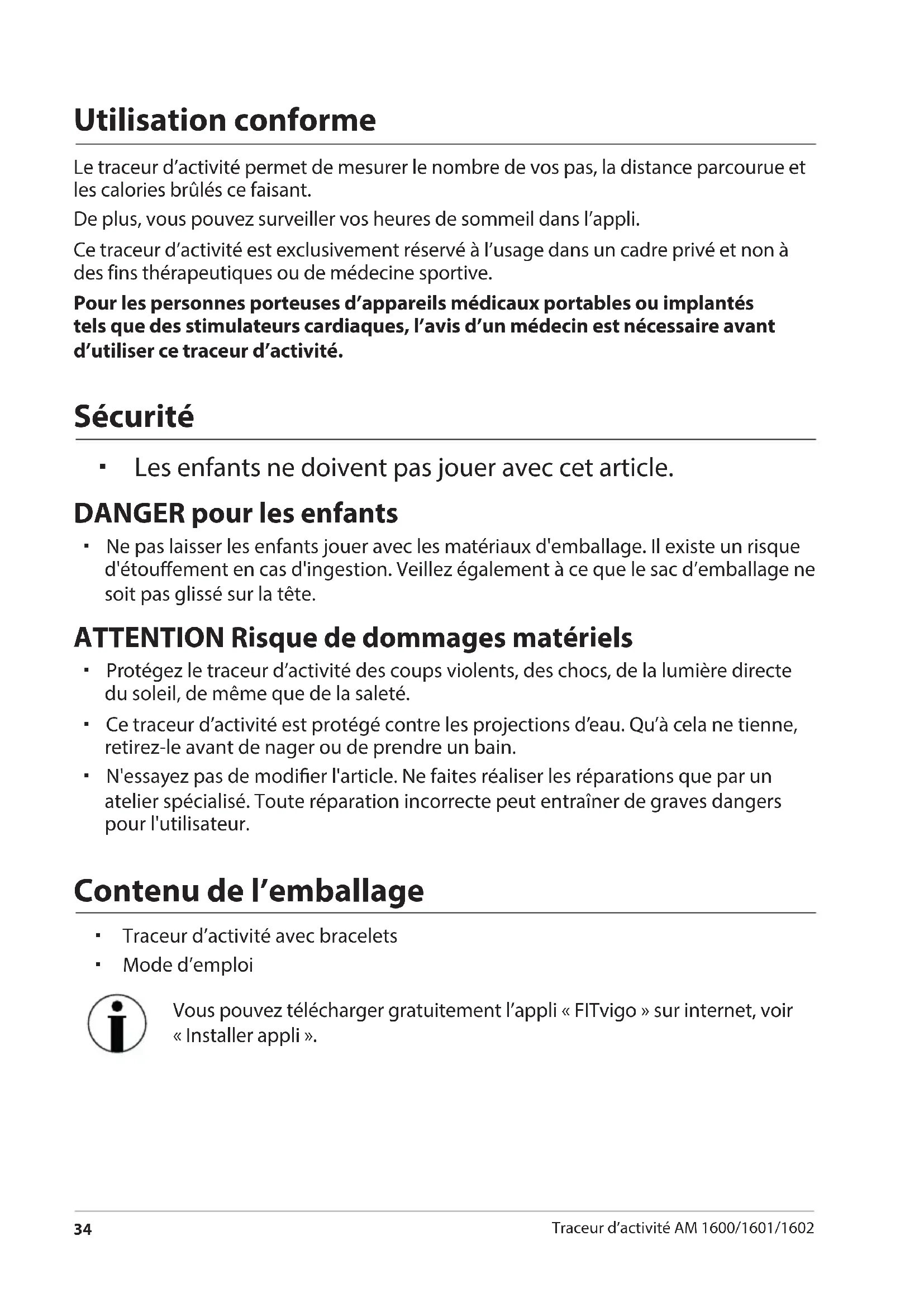 Traceur d’activité AM 1600/1601/1602 Utilisation conforme Le traceur d’activité permet de mesurer le nombre de vos pas, la distance parcourue et les calories brûlés ce faisant. De plus, vous pouvez surveiller vos heures de sommeil dans l’appli. Ce traceur d’activité est exclusivement réservé à l’usage dans un cadre privé et non à des fins thérapeutiques ou de médecine sportive. Pour les personnes porteuses d’appareils médicaux portables ou implantés tels que des stimulateurs cardiaques, l’avis d’un médecin est nécessaire avant d’utiliser ce traceur d’activité. Sécurité Les enfants ne doivent pas jouer avec cet article. DANGER pour les enfants Ne pas laisser les enfants jouer avec les matériaux d'emballage. Il existe un risque d'étouement en cas d'ingestion. Veillez également à ce que le sac d’emballage ne soit pas glissé sur la tête. ATTENTION Risque de dommages matériels Protégez le traceur d’activité des coups violents, des chocs, de la lumière directe du soleil, de même que de la saleté. Ce traceur d’activité est protégé contre les projections d’eau. Qu’à cela ne tienne, retirez-le avant de nager ou de prendre un bain. N'essayez pas de modier l'article. Ne faites réaliser les réparations que par un atelier spécialisé. Toute réparation incorrecte peut entraîner de graves dangers pour l'utilisateur. Contenu de l’emballage Traceur d’activité avec bracelets Mode d’emploi Vous pouvez télécharger gratuitement l’appli «FITvigo» sur internet, voir «Installer appli». Druckbuch M 1600_01_02 Langanleitung.indb 34 11.10.2016 12:45:31Vue d’ensemble