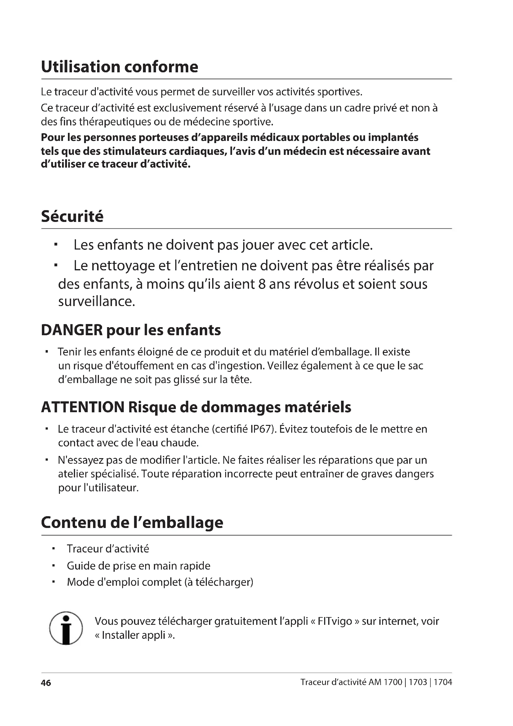 Traceur d’activité AM 1700 | 1703 | 1704 Utilisation conforme Le traceur d'activité vous permet de surveiller vos activités sportives. Ce traceur d’activité est exclusivement réservé à l’usage dans un cadre privé et non à des fins thérapeutiques ou de médecine sportive. Pour les personnes porteuses d’appareils médicaux portables ou implantés tels que des stimulateurs cardiaques, l’avis d’un médecin est nécessaire avant d’utiliser ce traceur d’activité. Sécurité Les enfants ne doivent pas jouer avec cet article. Le nettoyage et l’entretien ne doivent pas être réalisés par des enfants, à moins qu’ils aient 8 ans révolus et soient sous surveillance. DANGER pour les enfants Tenir les enfants éloigné de ce produit et du matériel d’emballage. Il existe un risque d'étouement en cas d'ingestion. Veillez également à ce que le sac d’emballage ne soit pas glissé sur la tête. ATTENTION Risque de dommages matériels Le traceur d'activité est étanche (certié IP67). Évitez toutefois de le mettre en contact avec de l'eau chaude. N'essayez pas de modier l'article. Ne faites réaliser les réparations que par un atelier spécialisé. Toute réparation incorrecte peut entraîner de graves dangers pour l'utilisateur. Contenu de l’emballage Traceur d’activité Guide de prise en main rapide Mode d'emploi complet (à télécharger) Vous pouvez télécharger gratuitement l’appli «FITvigo» sur internet, voir «Installer appli». Druckbuch AM 1700.indb 46 24.08.2017 14:08:01Vue d’ensemble