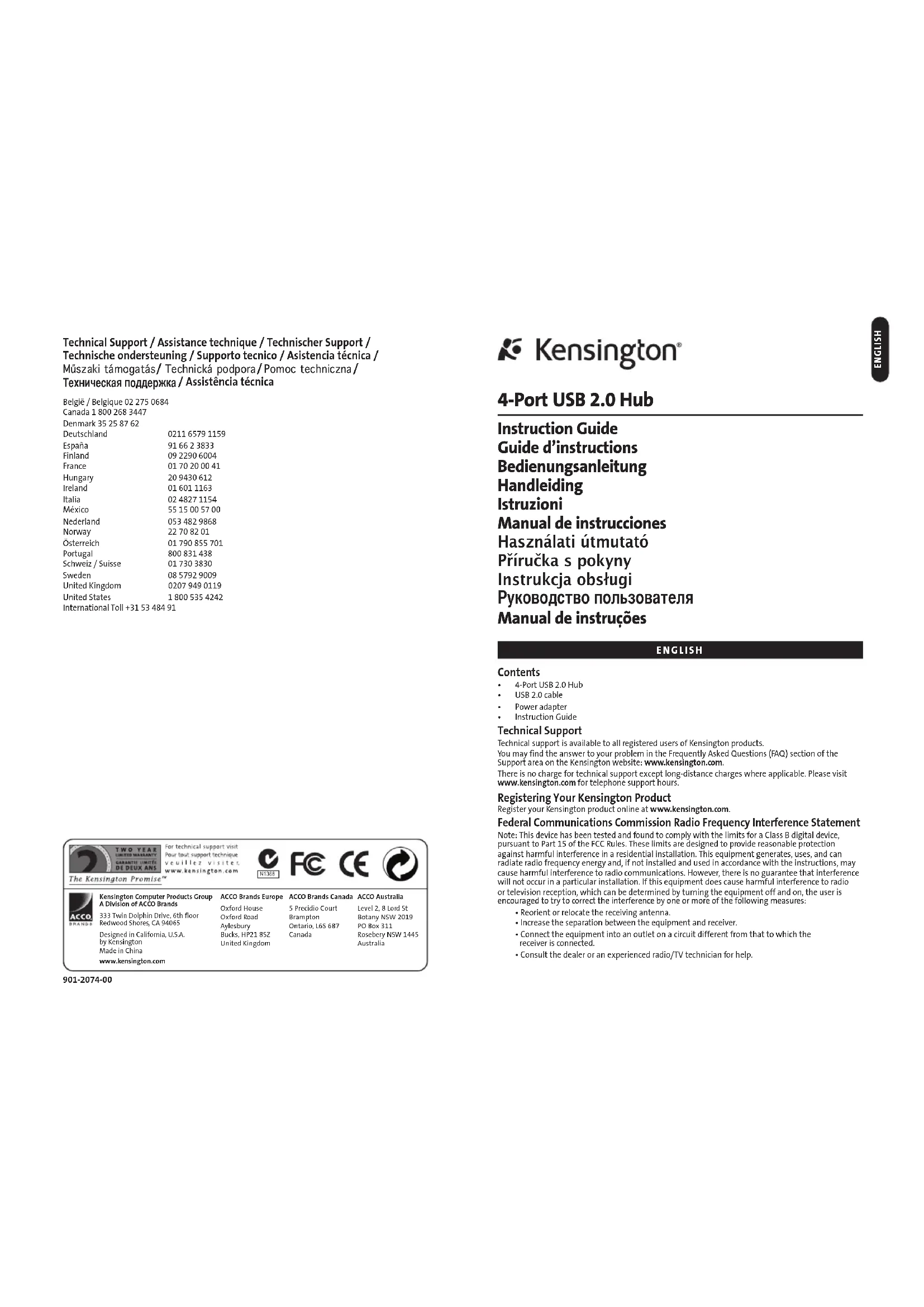 - Guide d’instructions Assistance technique Une assistance technique est disponible pour tous les utilisateurs de produits Kensington enregistrés. L’assistance technique est gratuite, hors coût d’appel téléphonique. Les coordonnées de l’assistance technique sont disponibles au dos de ce manuel. Vous trouverez peut-être la réponse à votre problème dans la section Foire aux Questions (FAQ) de la rubrique Assistance du site Web de Kensington à l’adresse : www.kensington.com. Enregistrement de votre produit Kensington Enregistrez votre produit Kensington en ligne à l’adresse www.kensington.com. Déclaration de la Commission fédérale des communications (FCC) sur l’interférence des fréquences radio Ce périphérique a été "testé et déclaré conforme aux limitations s’appliquant aux périphériques numériques de classe B, conformément à l’article 15 de la réglementation de la FCC. Ces restrictions ont pour but d’offrir une protection raisonnable contre toute interférence nuisible dans une installation résidentielle. Cet appareil peut produire, utiliser et émettre des fréquences radio. S’il n’est pas installé ni utilisé conformément aux instructions, il risque d’engendrer des interférences nuisibles aux communications radio. Tout risque d’interférences ne peut toutefois pas être entièrement exclu. Si cet équipement provoque des interférences avec la réception de la radio ou de la télévision (à déterminer en allumant puis éteignant l’équipement), vous êtes invité à y remédier en prenant une ou plusieurs des mesures citées ci-dessous :