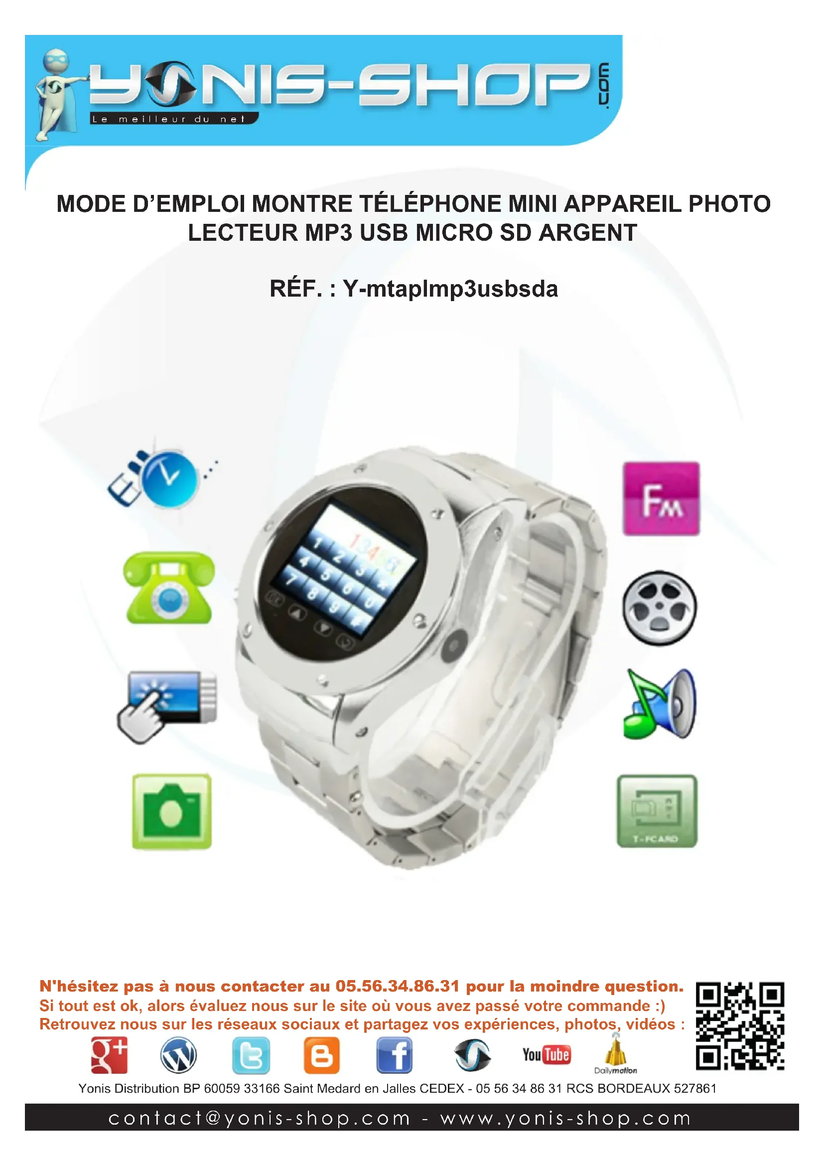 Le meilleur d u net Yonis Distribution BP 60059 33166 Saint Medard en Jalles CEDEX - 05 56 34 86 31 RCS BORDEAUX 527861 conta ct@yonis-shop .com - www. y onis-shop .com Si tout est ok, alors évaluez nous sur le site où vous avez passé votre commande :) Retrouvez nous sur les réseaux sociaux et partagez vos expériences, photos, vidéos : N'hésitez pas à nous contacter au 05.56.34.86.31 pour la moindre question. MODE D’EMPLOI MONTRE TÉLÉPHONE MINI APPAREIL PHOTO